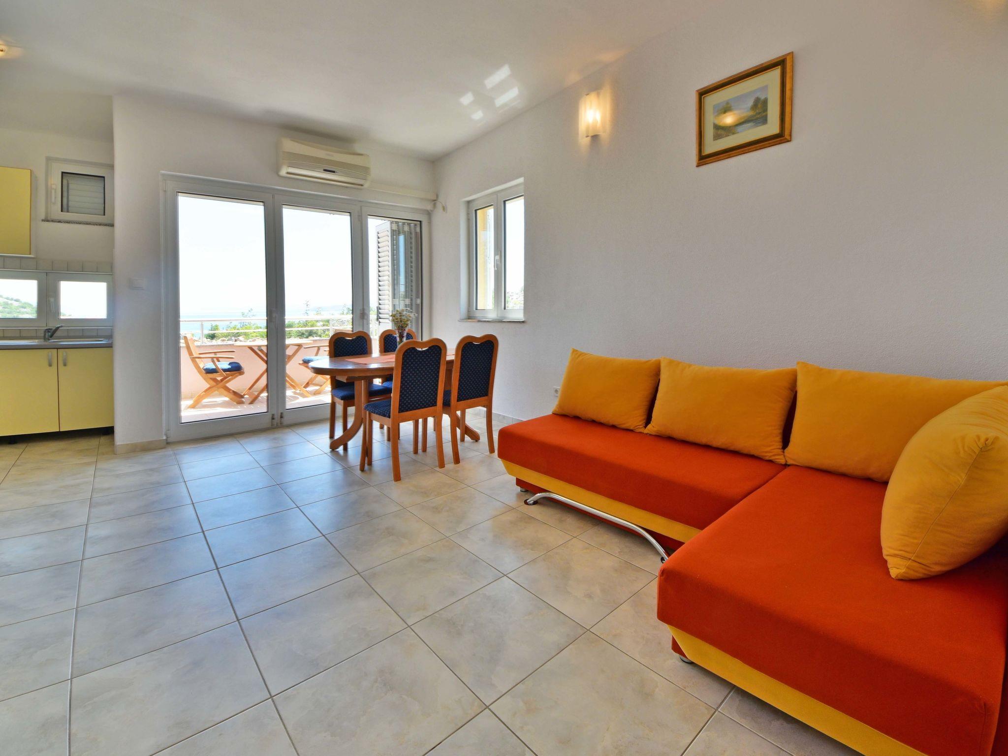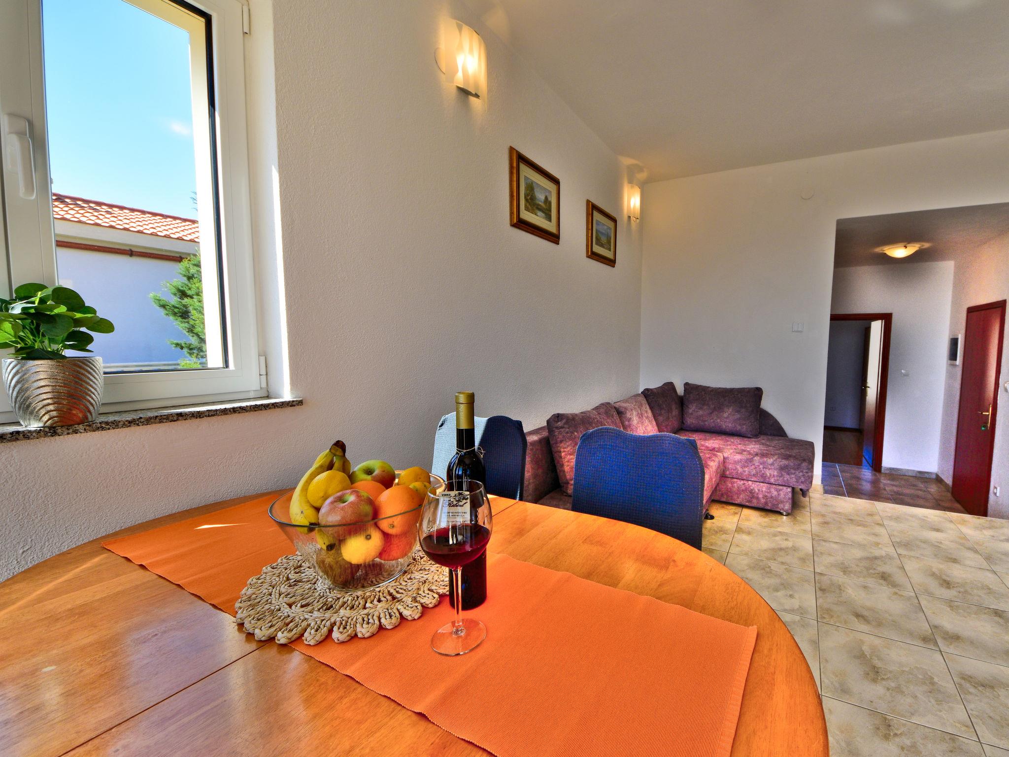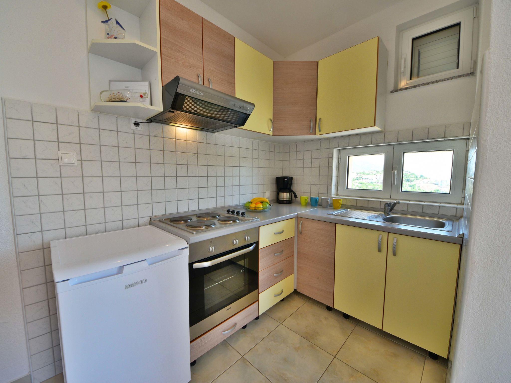 2-Zimmer-Wohnung 40 m2 im 1. Stock, Südostlage. Wohn-/Esszimmer 20 m2 mit 1 Doppeldiwanbett (140 cm, Länge 200 cm), Sat-TV (Flachbildschirm), Klimaanlage. Ausgang zum Balkon. 1 Zimmer mit 1 franz. Bett (160 cm, Länge 200 cm). Ausgang zum Balkon. Offene Küche (4 Kochplatten, Backofen). Dusche/WC, Hydromassage-Dusche. Keine Heizmöglichkeit. Balkon 6 m2, kleiner Balkon 2 m2. Balkonmöbel. Fernsicht auf das Meer. Zur Verfügung: Internet (WLAN, gratis). Parkplatz (1 Auto).