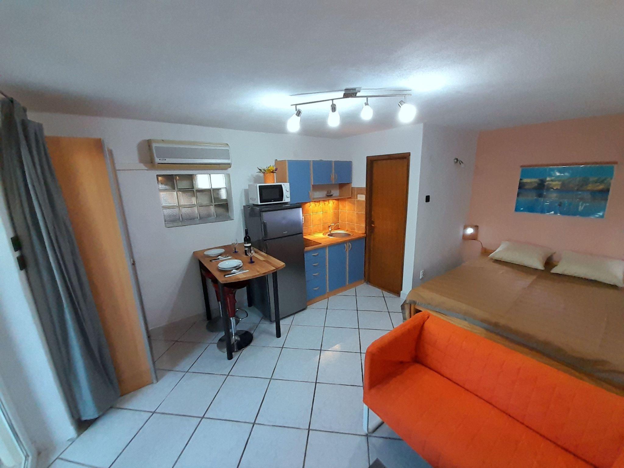 Das 34 m² große Studio liegt im Erdgeschoss und bietet Platz für zwei Personen. Es verfügt über ein separates Badezimmer mit Dusche sowie ein Doppelbett (160 x 200 cm). Des Weiteren gibt es ein Sofa, einen Tresen mit zwei Hockern, an dem man essen kann sowie die kleine Küche, die mit zwei Kochplatten, Kühlschrank, Mikrowelle, Kaffeemaschine und Wasserkocher ausgestattet ist.