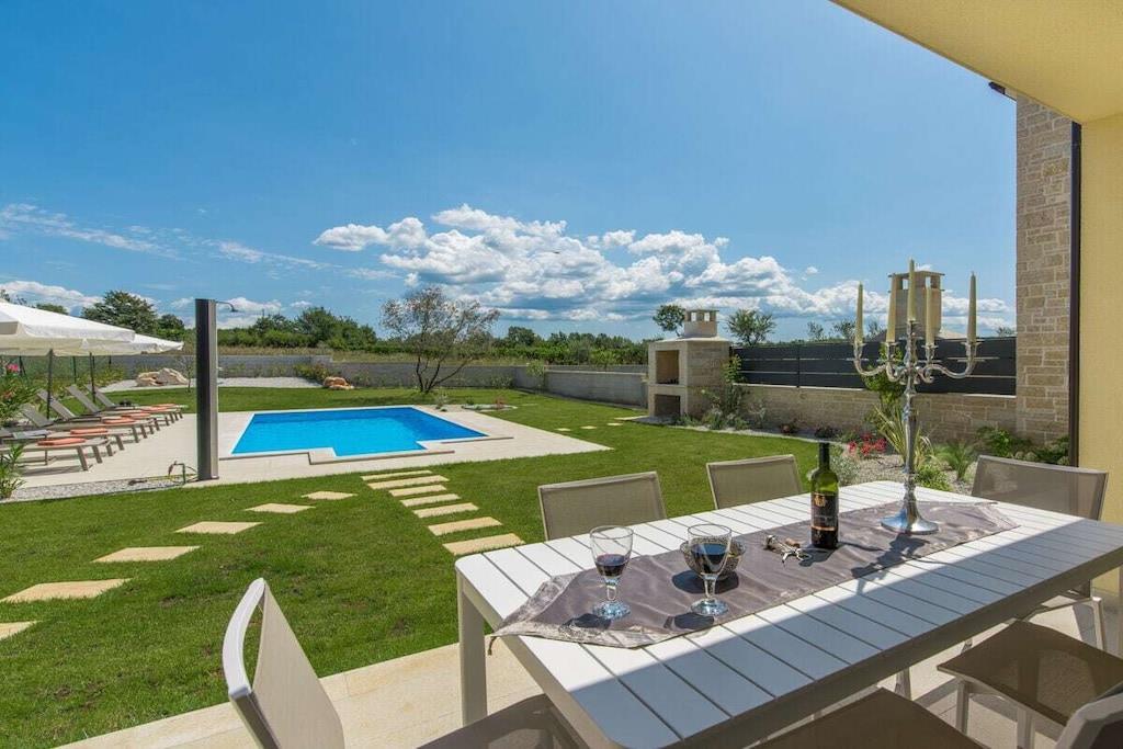 Das Ferienhaus liegt in der Gemeinde Kastelir – Labinci in der Nähe von Porec. Da die Gemeinde auf einem Hügel liegt, hat man einen sehr schönen Blick zur Adria. Die Villa wurde mit einem italienischen Designer hochwertig eingerichtet.