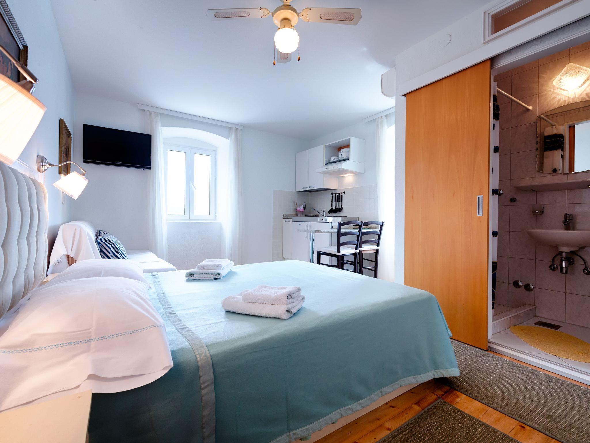 Studio bietet Platz für 3 Gäste. Die Betten sind in Schlafzimmern, die es 1 gibt, innerhalb einer Gesamtfläche von 19m2, angeordnet. Das Studio-Apartment bietet Meerblick. In der Unterkunftseinheit besteht die Möglichkeit des Mitbringens von Haustieren gegen Aufpreis. Die reservierte Unterkunftseinheit verfügt über einen gemeinsamen Balkon. Die reservierte Unterkunftseinheit verfügt über einen gemeinsame Terrasse. IM PREIS INBEGRIFFEN: Kurtaxe, Endreinigung, Klimatisierung, Internet, Bügeleisen, Bügelbrett, Föhn. VERBINDLICHE ZUSÄTZLICHE KOSTEN: Aufzahlung für Kurzaufenthalte (prozentualer Zuschlag pro Nächtigungsanzahl: 30% - 1, 20% - 2, 10% - 3). UNVERBINDLICHE ZUSÄTZLICHE KOSTEN: Haustiere (3,00 € pro Nacht). Die Verfügbarkeit zusätzlicher Dienstleistungen in Ihrem reservierten Termin und die Preise derselben (falls nicht aufgeführt) müssen im Voraus überprüft werden. Zusätzliche Dienstleistungen die in der Zahlungsaufforderung nicht aufgeführt sind werden direkt beim Vermieter bezahlt, angenommen der Gast nutzt auch diese.