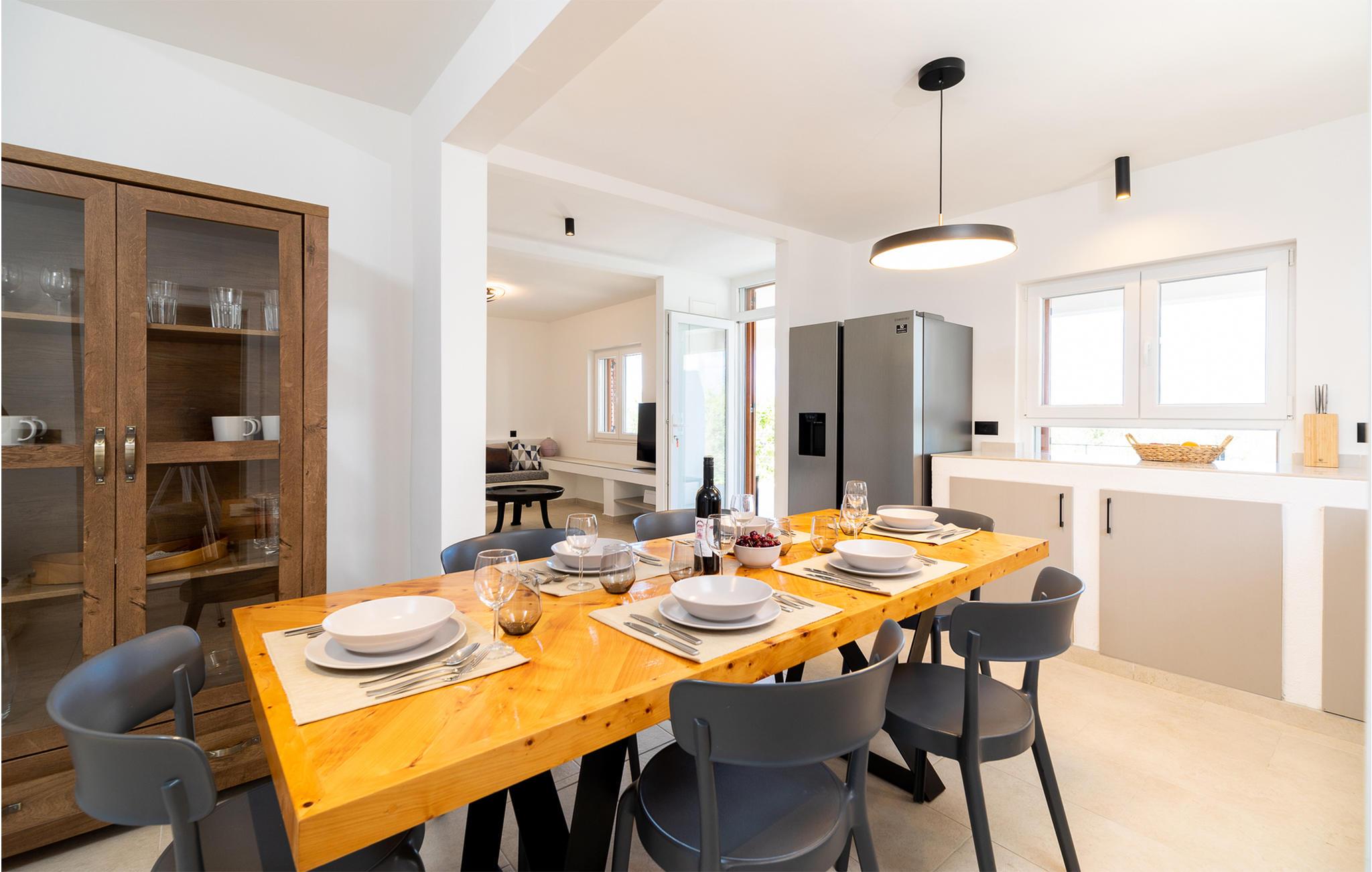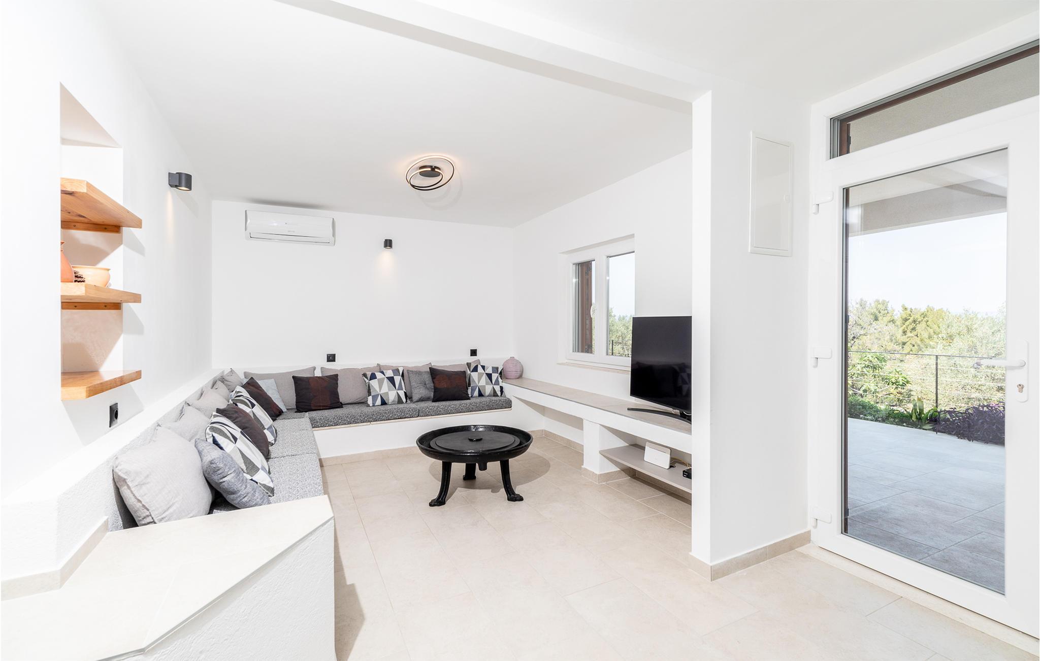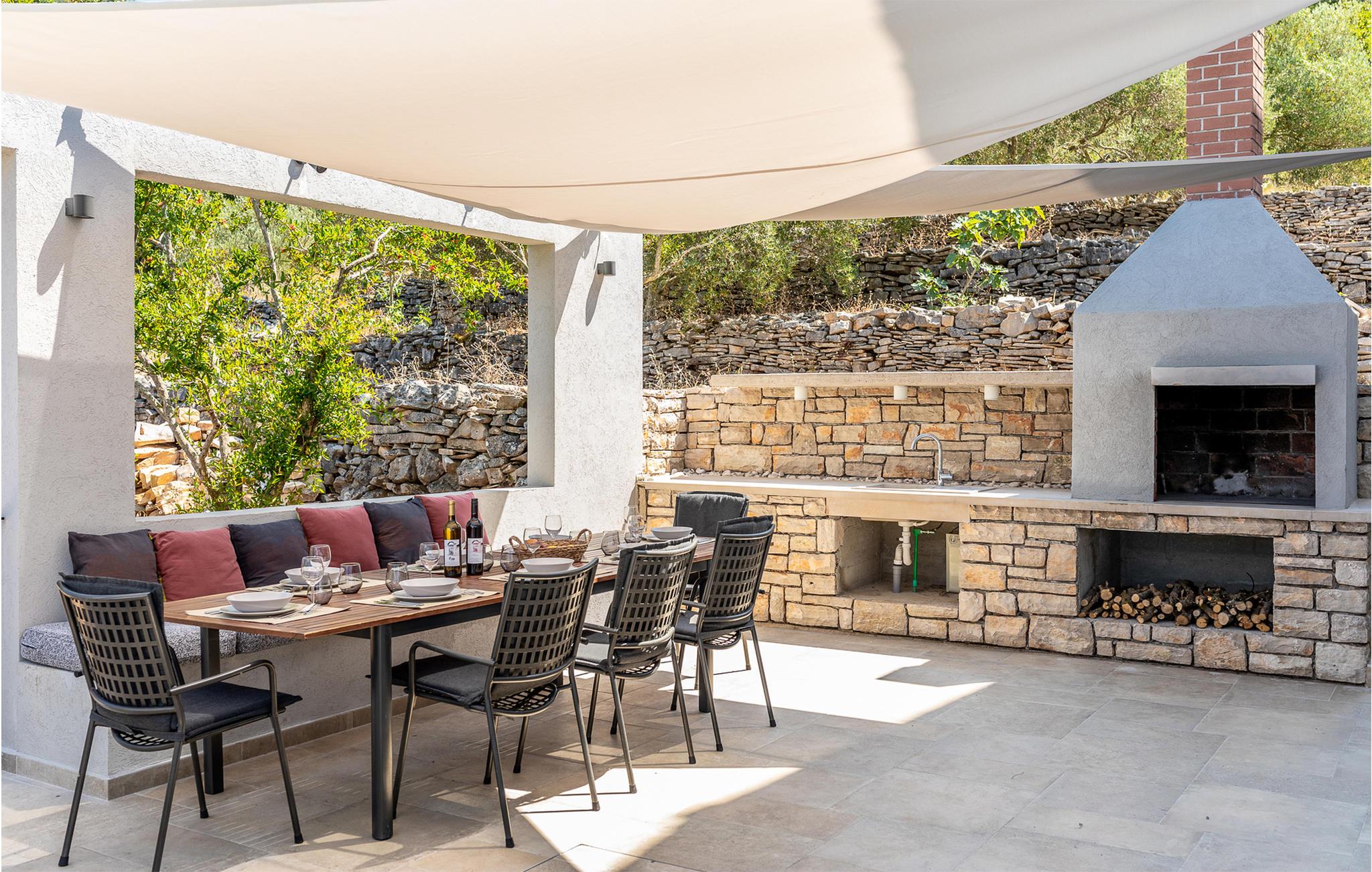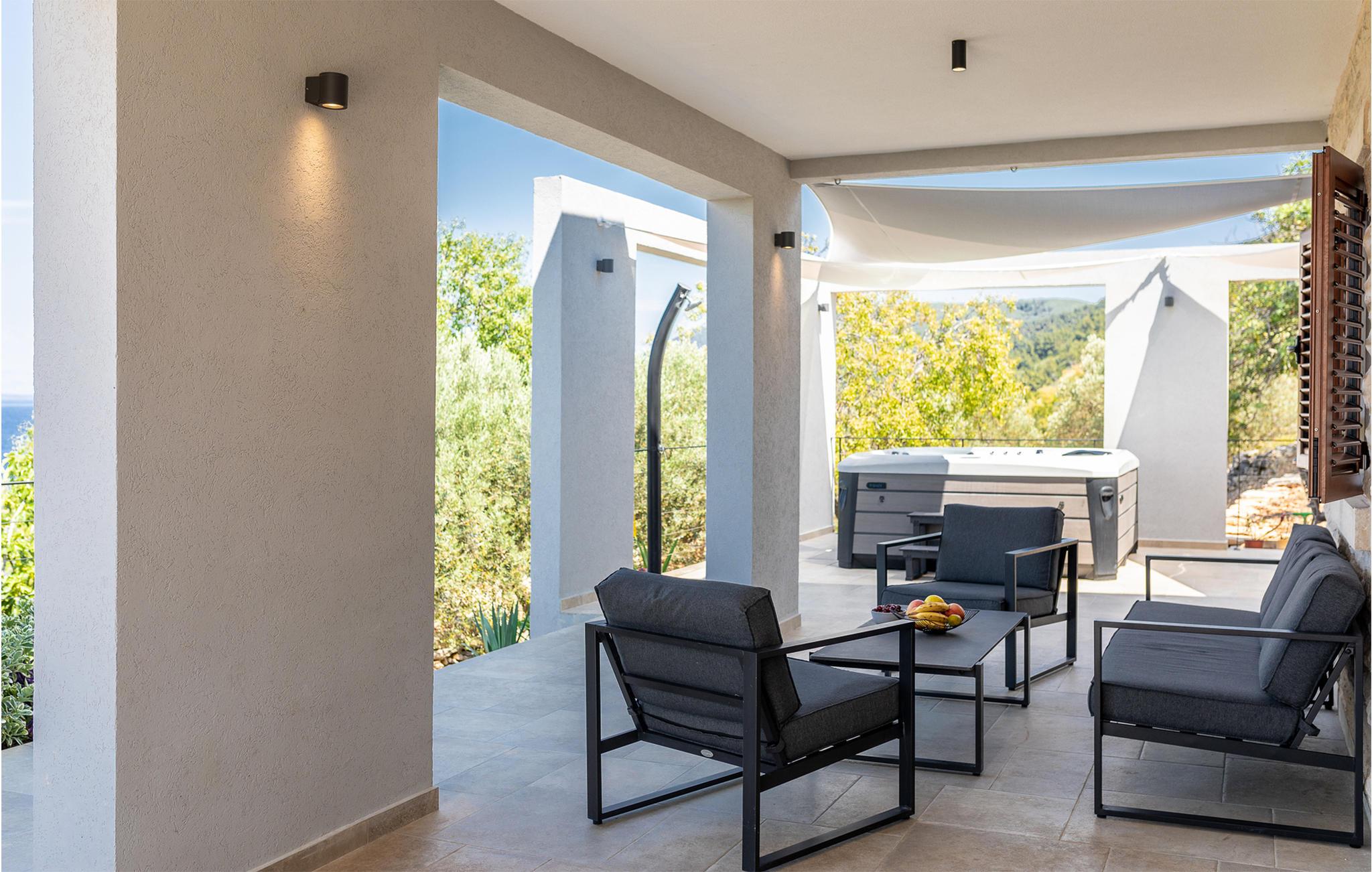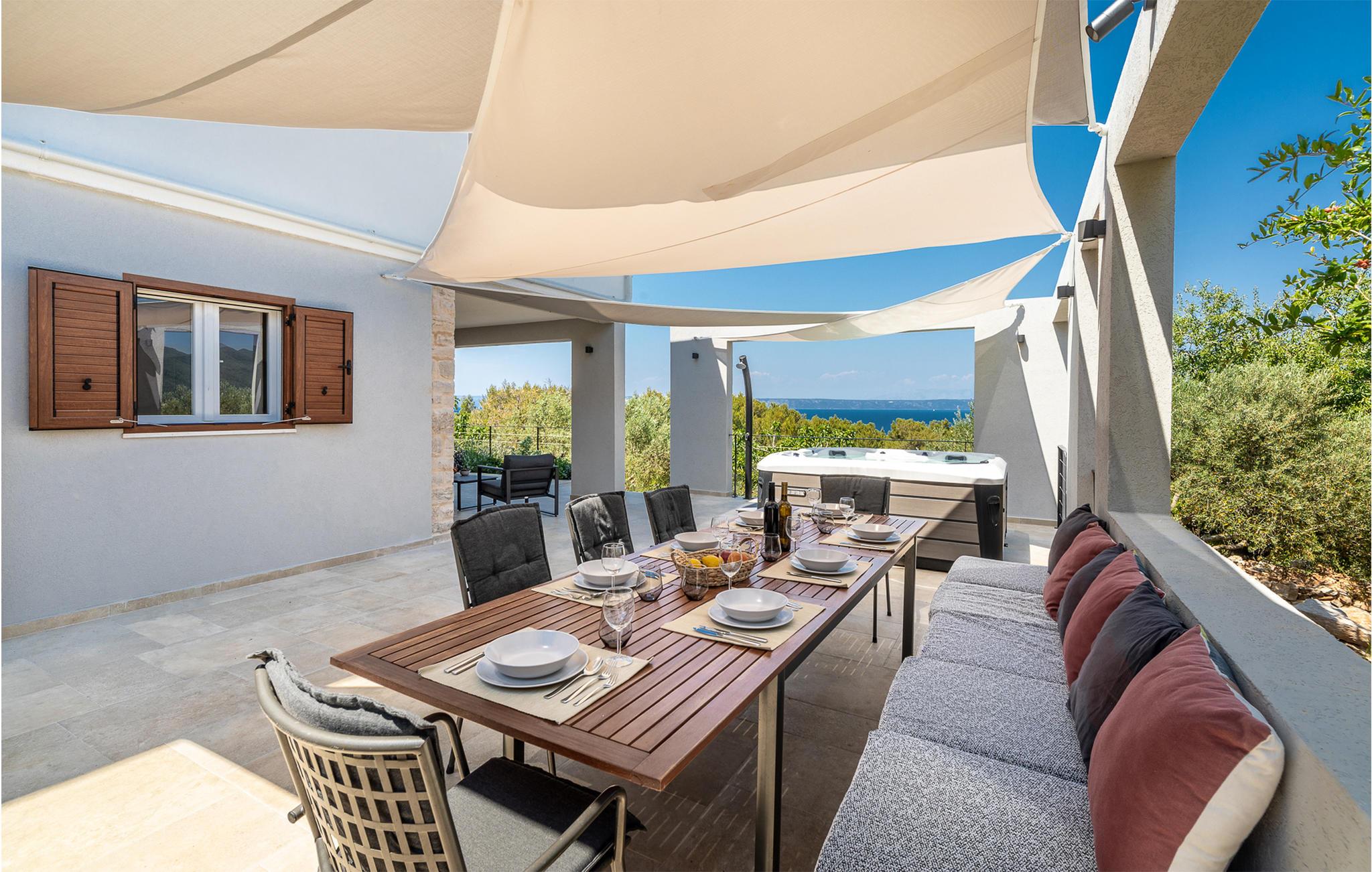 Im Erdgeschoss befinden sich Wohnzimmer, Küche und zusätzliche Toilette, während Innentreppen zum ersten Stock führen, in dem drei Schlafzimmer, zwei Bäder und eine überdachte Terrasse mit Meerblick sind. Im Außenbereich erwarten Sie eine überdachte Terrasse mit guten Gartenmöbeln sowie eine offene Terrasse mit Grill und Whirlpool. Da das Grundstück ca. 40.000 m² groß ist und der nächste Nachbar etwa 500 m entfernt ist, genießen Sie hier absolute Privatsphäre und Ruhe. Nach dem Überqueren der lokalen Straßen können Sie das gesamte Grundstück bis zum Meer mitbenutzen. Ein kleiner Weg führt zum Meer und eine Badestelle, die mit Pinienbäumen umgeben ist. Dies ist ein idealer Ort zum Angeln, an dem jedes Jahr von der Küste aus Angelwettbewerbe organisiert werden. Wenn Sie interessiert sind, haben Sie die Möglichkeit, von einem Boot aus zu angeln oder Ausflüge zu den nahe gelegenen Inseln Hvar und Scedro zu unternehmen.