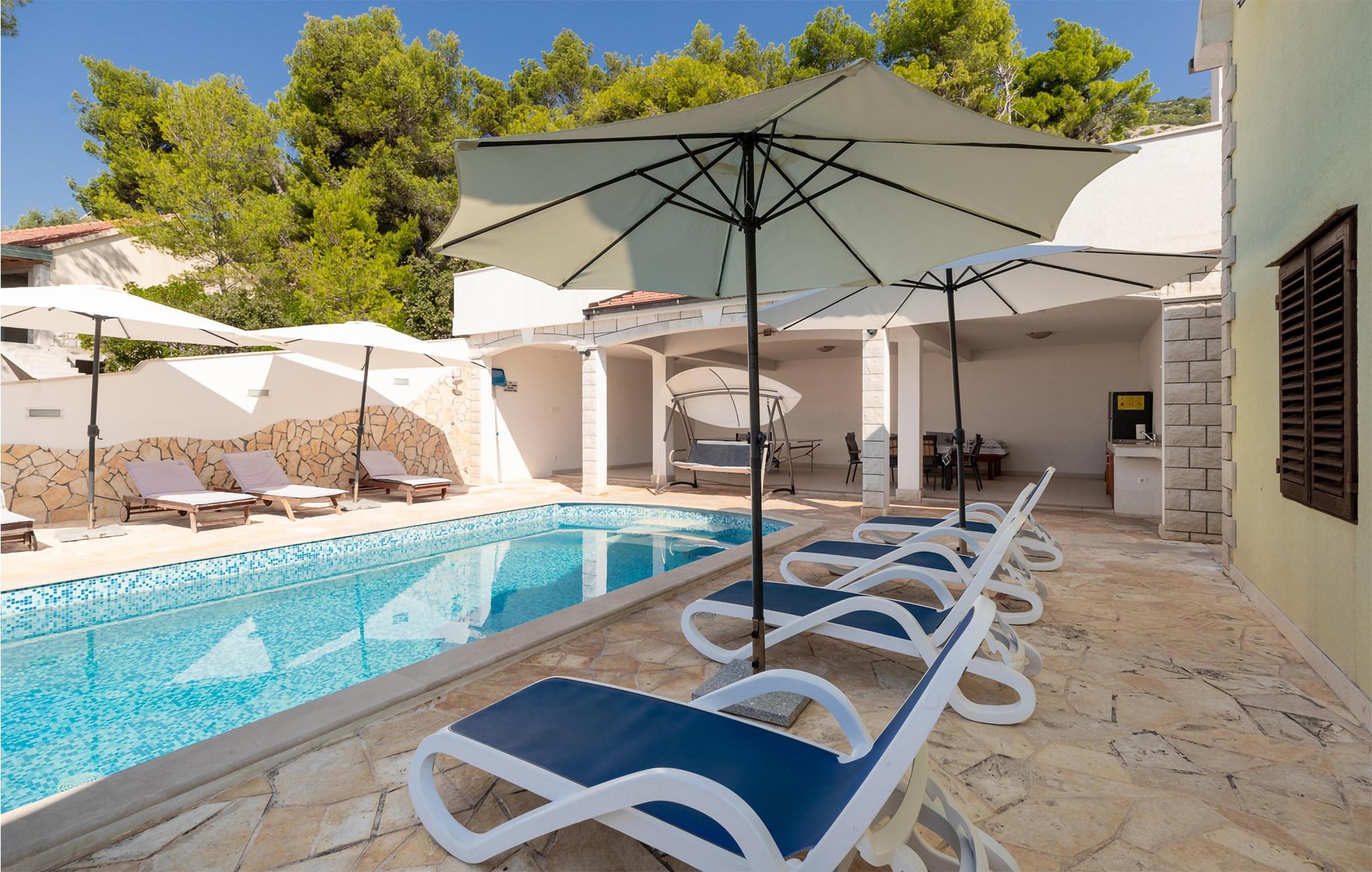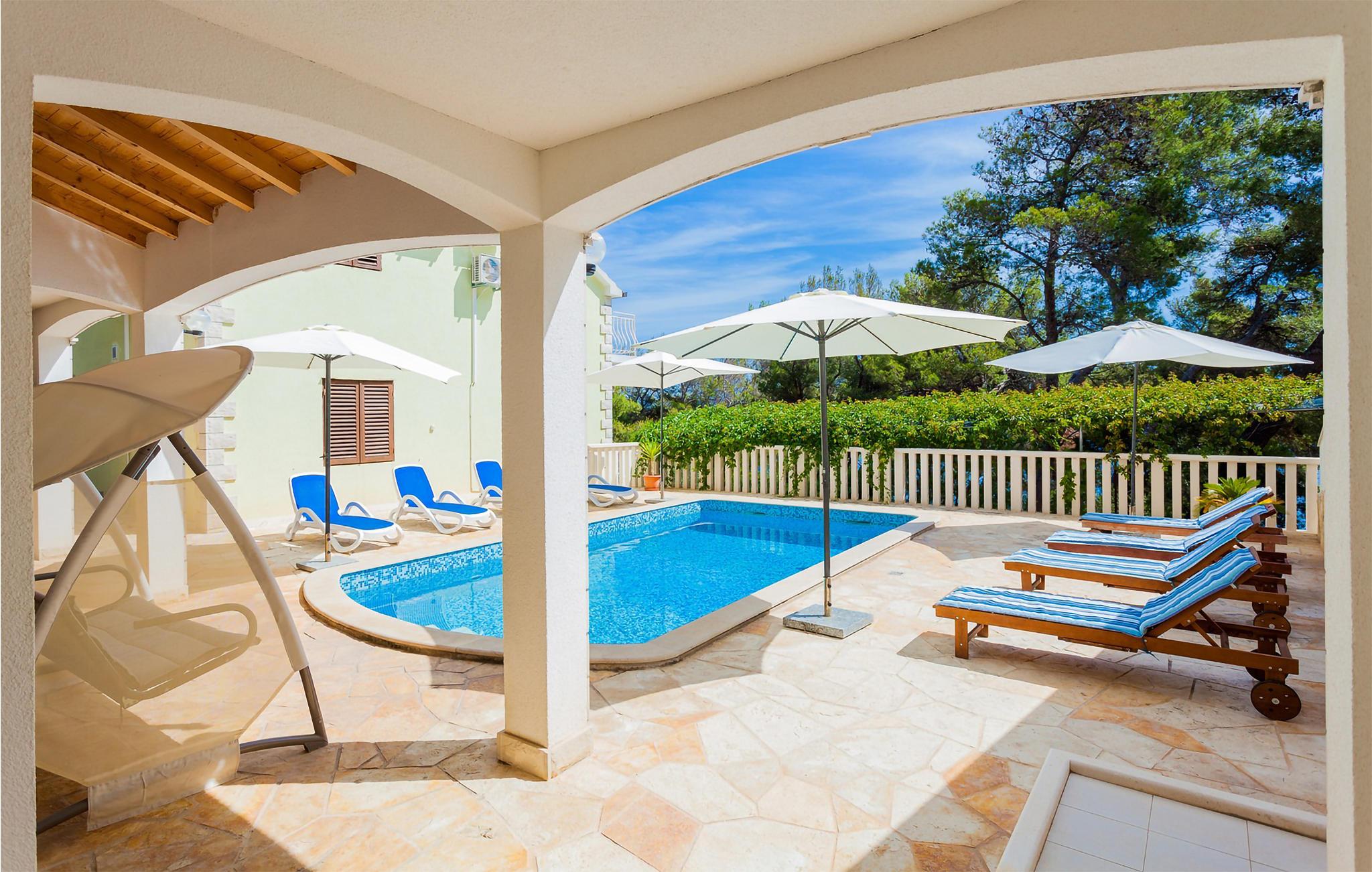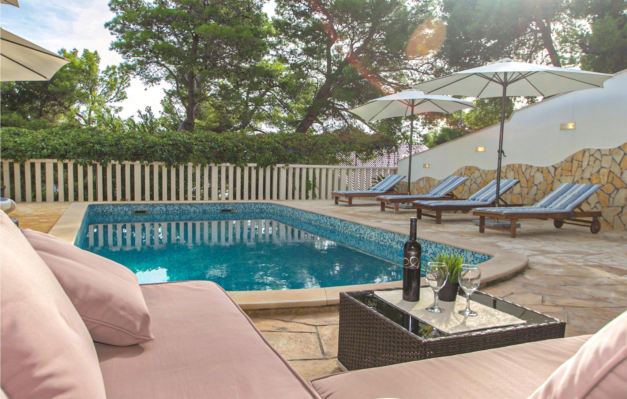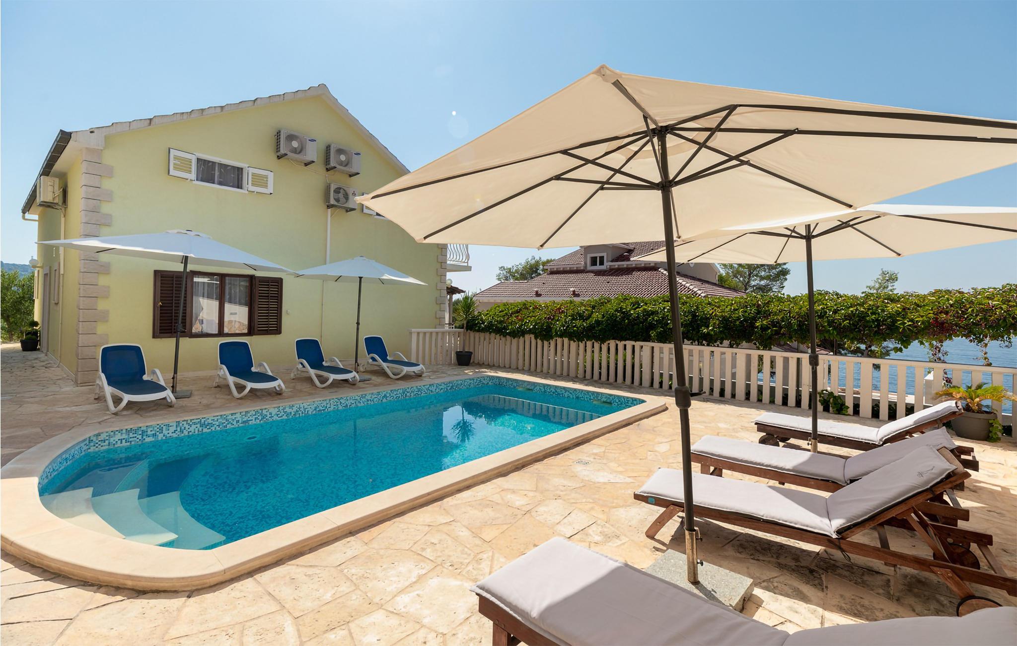 Möchten Sie Ihren Urlaub in einem Poolferienhaus in einer unglaublichen Lage verbringen? Dieses helle und modern eingerichtete Ferienhaus ist von Pinienbäumen und mediterranen Pflanzen umgeben. Nur wenige Schritte trennen Sie vom Meer an der Südküste der Insel Korcula. Im Erdgeschoss liegen zwei Schlafzimmer und zwei Badezimmer, während Sie im Dachgeschoss zwei weitere Bäder und drei Schlafzimmer finden. Die Poolterrasse bietet Ihnen noch eine Miniküche, Tischtennis, Grill und Gartenmöbel. Eine Ecke nur für Kinder, mit einem Trampolin und einer Rutsche, liegt auch auf dem Grundstück. Die überdachte Dachgeschossterrasse bietet Ihnen eine herrliche Aussicht. Nur fünf Autominuten vom Haus befinden sich einige kinderfreundliche Kiesstrände.