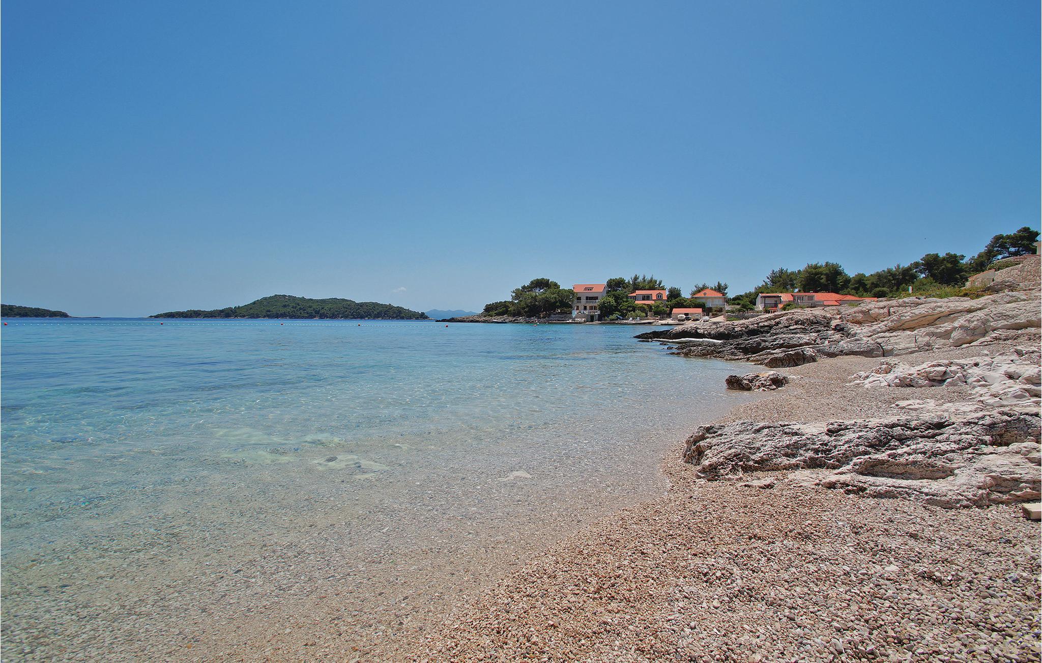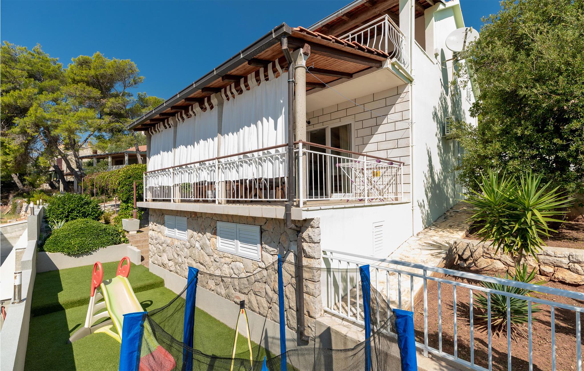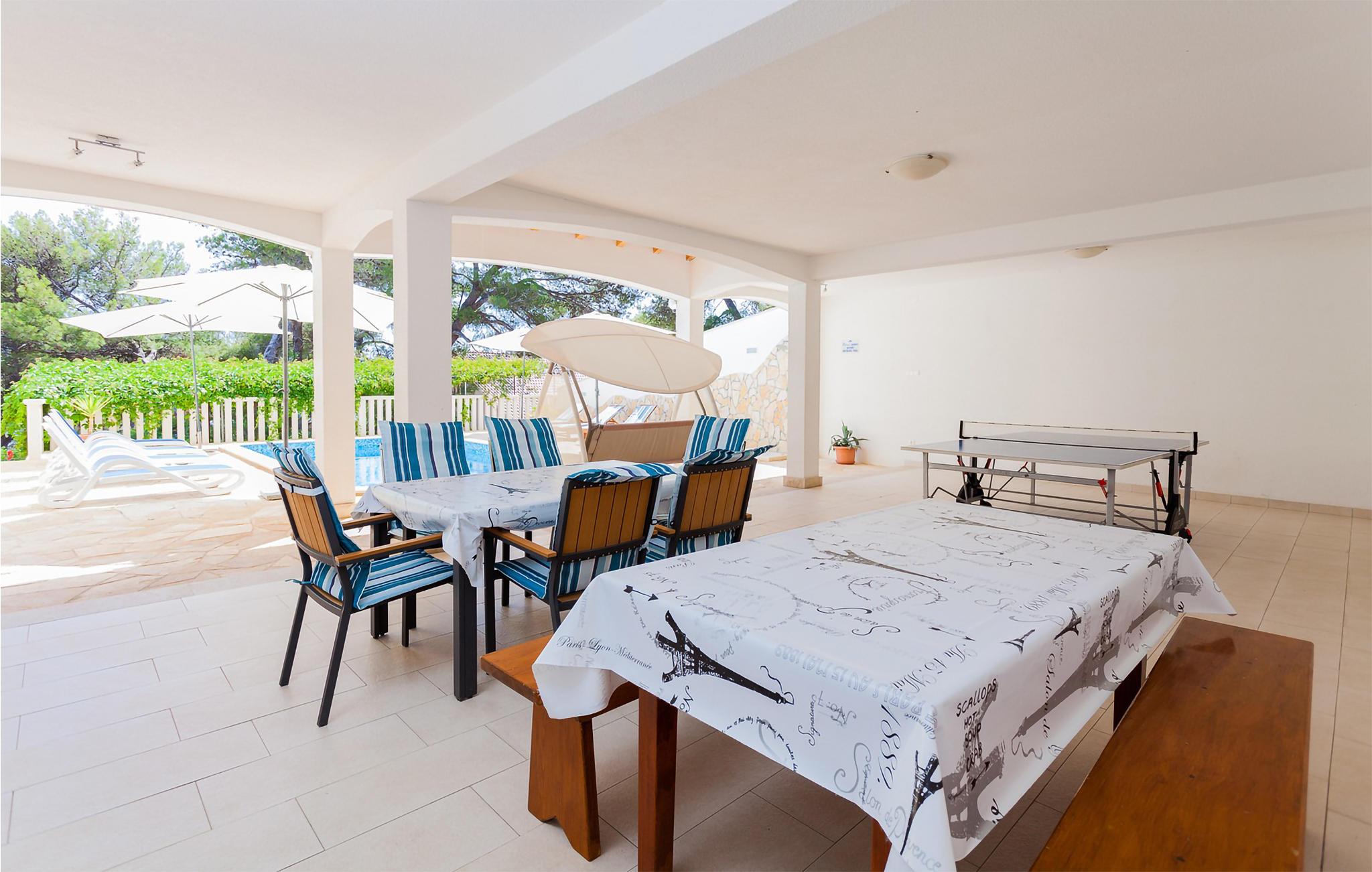 Möchten Sie Ihren Urlaub in einem Poolferienhaus in einer unglaublichen Lage verbringen? Dieses helle und modern eingerichtete Ferienhaus ist von Pinienbäumen und mediterranen Pflanzen umgeben. Nur wenige Schritte trennen Sie vom Meer an der Südküste der Insel Korcula. Im Erdgeschoss liegen zwei Schlafzimmer und zwei Badezimmer, während Sie im Dachgeschoss zwei weitere Bäder und drei Schlafzimmer finden. Die Poolterrasse bietet Ihnen noch eine Miniküche, Tischtennis, Grill und Gartenmöbel. Eine Ecke nur für Kinder, mit einem Trampolin und einer Rutsche, liegt auch auf dem Grundstück. Die überdachte Dachgeschossterrasse bietet Ihnen eine herrliche Aussicht. Nur fünf Autominuten vom Haus befinden sich einige kinderfreundliche Kiesstrände.