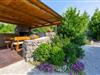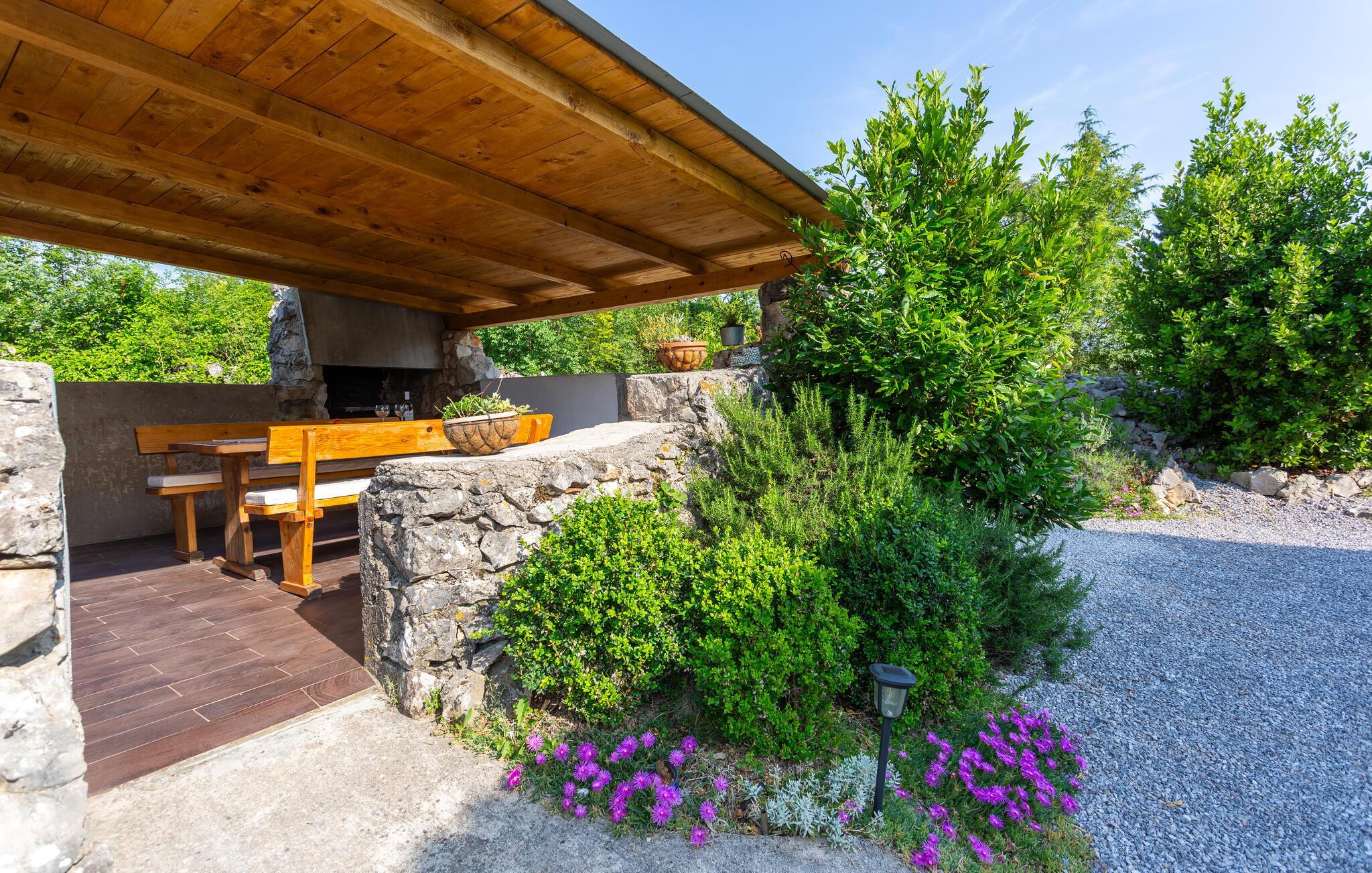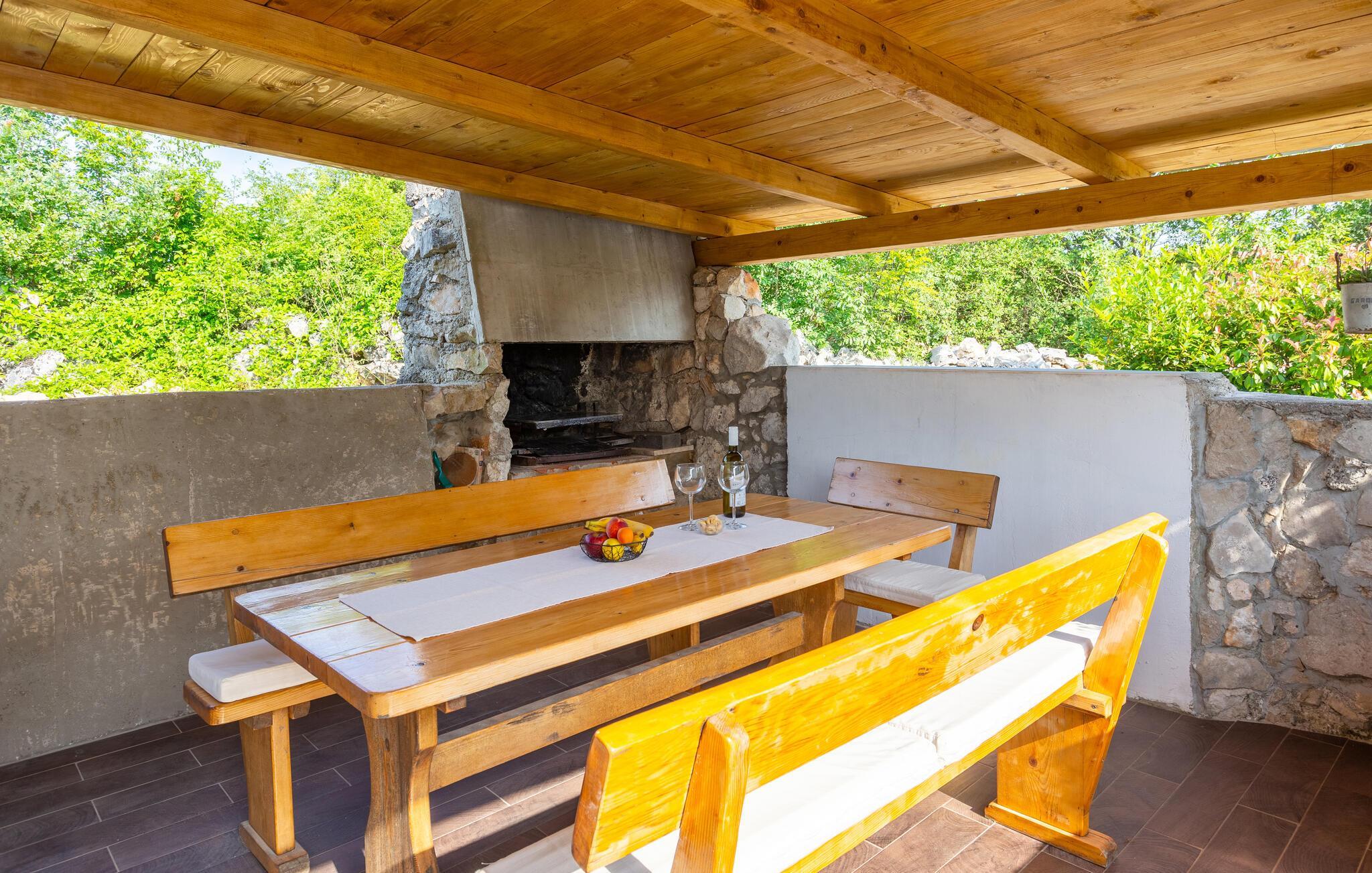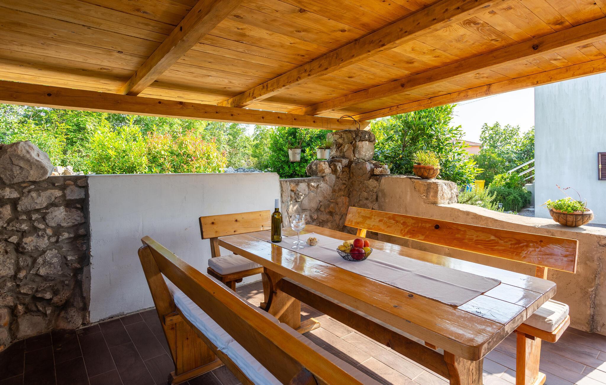 Willkommen auf Krk. Hier erwartet Sie ein ruhiger und entspannender Ferienhausurlaub in Meernähe, fernab vom hektischen Alltag. Schlafen Sie erst einmal aus und genießen Sie dann ein üppiges Frühstück am Küchentisch oder an dem charmanten Holztisch auf der überdachten Terrasse. So beginnt ein perfekter Urlaubstag. Hier finden Sie auch einen gemauerten Grill, ideell für ein schönes BBQ am Abend. Und genießen Sie die imposante Aussicht auf das blaue Meer von der oben liegenden Terrasse aus.