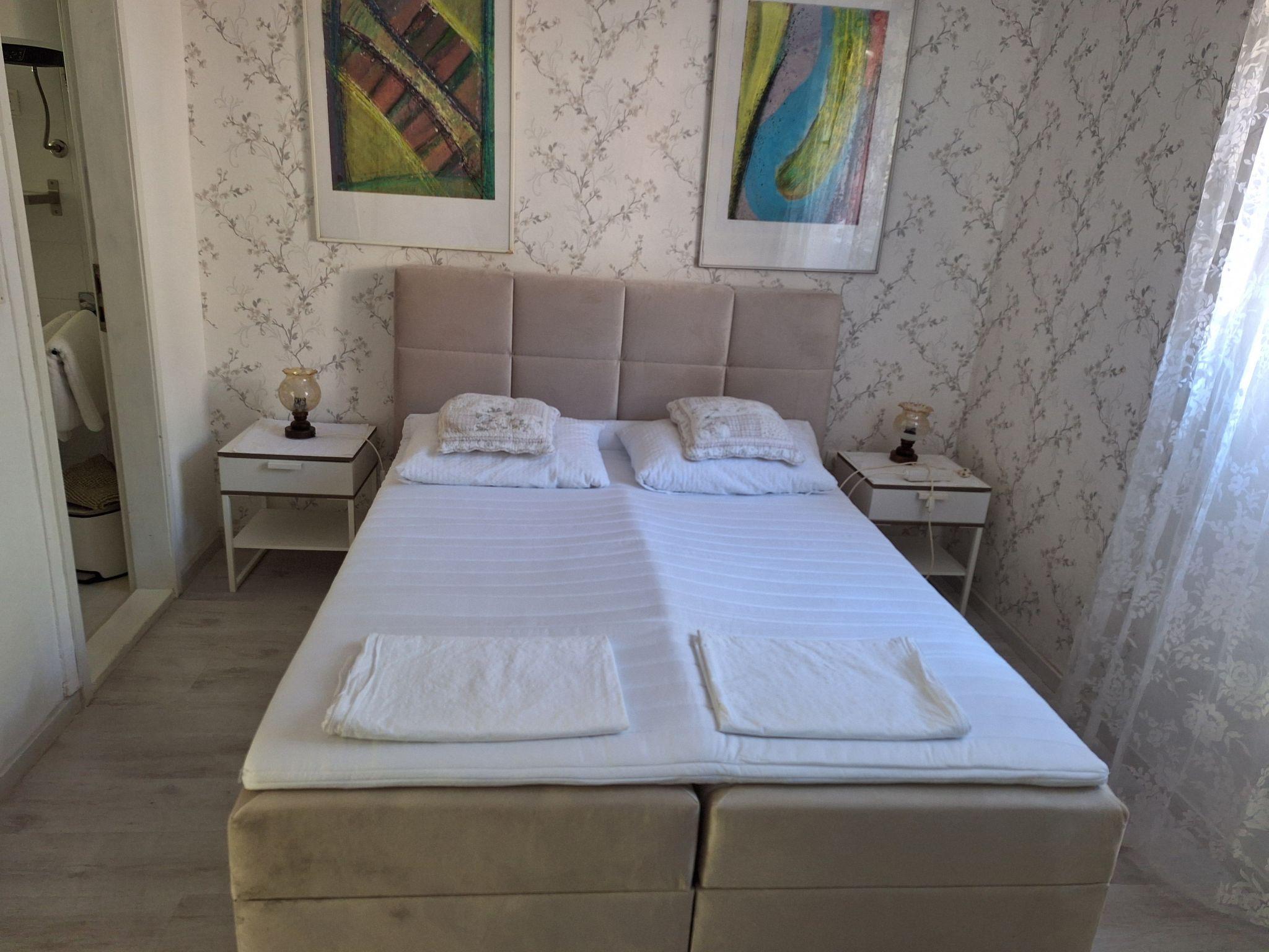 Innen verfügt die Wohnung über ein einladendes Schlafzimmer mit einem komfortablen Doppelbett, das sich ideal für eine erholsame Nacht nach einem ereignisreichen Tag eignet. Das Zimmer lässt sich komplett abdunkeln, sodass Sie Ihren Schlaf nach Belieben regulieren können. Eine gut ausgestattete Küche mit einem Gasherd, einer Mikrowelle, einem Wasserkocher sowie verschiedenen Kaffeemaschinen, darunter Espressokanne, Filter-Kaffeemaschine, Kapsel- und Pads-Kaffeemaschine, ermöglicht es Ihnen, sowohl morgens als auch abends Ihre kulinarischen Fähigkeiten auszuleben. Ergänzt wird das Interieur durch eine Klimaanlage, die für angenehme Temperaturen in allen Räumen sorgt, und einen Fernseher für gemütliche Abende.