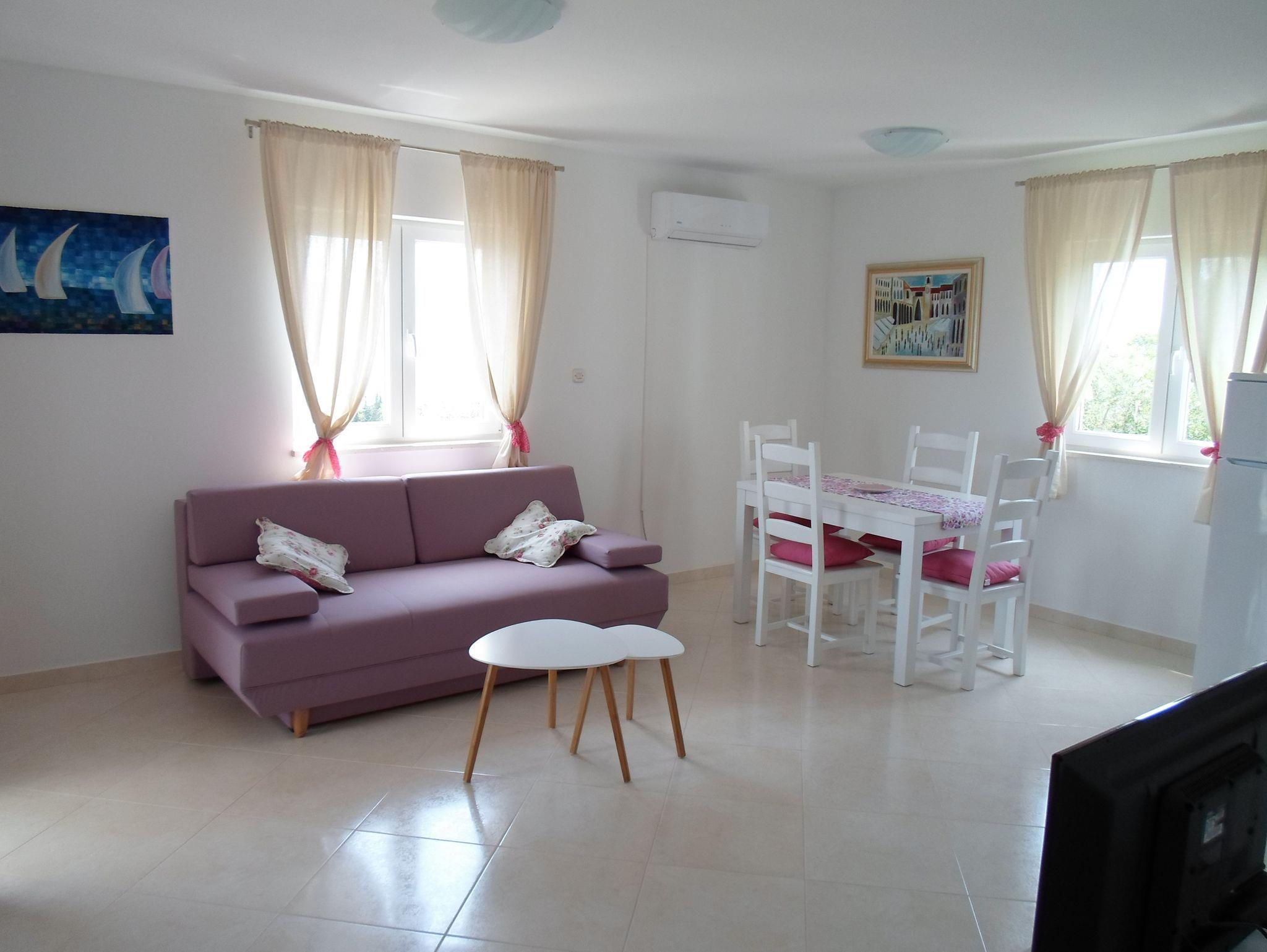 Ferienwohnung bietet Platz für 4 Gäste. Die Betten sind in Schlafzimmern, die es 1 gibt, und in Wohnzimmer, innerhalb einer Gesamtfläche von 40m2, angeordnet. Die Gäste haben einen eigenen Balkon zur Verfügung, auf der sie in warmen Sommernächten genießen können. Das Apartment bietet Meerblick. Es ist erlaubt, Speisen auf dem Gemeinschafts-Grill vorzubereiten. In der Unterkunftseinheit besteht die Möglichkeit des Mitbringens von Haustieren, und die Dienstleistung ist im Preis der Unterkunft enthalten. IM PREIS INBEGRIFFEN: Kurtaxe, Endreinigung, Klimatisierung, Parkplatz, Internet, Wäschewaschen, Haustiere, Kinderbett, Bügeleisen, Bügelbrett, Föhn, tragbarer Grill. Die Verfügbarkeit zusätzlicher Dienstleistungen in Ihrem reservierten Termin und die Preise derselben (falls nicht aufgeführt) müssen im Voraus überprüft werden. Zusätzliche Dienstleistungen die in der Zahlungsaufforderung nicht aufgeführt sind werden direkt beim Vermieter bezahlt, angenommen der Gast nutzt auch diese.