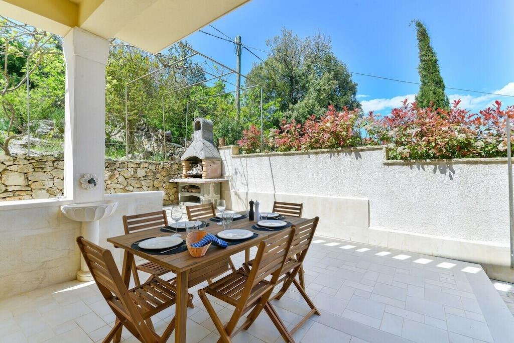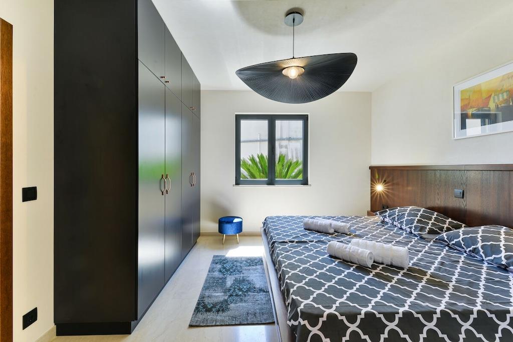 Interieur auf 270m2 erweitert, sondern auch mit einem erstaunlichen Meerblick. Erdgeschoss besteht aus einer voll ausgestatteten Küche mit hochwertigen Geräten, geräumiges Wohnzimmer mit herrlichem Panoramablick auf das Meer und Ausgang zur Terrasse, Wi-Fi, TV SAT; A/C. Auf dieser Etage befindet sich ein Hauptschlafzimmer mit eigenem Bad und extra Toilette. Auf der ersten Etage finden Sie 3 geräumige Schlafzimmer mit einem Doppelbett, eigene Bäder und Balkon mit herrlichem Meerblick. Alle Schlafzimmer sind klimatisiert. Die zweite überdachte Terrasse befindet sich auf der Rückseite des Hauses mit einem Essbereich im Freien und einer Grillstation. Das Anwesen ist komplett eingezäunt mit einem Garten von 1000m2, großen Swimmingpool, Sonnenliegen, Außendusche und einen privaten Parkplatz.