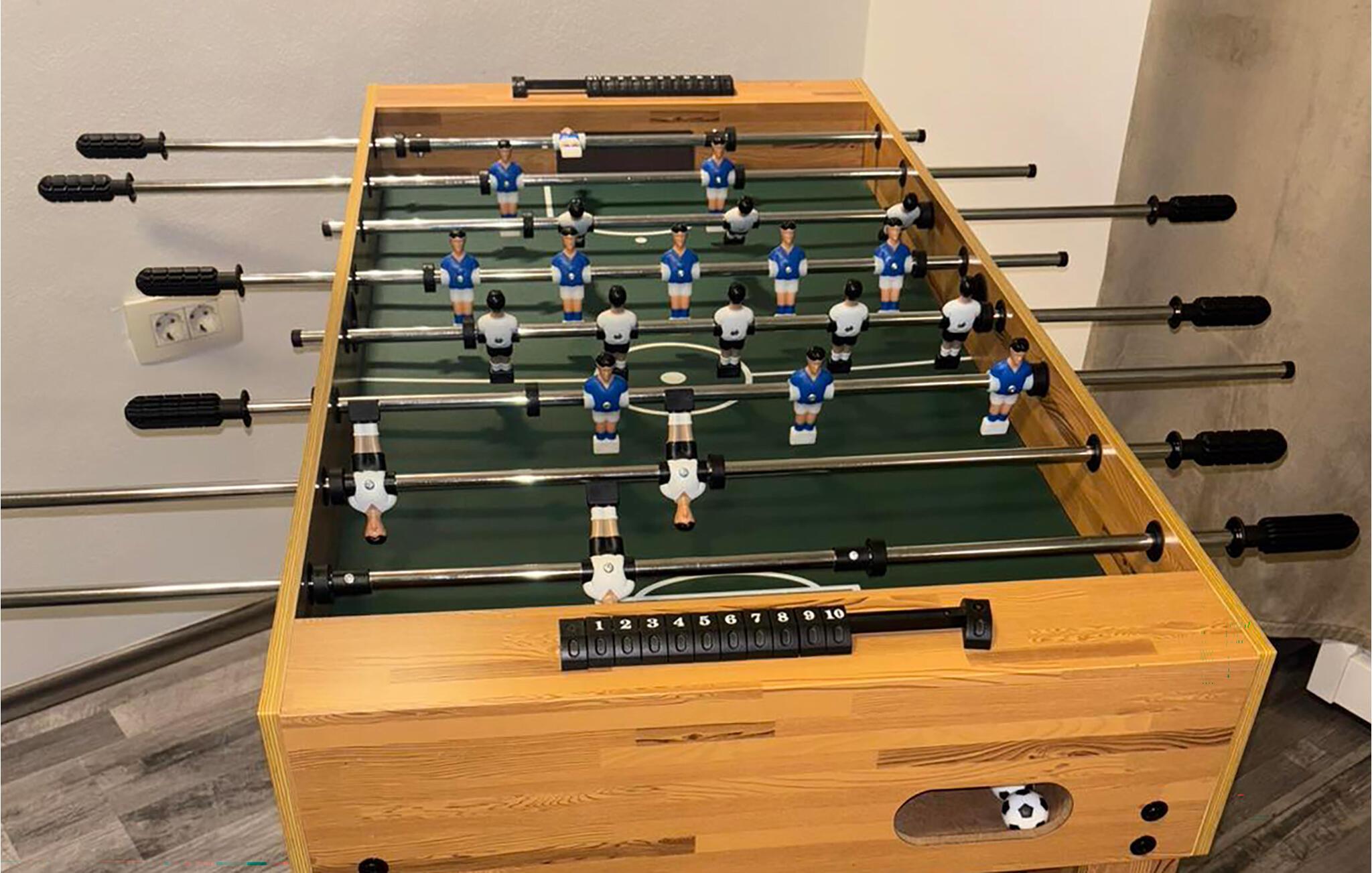 Vom Wohnzimmer aus gibt es einen direkten Ausgang zur Terrasse mit Gartenmöbeln, die sich hervorragend für einen Morgenkaffee oder ein Frühstück eignet. Von dieser Position aus haben Sie auch einen Blick auf den Pool und den Garten, sodass Eltern ihre Zeit genießen können, während die Kinder schwimmen oder spielen, und sie trotzdem im Auge behalten können. Von dort sind es nur wenige Schritte bis zum Garten mit Pool, Sonnenliegen und im Anschluss daran einem Kinderspielplatz in Form einer Rutsche und einer Schaukel.