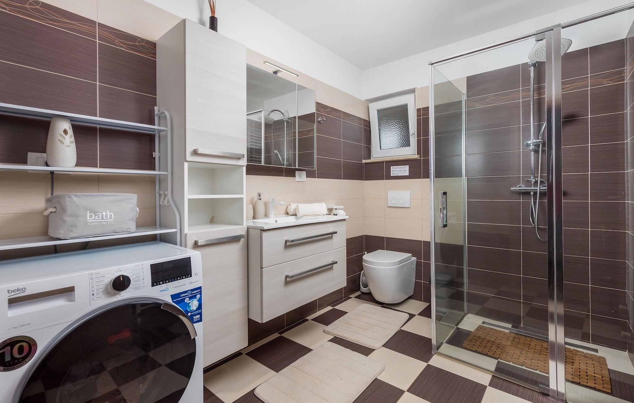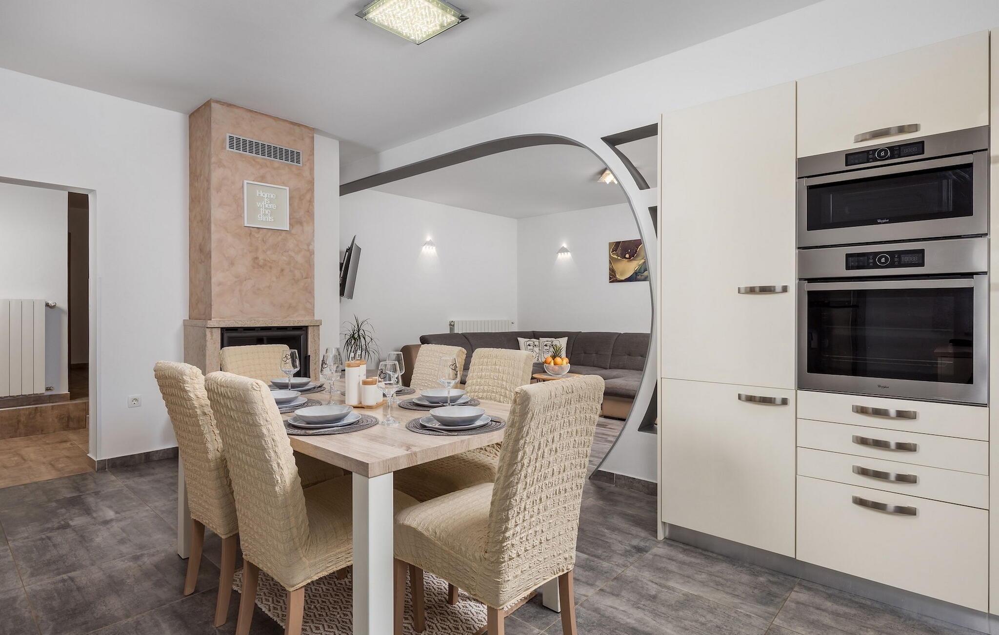 Die Villa besteht aus drei komfortablen, modernen Schlafzimmern mit Klimaanlage und TV sowie zwei separaten Badezimmern. Das moderne Design setzt sich im offenen Grundriss von Wohnzimmer, Küche und Esszimmer fort. In diesem Raum werden Sie von einer Besonderheit in Form des Kamins angenehm überrascht sein, der eine perfekte Lösung für Abende mit etwas kühleren Temperaturen, aber auch einer besonderen Atmosphäre ist.