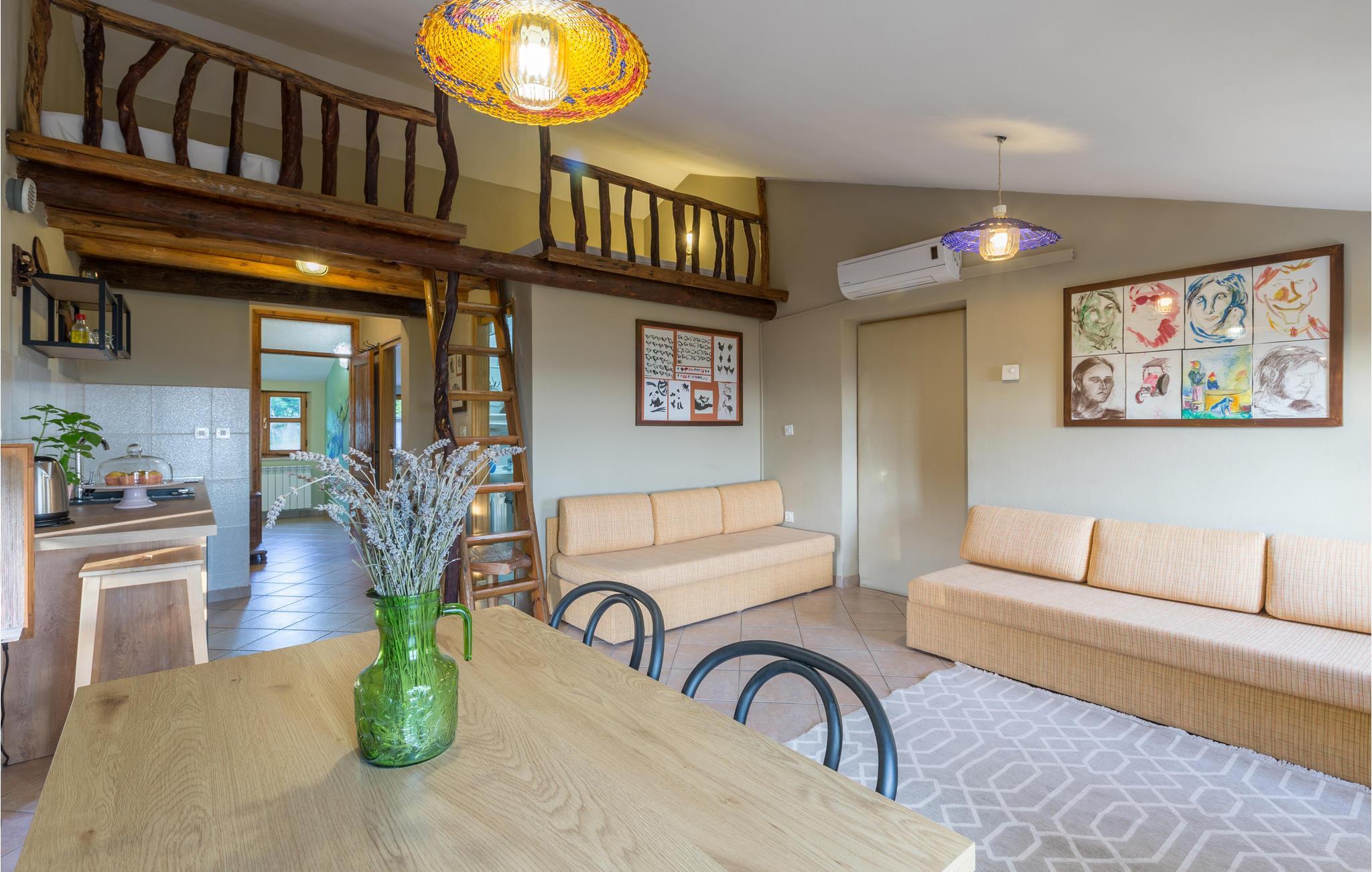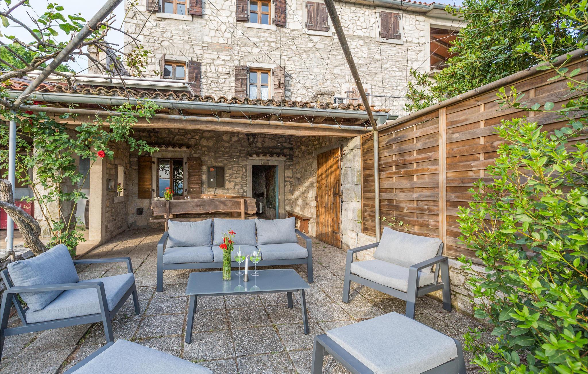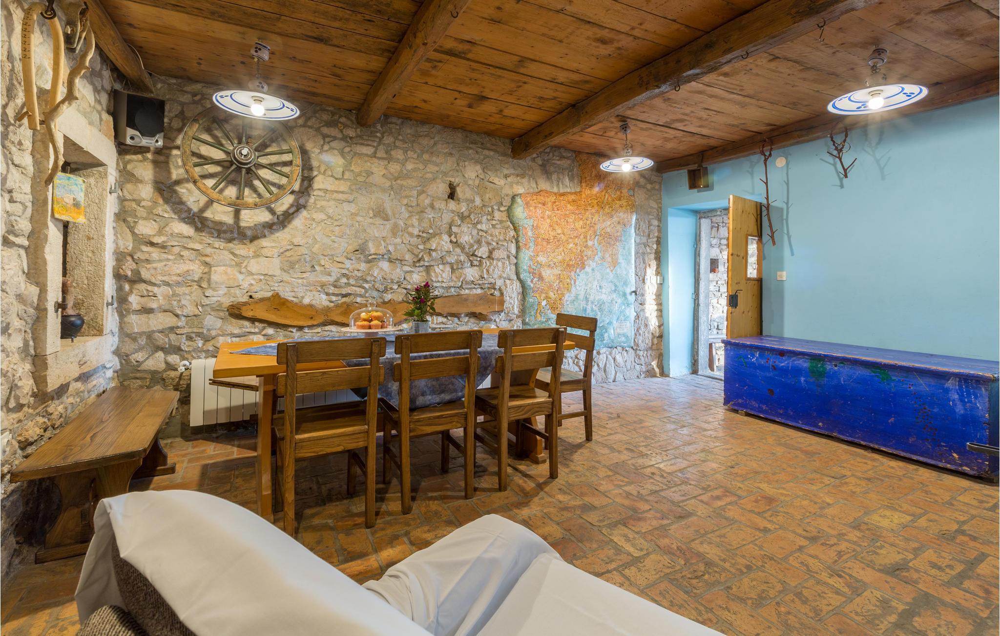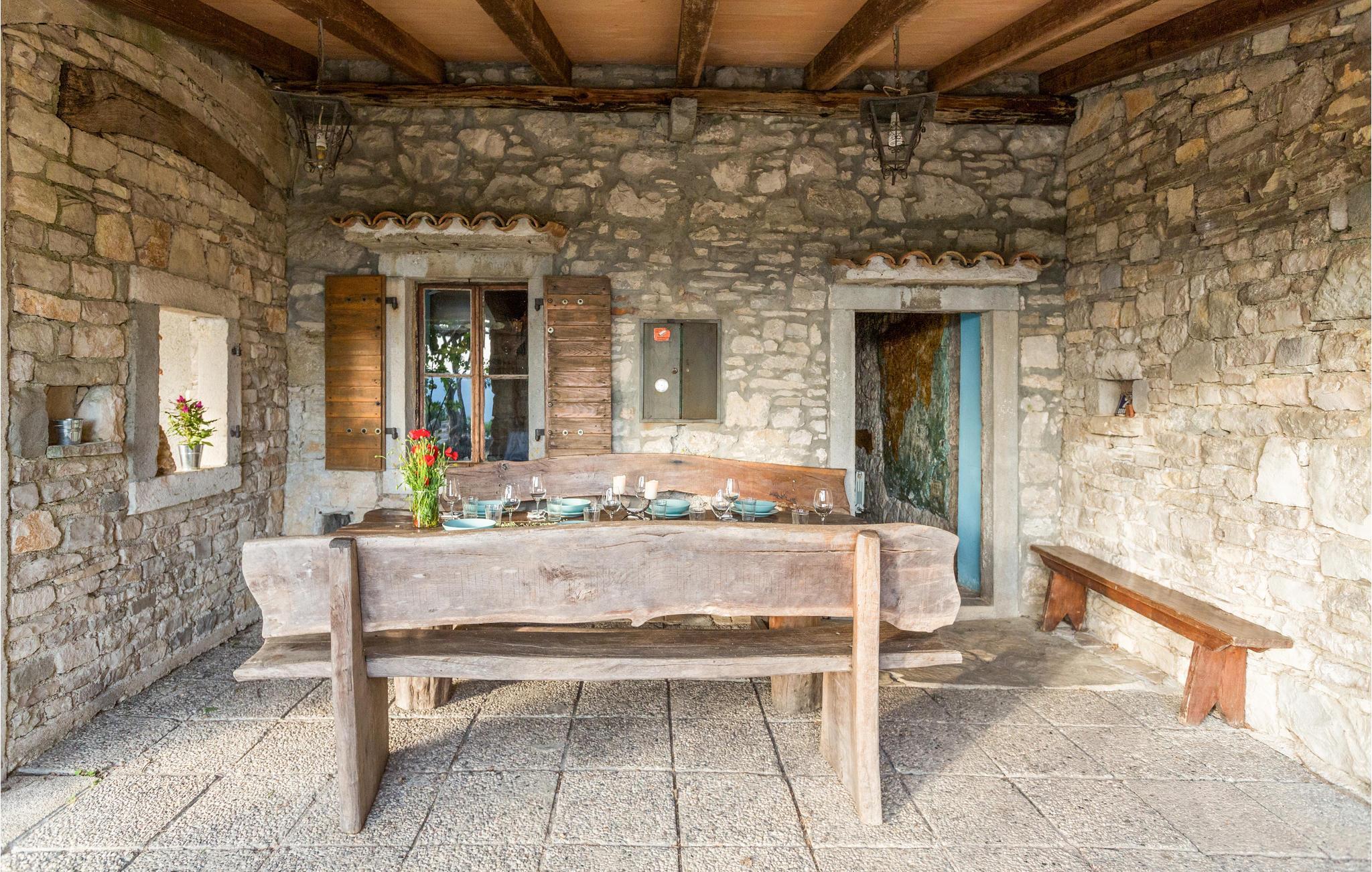 Das Haus ist im traditionellen istrischen Stil erbaut und rustikal sowie authentisch eingerichtet. Im Erdgeschoss befindet sich eine gemütliche Konoba (Taverne) mit offenem Kamin und Küche. Im ersten Stock gibt es zwei Schlafzimmer, eine Küche und ein Badezimmer. Der zweite Stock umfasst einen Wohnbereich mit Küche, ein Schlafzimmer und ein Badezimmer sowie einen Schlafboden, der über eine steile Treppe erreichbar ist – nicht geeignet für kleine Kinder. Die niedrigste Deckenhöhe auf dem Schlafboden beträgt 1,3 m.