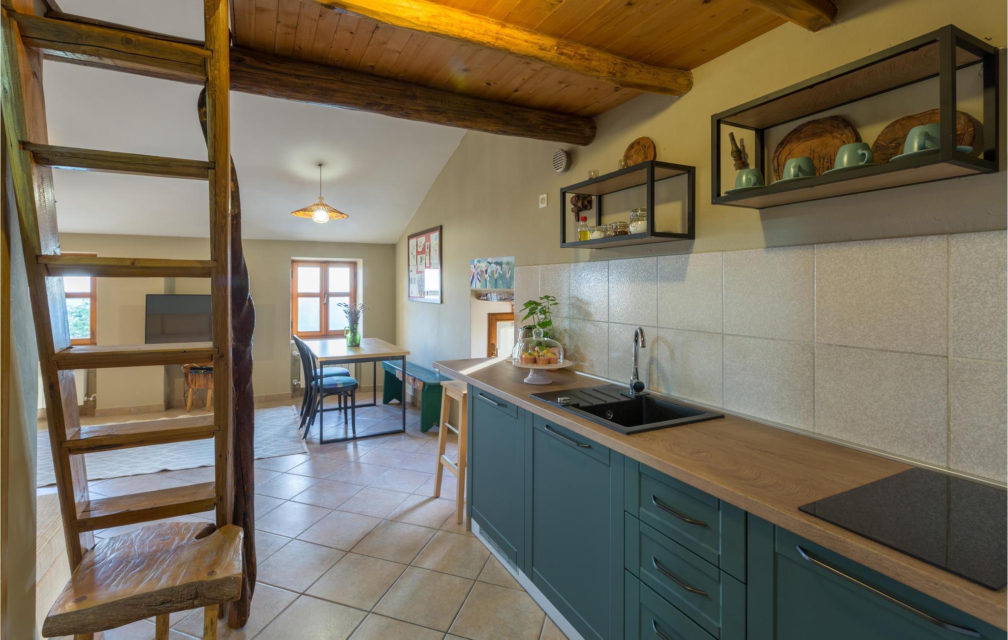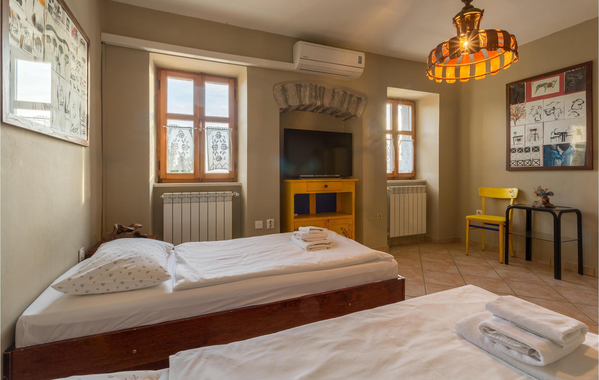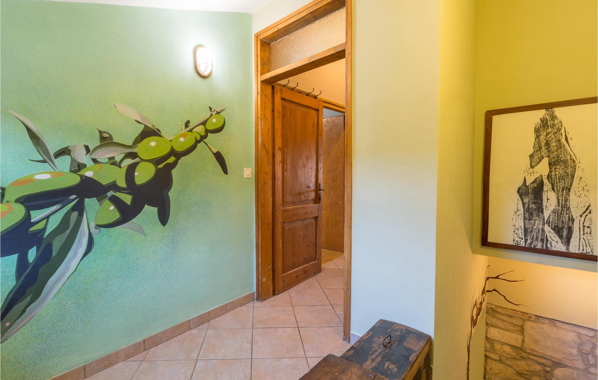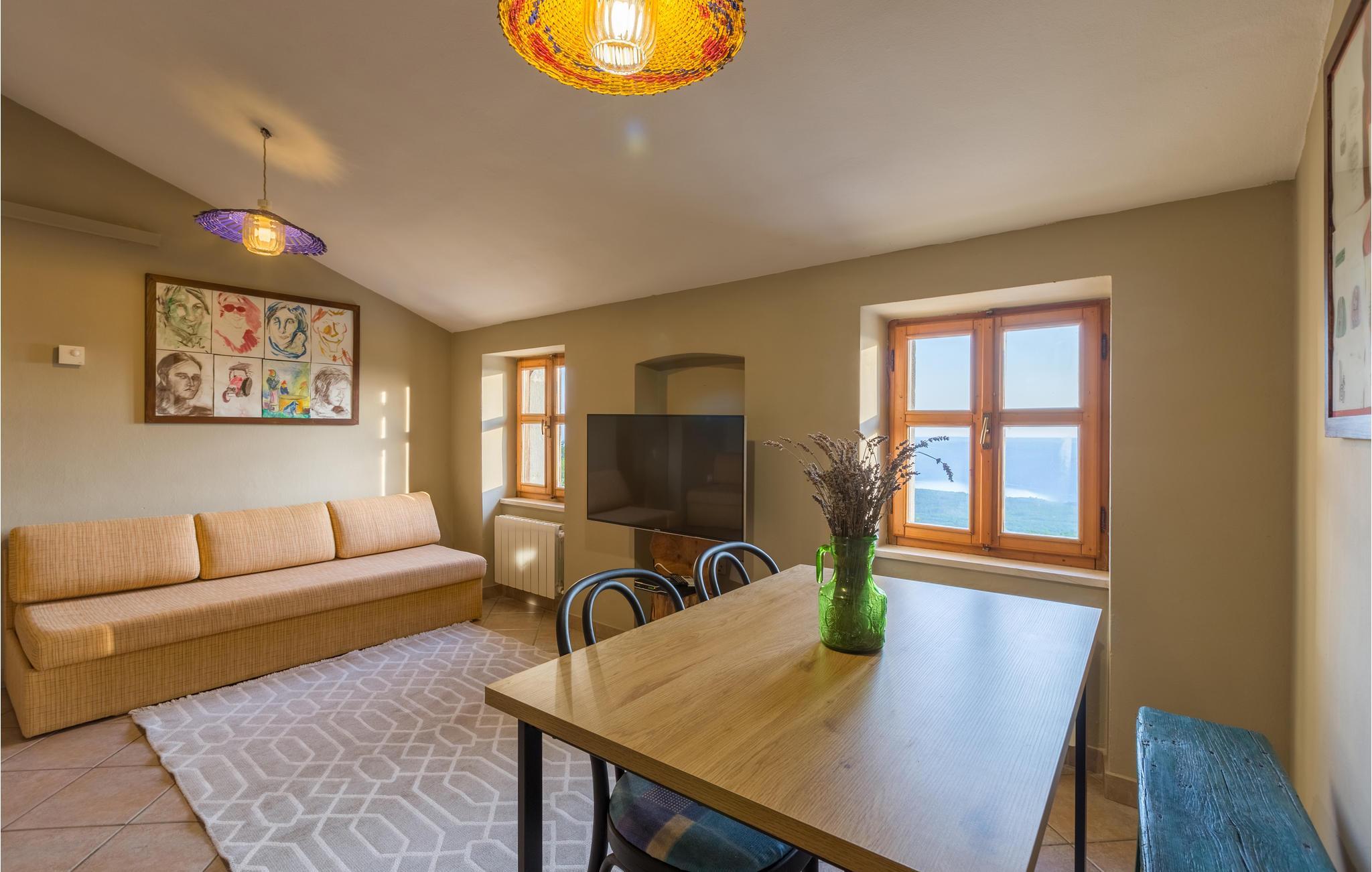 Das Haus ist im traditionellen istrischen Stil erbaut und rustikal sowie authentisch eingerichtet. Im Erdgeschoss befindet sich eine gemütliche Konoba (Taverne) mit offenem Kamin und Küche. Im ersten Stock gibt es zwei Schlafzimmer, eine Küche und ein Badezimmer. Der zweite Stock umfasst einen Wohnbereich mit Küche, ein Schlafzimmer und ein Badezimmer sowie einen Schlafboden, der über eine steile Treppe erreichbar ist – nicht geeignet für kleine Kinder. Die niedrigste Deckenhöhe auf dem Schlafboden beträgt 1,3 m.