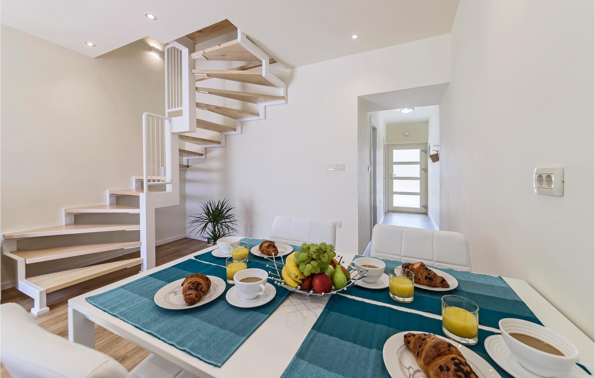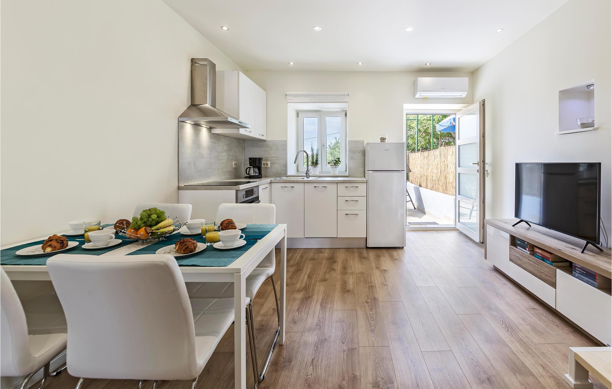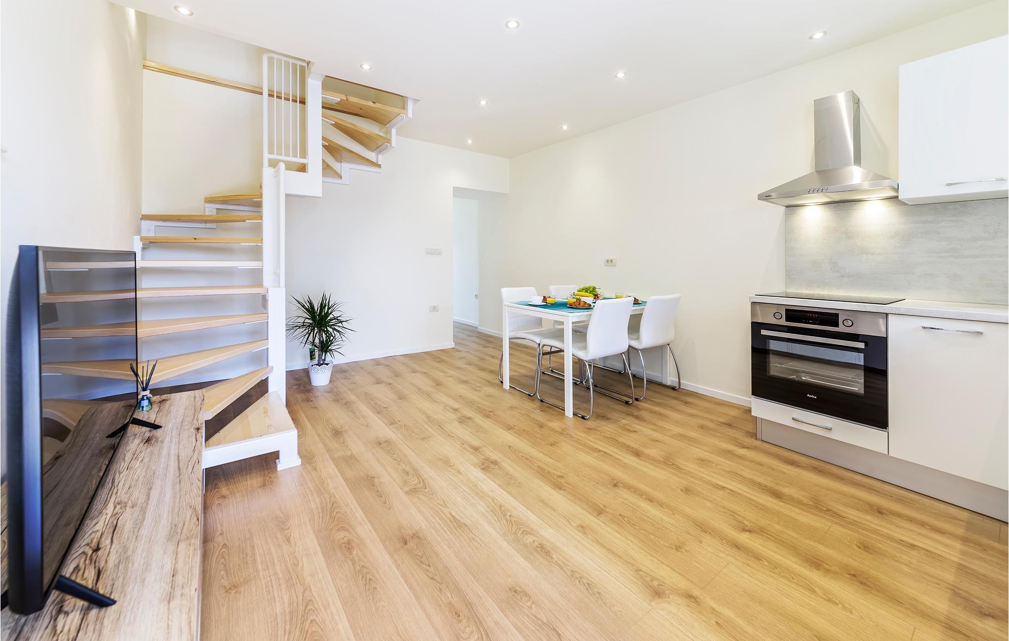 Es eignet sich ideal für Paare oder kleine Familien, die einen Urlaub in einer ruhigen Gegend verbringen möchten. Es ist ausgestattet mit modernen Möbeln und erstreckt sich durch das Erdgeschoss und den ersten Stock, die durch eine Wendeltreppe verbunden sind.