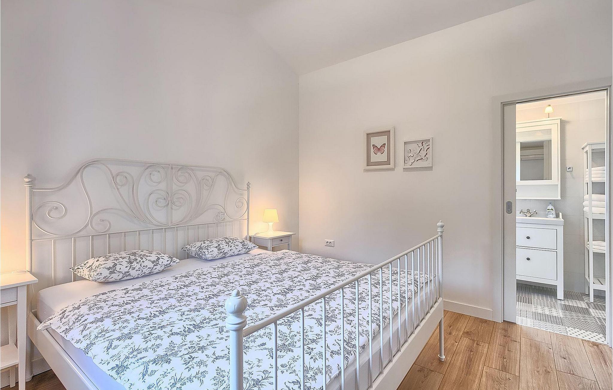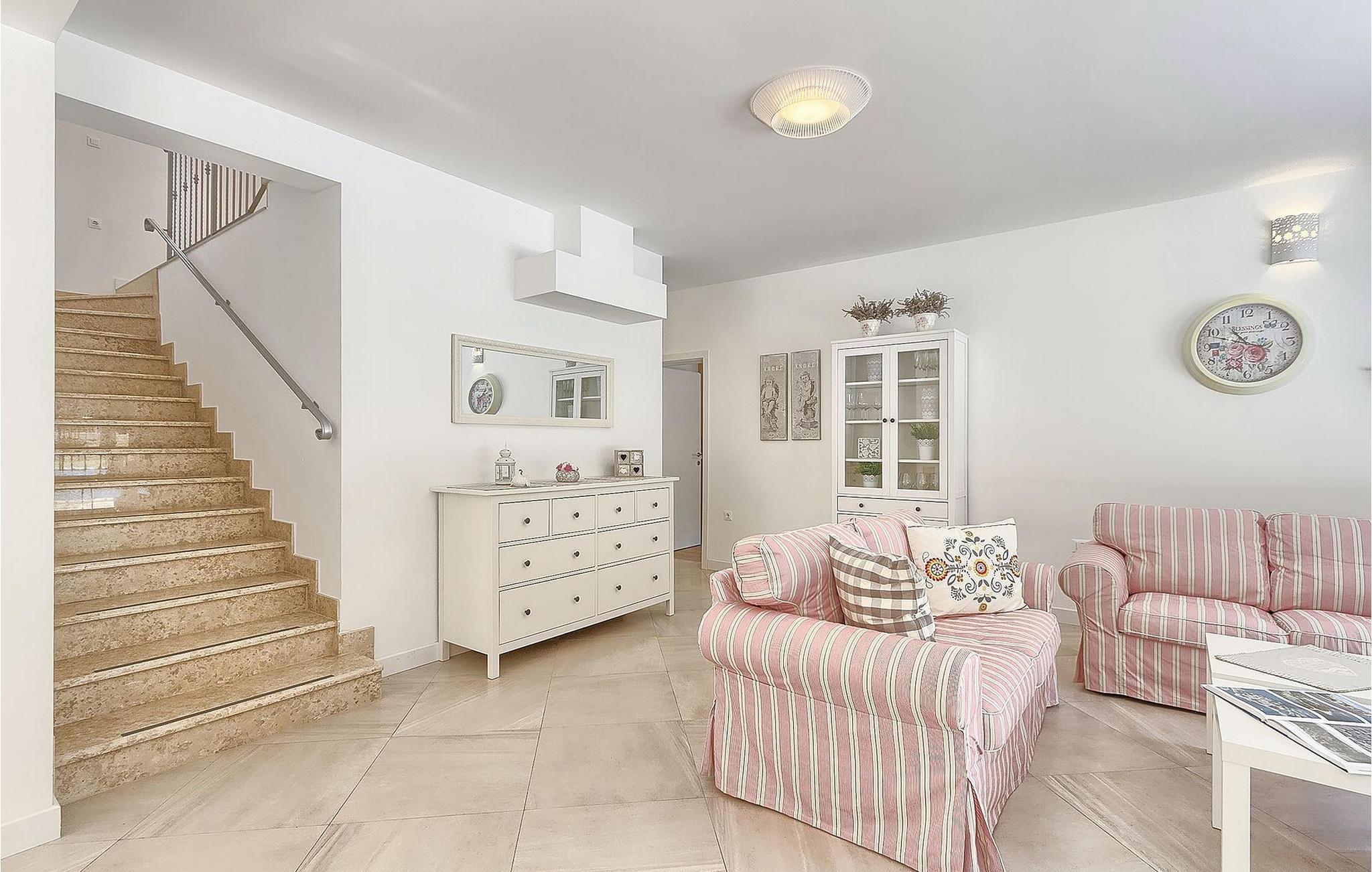 Die Villa verfügt über vier helle und komfortable Schlafzimmer und bietet Platz für bis zu acht Gäste. Vom Parkplatz betritt man direkt das Obergeschoss, wo sich drei klimatisierte Schlafzimmer und drei Badezimmer befinden. Zwei Schlafzimmer haben ein Doppelbett und ein eigenes Bad, das dritte Zimmer hat zwei Einzelbetten. Im Obergeschoss befindet sich ein weiteres Bad. Im Erdgeschoss befindet sich ein klimatisiertes Schlafzimmer mit direktem Zugang zum Pool, ein Bad und ein helles Wohnzimmer mit TV, dass mit dem Esszimmer und einer voll ausgestatteten Küche in einem Open-Space-Konzept verbunden ist. Der ganze Bereich ist klimatisiert. Die jüngeren Gäste werden sich über eine PlayStation 3 freuen. Neben dem Haus befindet sich eine überdachte Terrasse mit Esstisch. Grillliebhaber werden den überdachten Außenbereich mit Holzkohlegrill lieben. Im Garten der Villa befinden sich ein Pool und Sonnenliegen zum Entspannen und Genießen in der Sonne. In der Pause zwischen dem Schwimmen im Pool und dem Entspannen in der Sonne im Garten der Villa, können Sie auch Darts spielen, für einen erlebnisreichen Urlaub. Das Grundstück ist komplett eingezäunt und hat einen eigenen Parkplatz für 3 Autos.