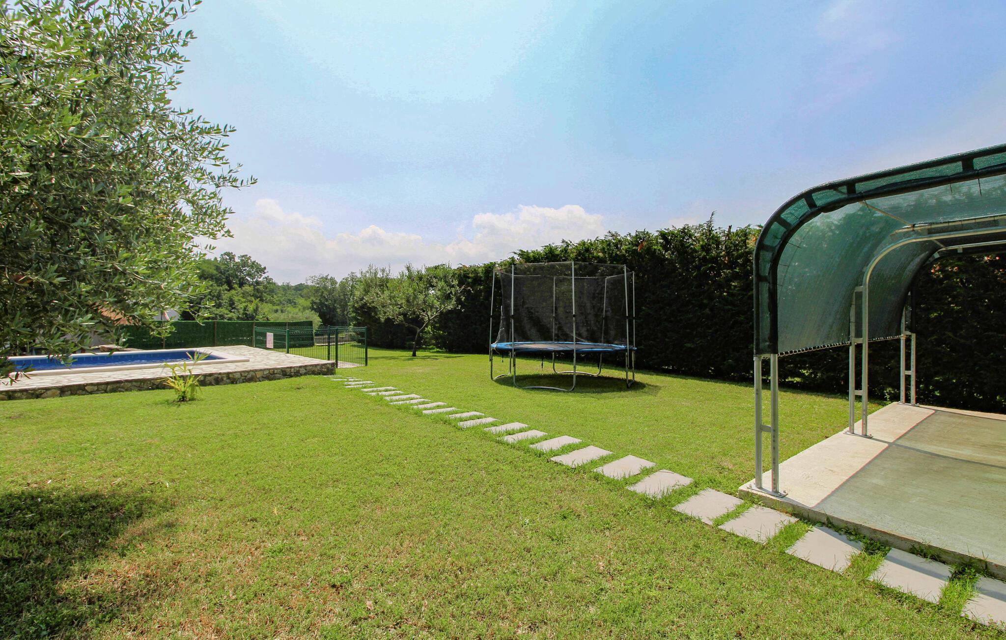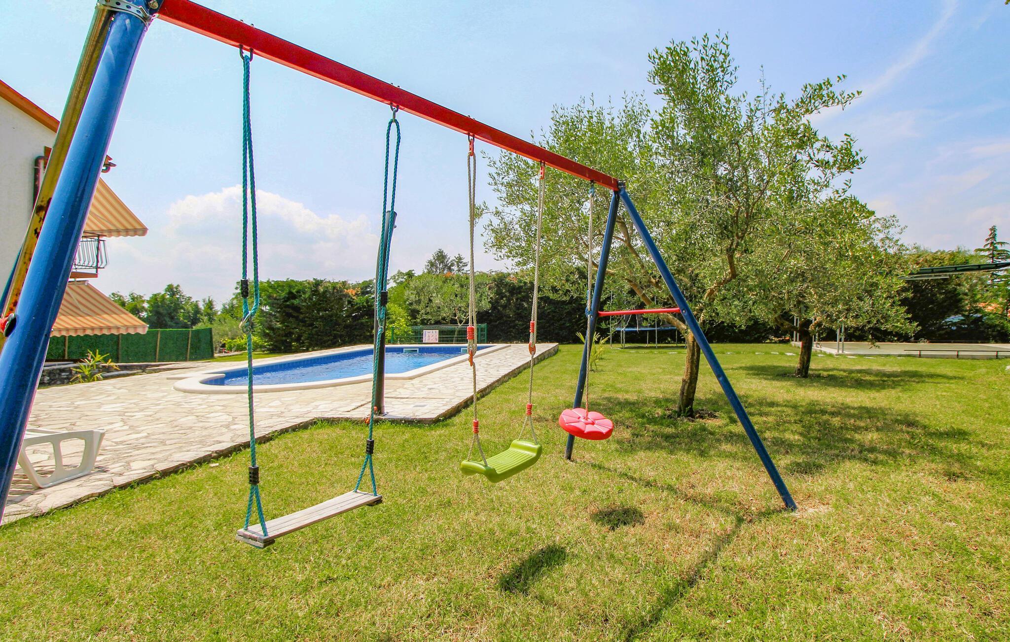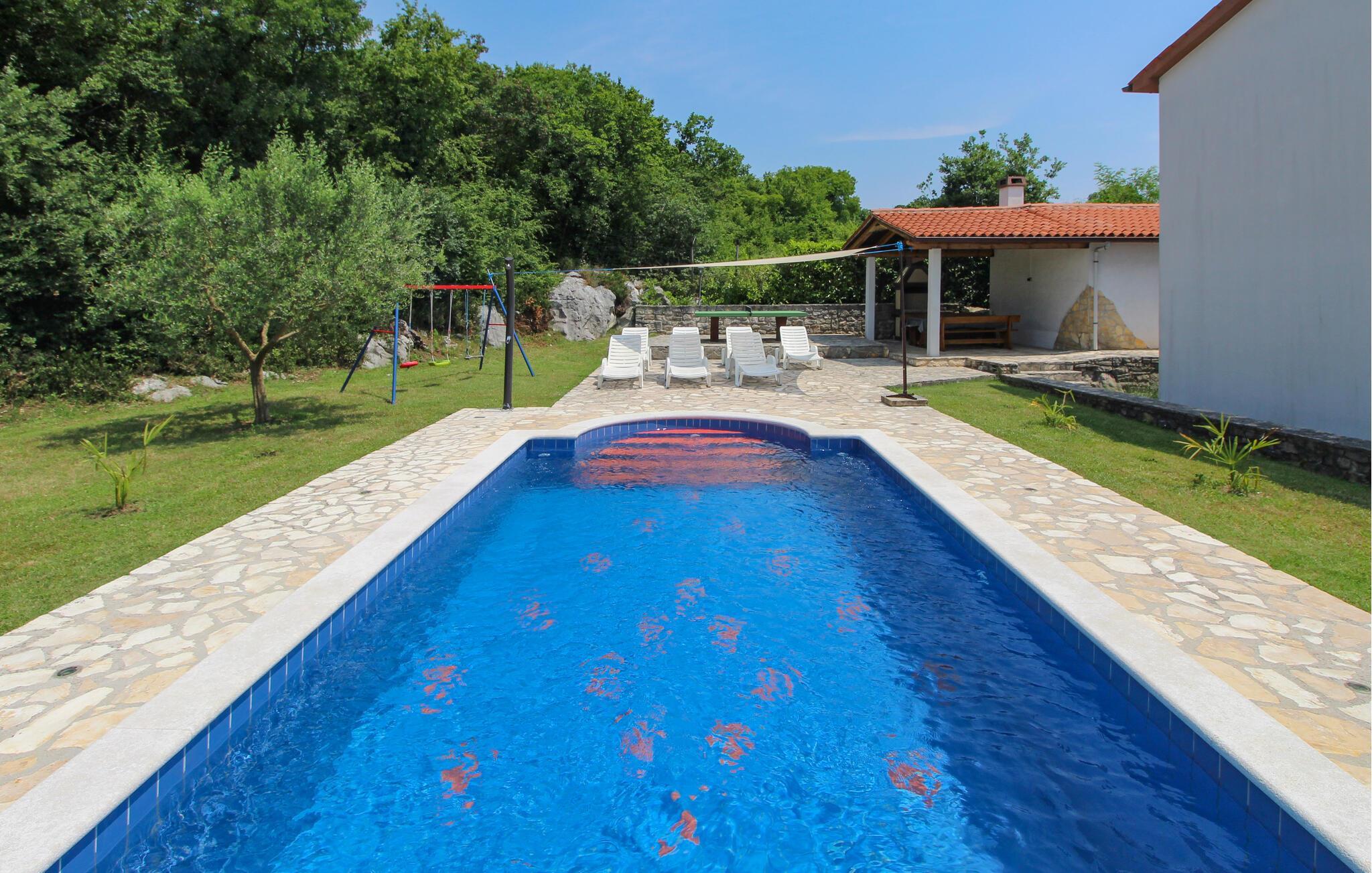 Der großzügige Garten mit Pool lädt Sie zum Entspannen und Verweilen ein. Zahlreiche Spielgeräte versüßen Ihren Kindern den Aufenthalt, während Sie auf den Sonnenliegen faulenzen. Für gesellige Abende können Sie den gemütlichen Tavernenraum mit offenem Kamin nutzen und in relaxter Atmosphäre ausklingen lassen.
