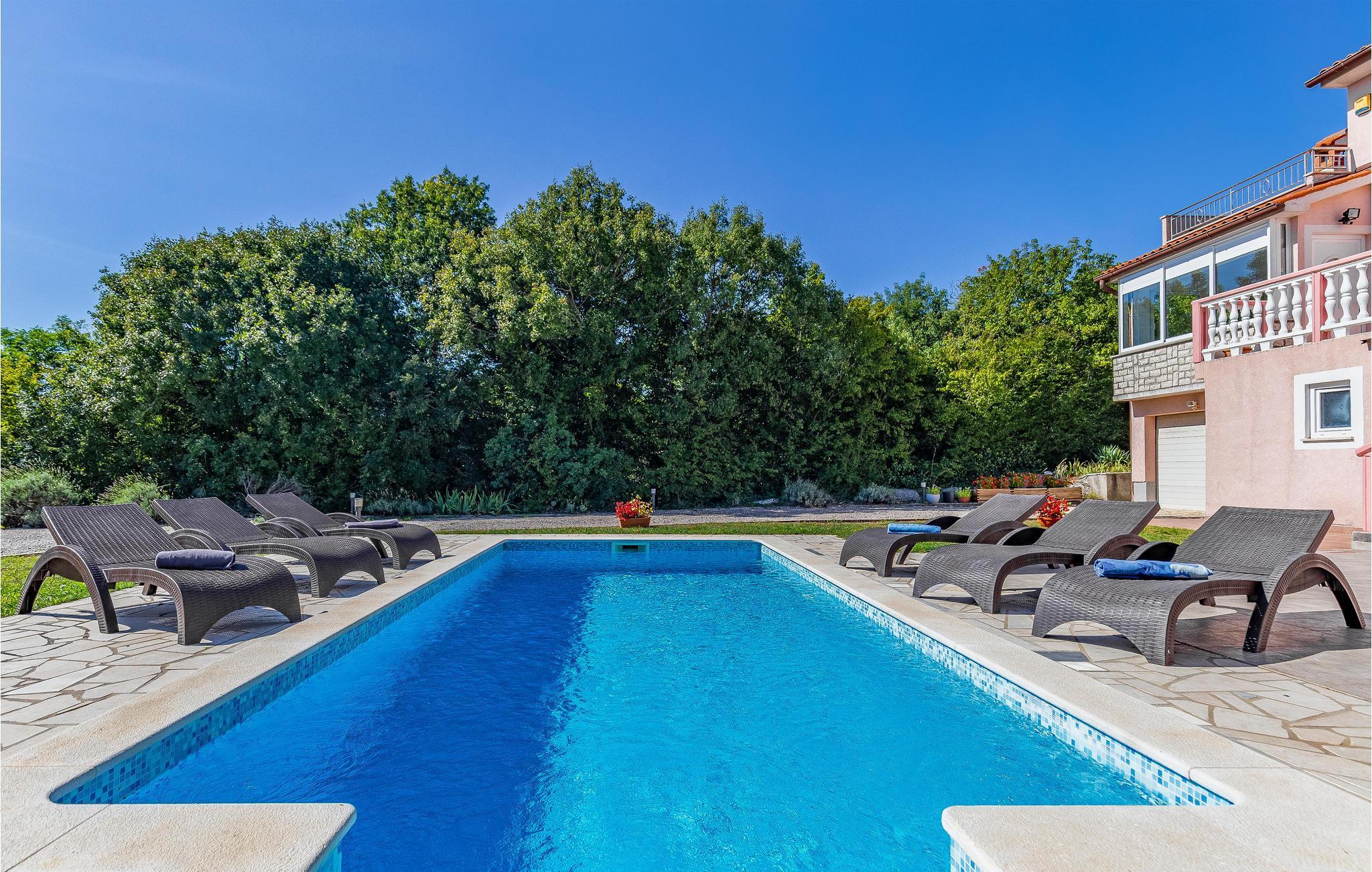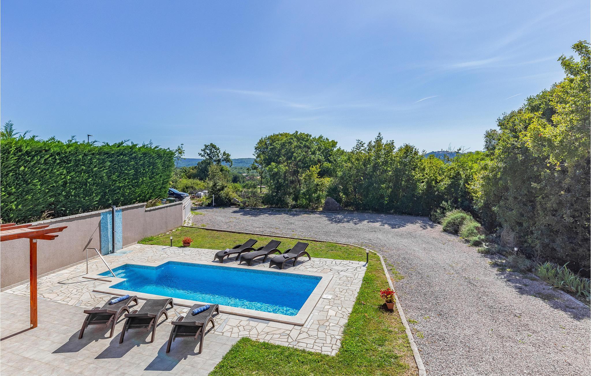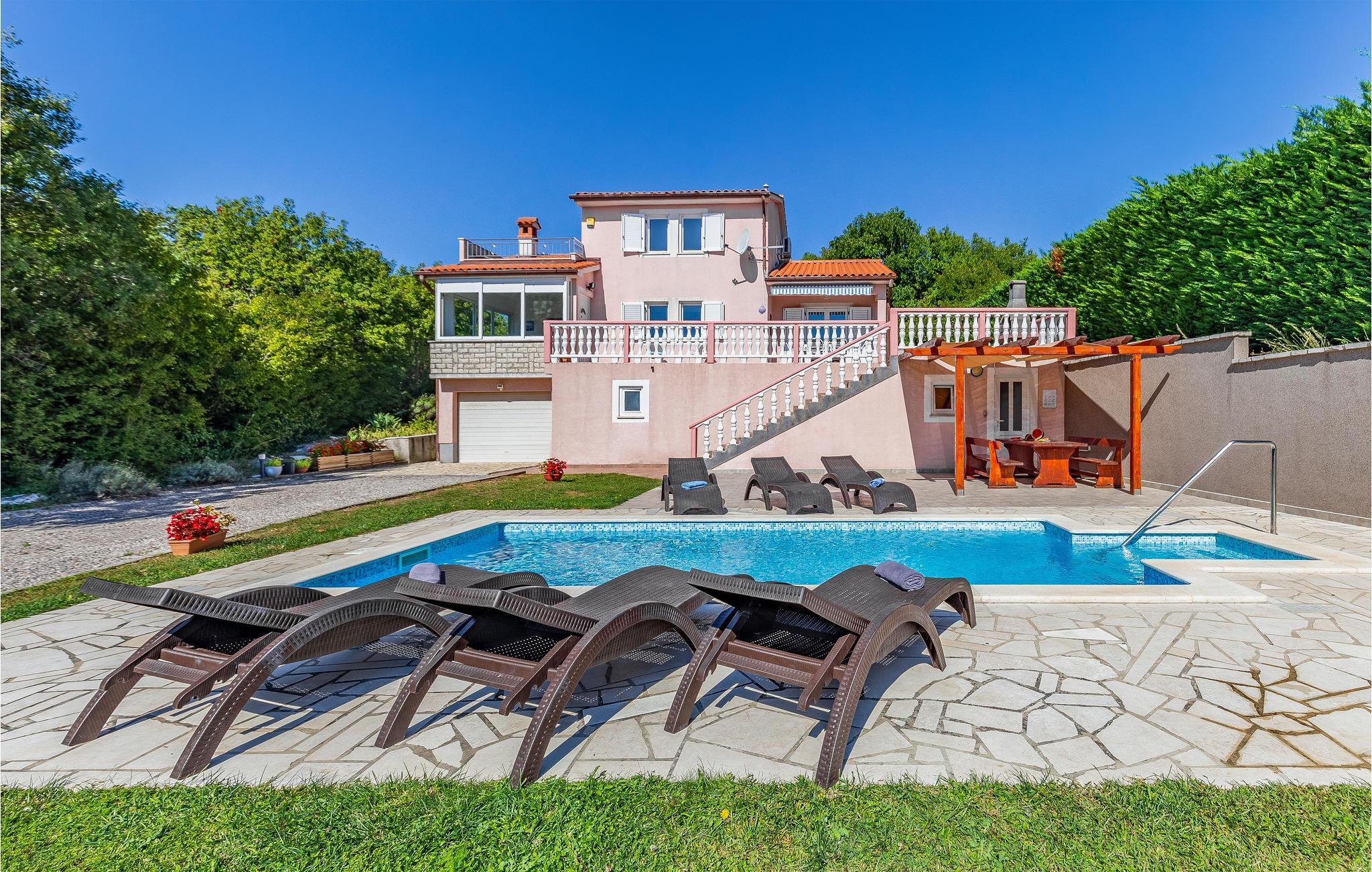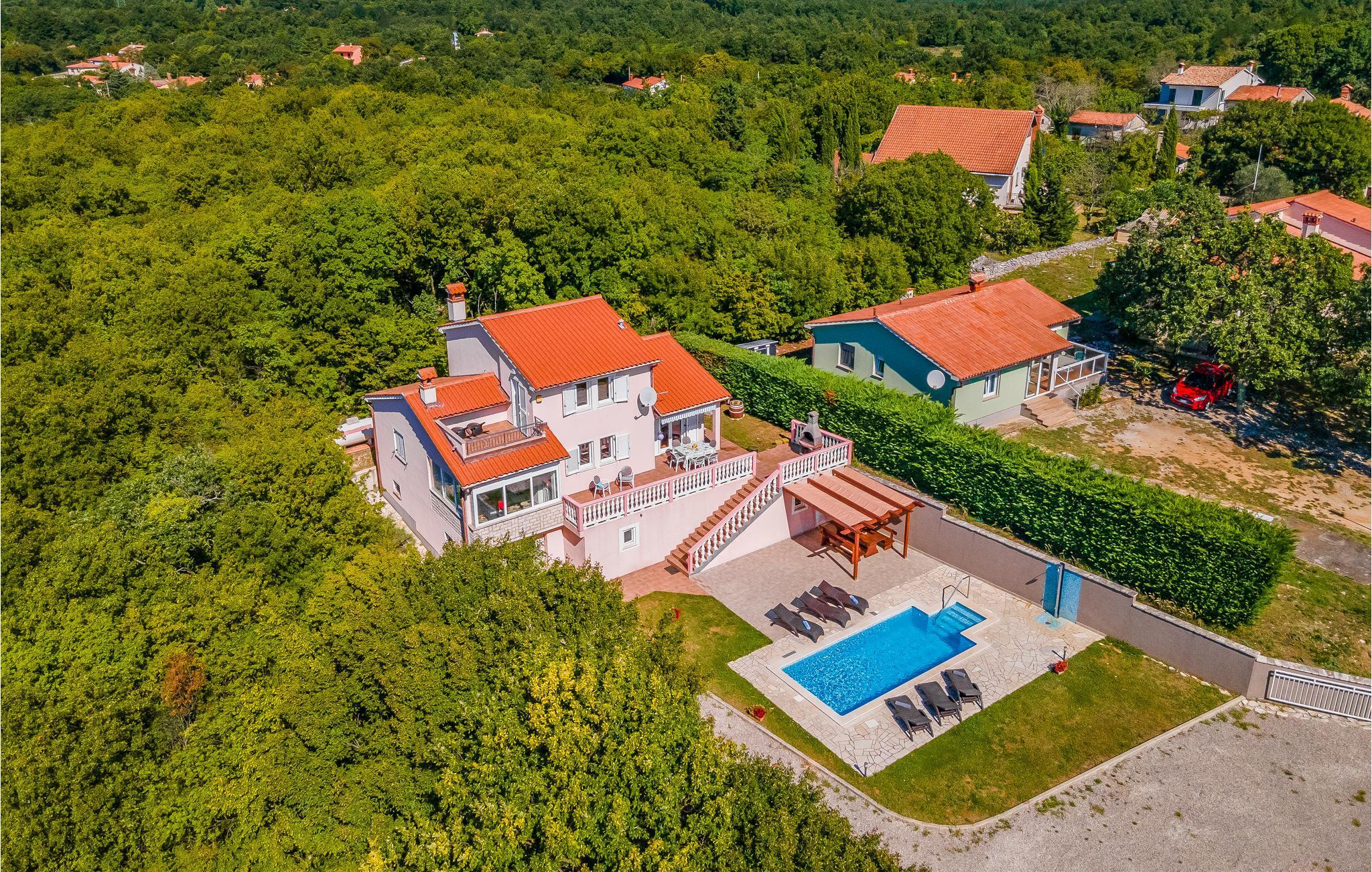 Dieses Ferienhaus mit Pool liegt in Labin, im Ortsteil Vinez. Es befindet sich in schöner Lage und bietet seinen Gästen viel Privatsphäre. Im Untergeschoss befindet sich eine sehr komfortable, praktische und geräumige Küche, die mit einer Loggia mit Glaswand und dem Esszimmer verbunden ist. Im Obergeschoss befinden sich die Schlafzimmer, die mit praktischen Möbeln ausgestattet sind. Die Etagen sind durch eine Innentreppe aus Holz miteinander verbunden. Von der großen Terrasse aus können Sie die Aussicht auf das Swimmingpool und die zauberhafte Landschaft genießen. Ein großer, teilweise umzäunter, Garten umgibt das Haus. Es liegt ganz hinten in der Straße, so dass die Kinder hier sorglos spielen und toben können. Genießen Sie den Ausblick auf die Altstadt von Labin am Hügel, die Sie zu Fuß in nur einer halben Stunde erreichen. Die schönen Kiesstrände von Rabac sind in wenigen Autominuten erreichbar.