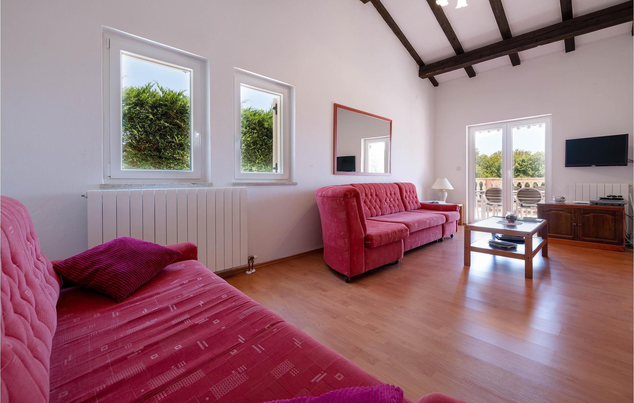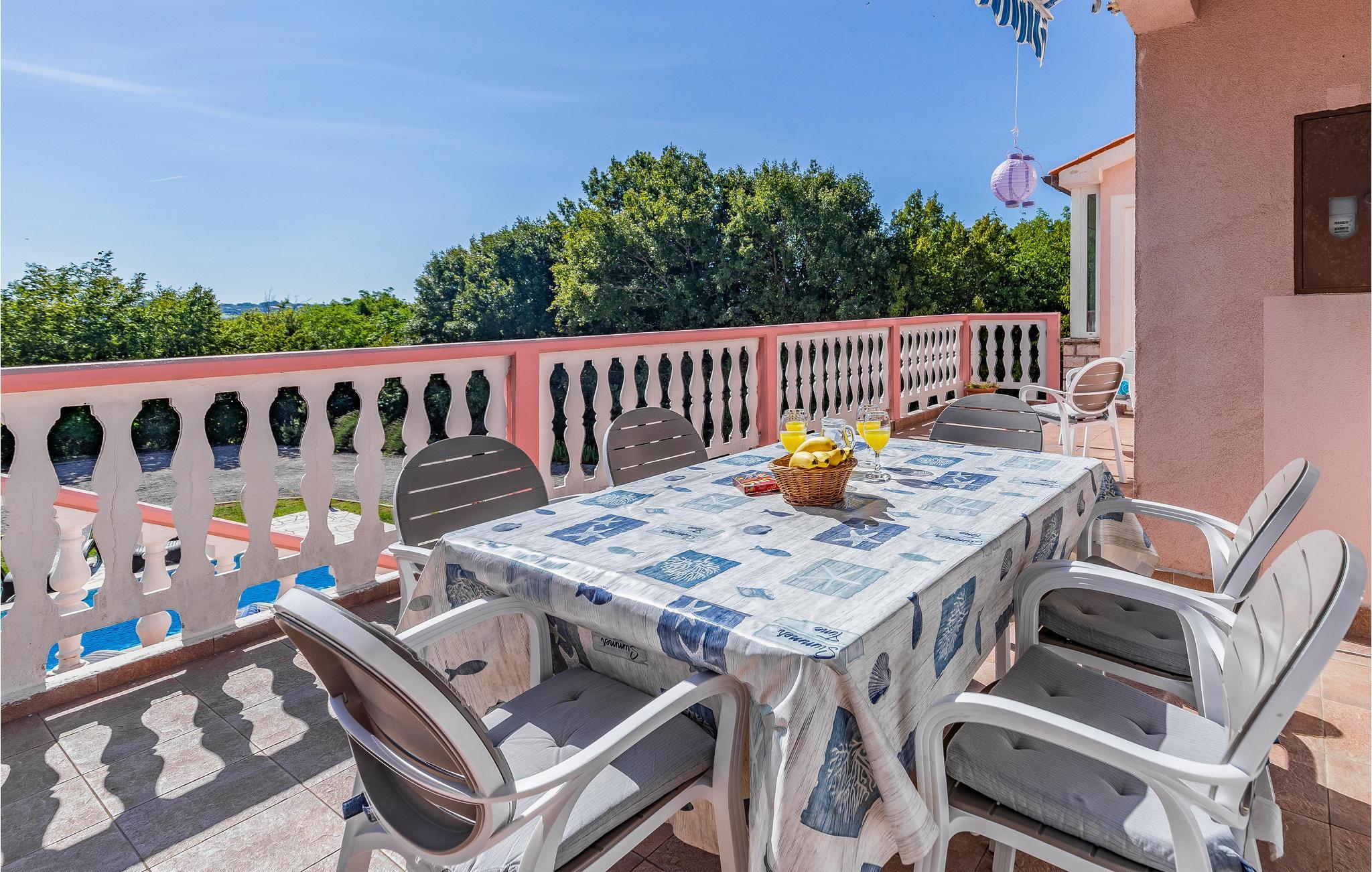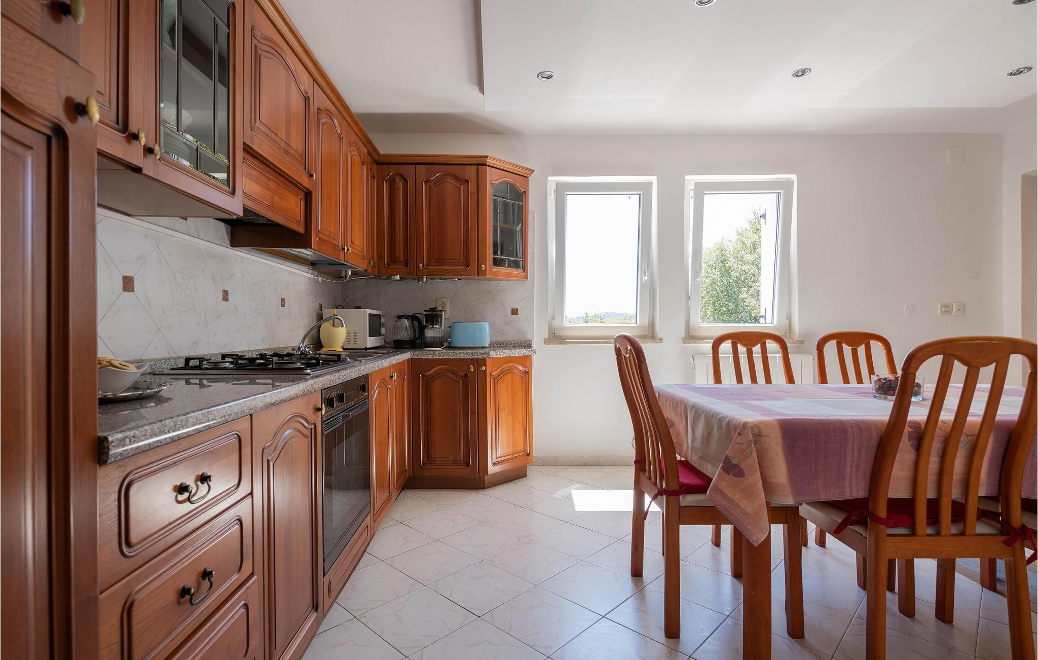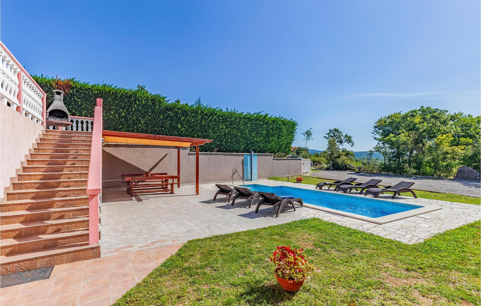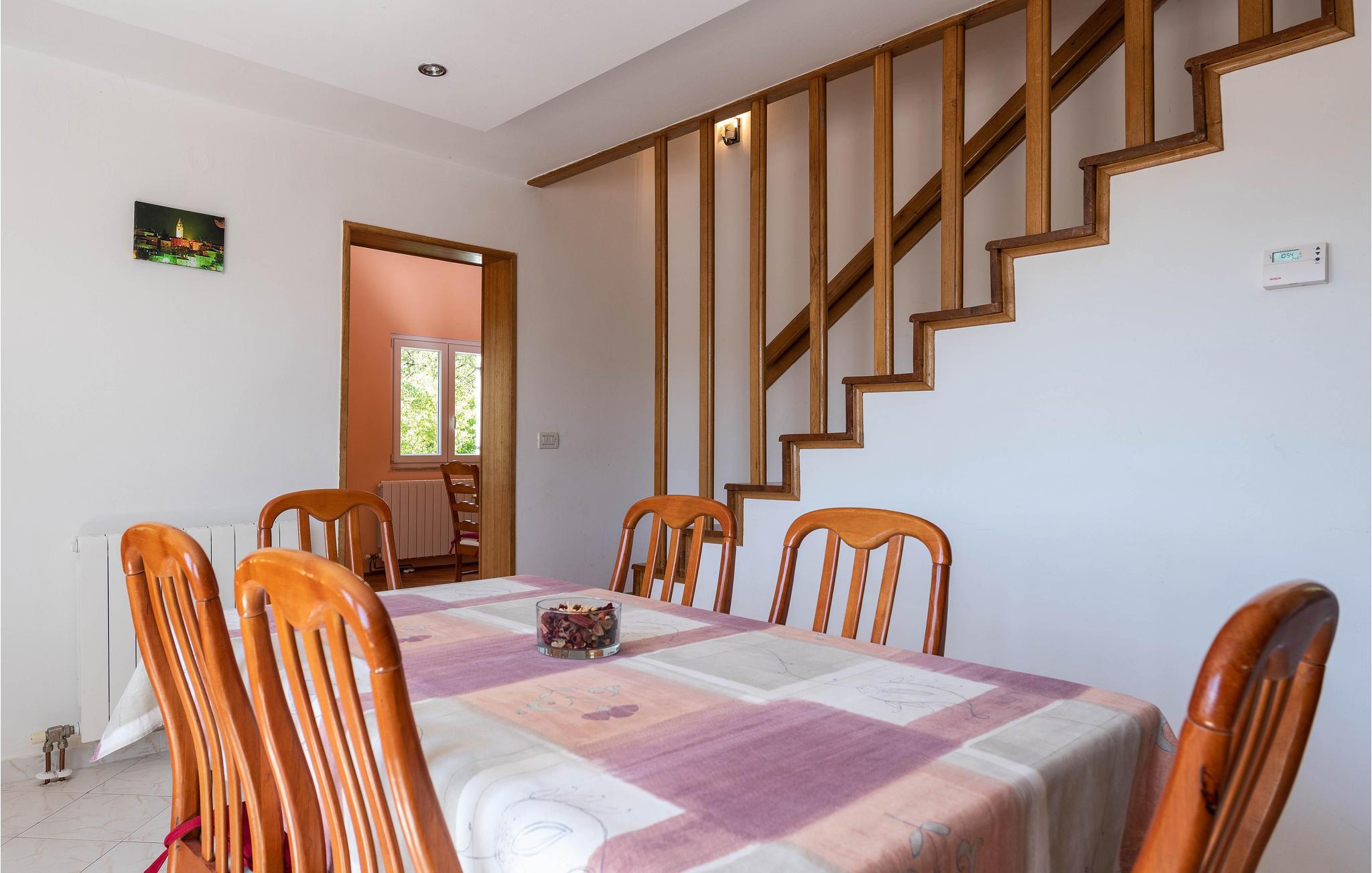 Dieses Ferienhaus mit Pool liegt in Labin, im Ortsteil Vinez. Es befindet sich in schöner Lage und bietet seinen Gästen viel Privatsphäre. Im Untergeschoss befindet sich eine sehr komfortable, praktische und geräumige Küche, die mit einer Loggia mit Glaswand und dem Esszimmer verbunden ist. Im Obergeschoss befinden sich die Schlafzimmer, die mit praktischen Möbeln ausgestattet sind. Die Etagen sind durch eine Innentreppe aus Holz miteinander verbunden. Von der großen Terrasse aus können Sie die Aussicht auf das Swimmingpool und die zauberhafte Landschaft genießen. Ein großer, teilweise umzäunter, Garten umgibt das Haus. Es liegt ganz hinten in der Straße, so dass die Kinder hier sorglos spielen und toben können. Genießen Sie den Ausblick auf die Altstadt von Labin am Hügel, die Sie zu Fuß in nur einer halben Stunde erreichen. Die schönen Kiesstrände von Rabac sind in wenigen Autominuten erreichbar.