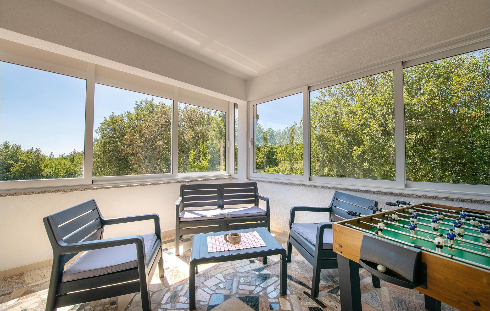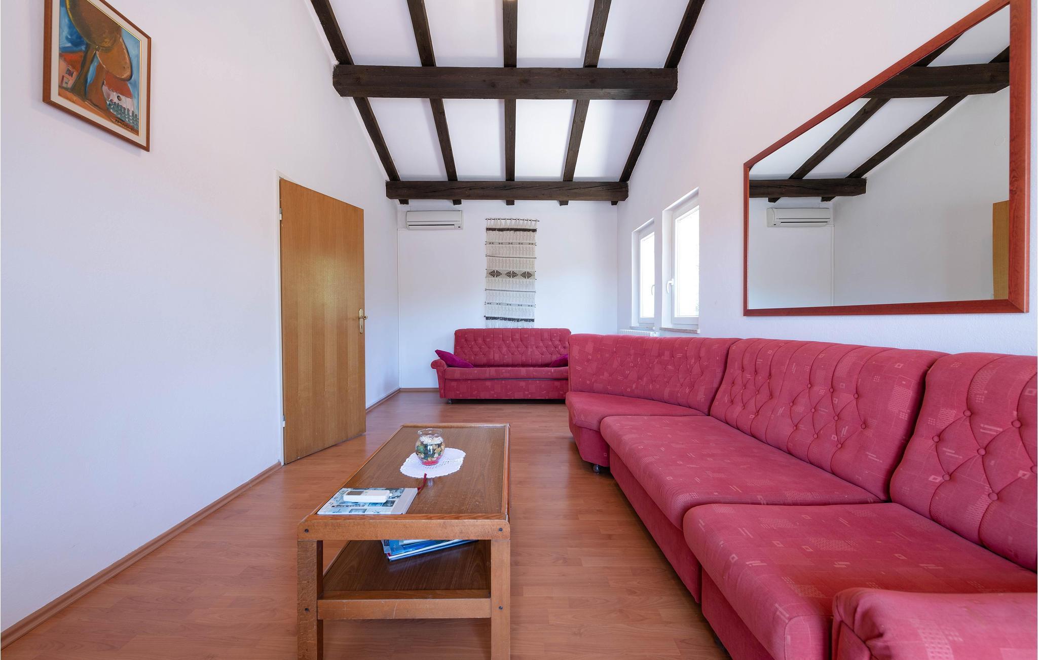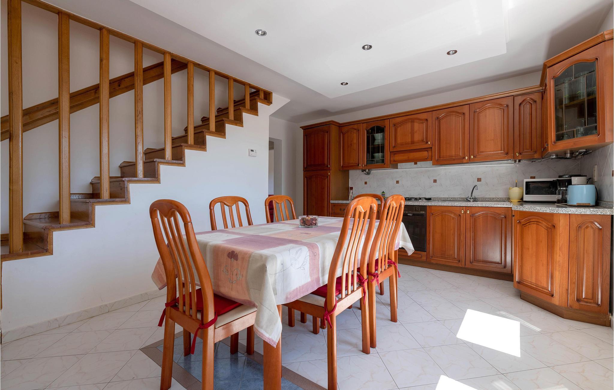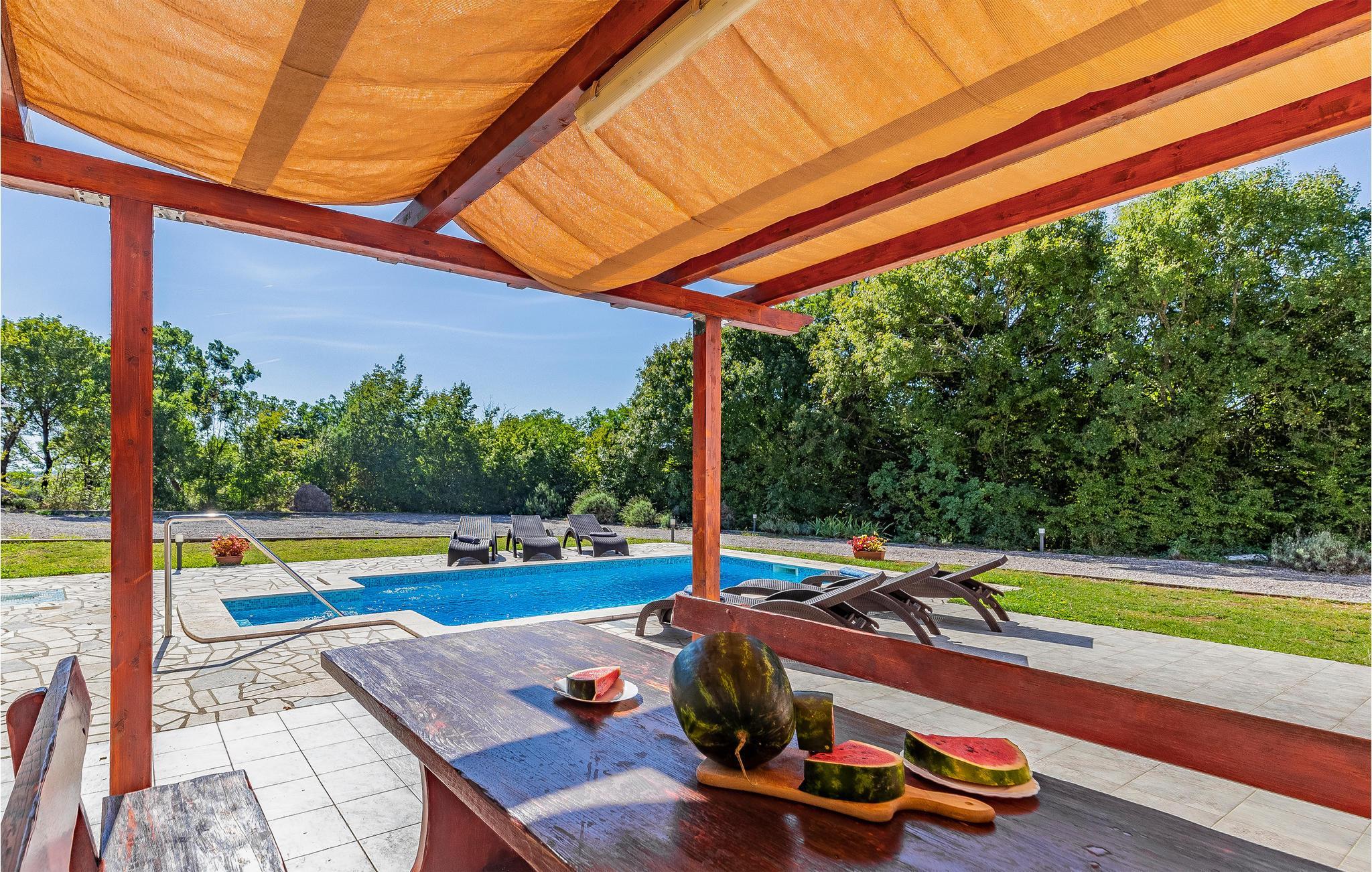 Dieses Ferienhaus mit Pool liegt in Labin, im Ortsteil Vinez. Es befindet sich in schöner Lage und bietet seinen Gästen viel Privatsphäre. Im Untergeschoss befindet sich eine sehr komfortable, praktische und geräumige Küche, die mit einer Loggia mit Glaswand und dem Esszimmer verbunden ist. Im Obergeschoss befinden sich die Schlafzimmer, die mit praktischen Möbeln ausgestattet sind. Die Etagen sind durch eine Innentreppe aus Holz miteinander verbunden. Von der großen Terrasse aus können Sie die Aussicht auf das Swimmingpool und die zauberhafte Landschaft genießen. Ein großer, teilweise umzäunter, Garten umgibt das Haus. Es liegt ganz hinten in der Straße, so dass die Kinder hier sorglos spielen und toben können. Genießen Sie den Ausblick auf die Altstadt von Labin am Hügel, die Sie zu Fuß in nur einer halben Stunde erreichen. Die schönen Kiesstrände von Rabac sind in wenigen Autominuten erreichbar.