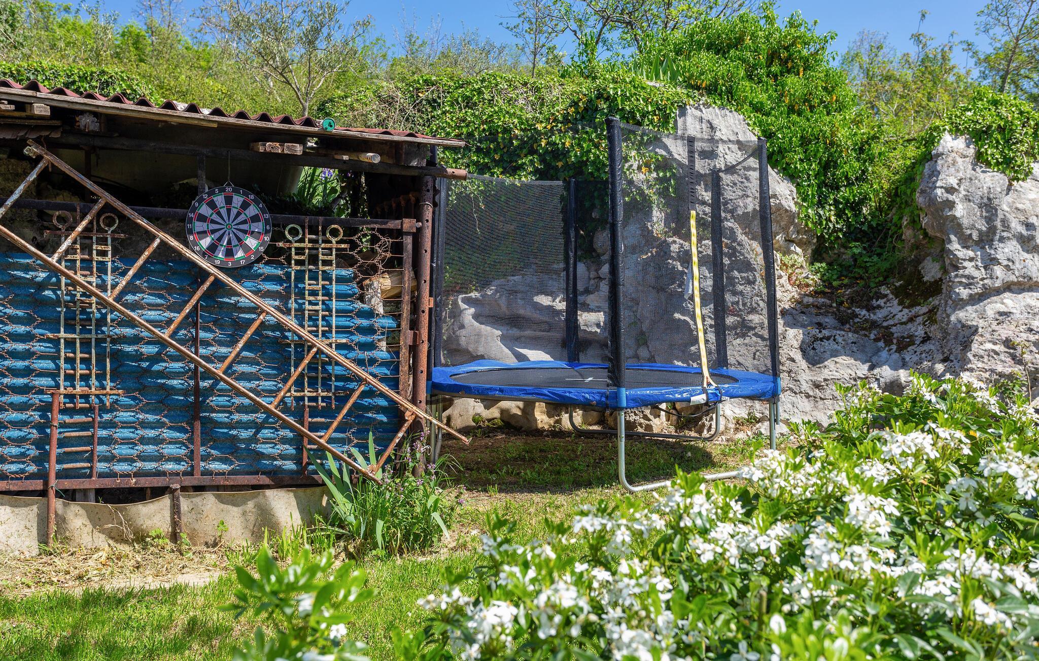 Willkommen in dieser charmanten und familienfreundlichen Oase. Fahren Sie mit Ihrem Auto den Weg durch das große Grundstück und erreichen das gut ausgestattete Haus, das Ihnen alles für einen unbeschwerten Familienurlaub bietet. Gehen Sie Ihrem Ferienalltag nach und verbringen sehr viele Stunden im Freien und blicken von den Terrassen über die Landschaft und das Grundstück. Sehen Sie Ihren Kindern beim Spielen auf dem Trampolin zu und machen sich auf, um im Garten Obst oder Gemüse zu ernten und leckere Gerichte in der Küche oder auf dem Grill zu zaubern. Genießen Sie den aromatischen Garten und kommen Sie als Naturliebhaber hier zur Ruhe. Auch die Erfrischung im Pool ist eine willkommene Abwechslung und macht das Angebot der Ferienunterkunft komplett.