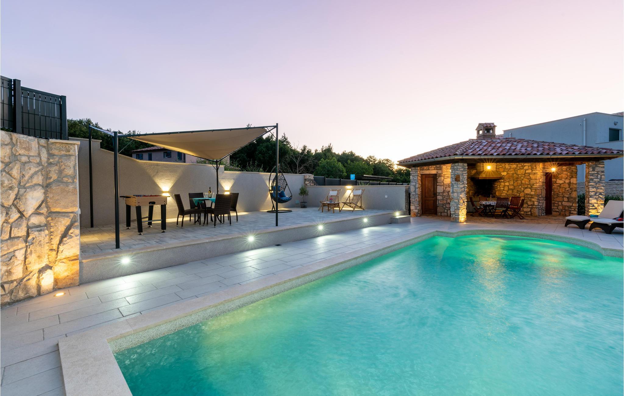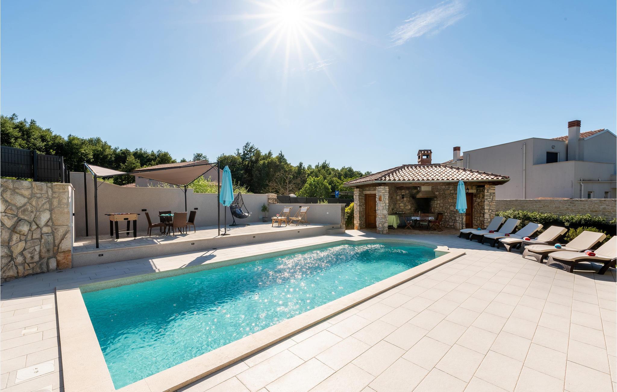 In moderner Einrichtung auf beiden Etagen und im Außenbereich fühlen Sie sich durchgängig besonders wohl. Der Außenbereich wird von einem schönen Pool dominiert, der für Erfrischung sorgt und an dem Sie sich auf Liegestühlen entspannen können. Direkt daneben befindet sich ein Steinpavillon, in dem Sie Ihre Lieblingsgerichte auf dem Grill zubereiten können, und eine offene Terrasse.