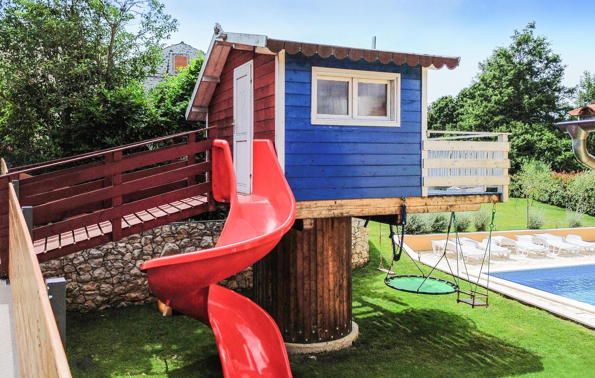 Genießen Sie Ihren Familienaufenthalt in diesem einladenden und komfortablen Ferienhaus. Hier finden Sie und Ihre Lieben alles vor, was Sie zum Entspannen und Wohlfühlen brauchen und können neben Filmabenden auf dem Sofa auch zum gemeinsamen Kochen in der voll ausgestatteten Küche zusammenkommen. Setzen Sie sich auch auf die teilweise überdachte Terrasse und schauen zu, wie der Außenpool in den Sommermonaten zum Abkühlen einlädt. Ihre Kinder werden neben dem Haus das wunderschön handgefertigte Holzhaus, ein großartiges Spielzimmer entdecken, Rutschen, Schaukel und Kletterseile runden das Angebot ab.