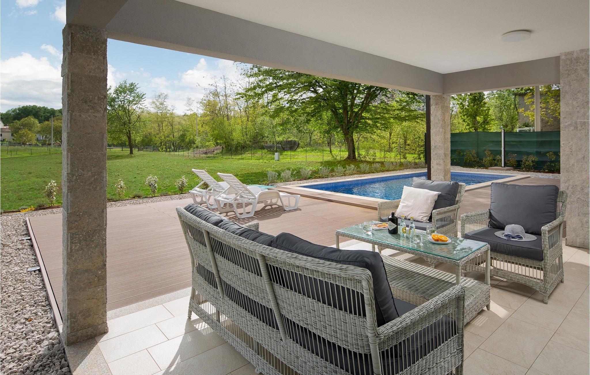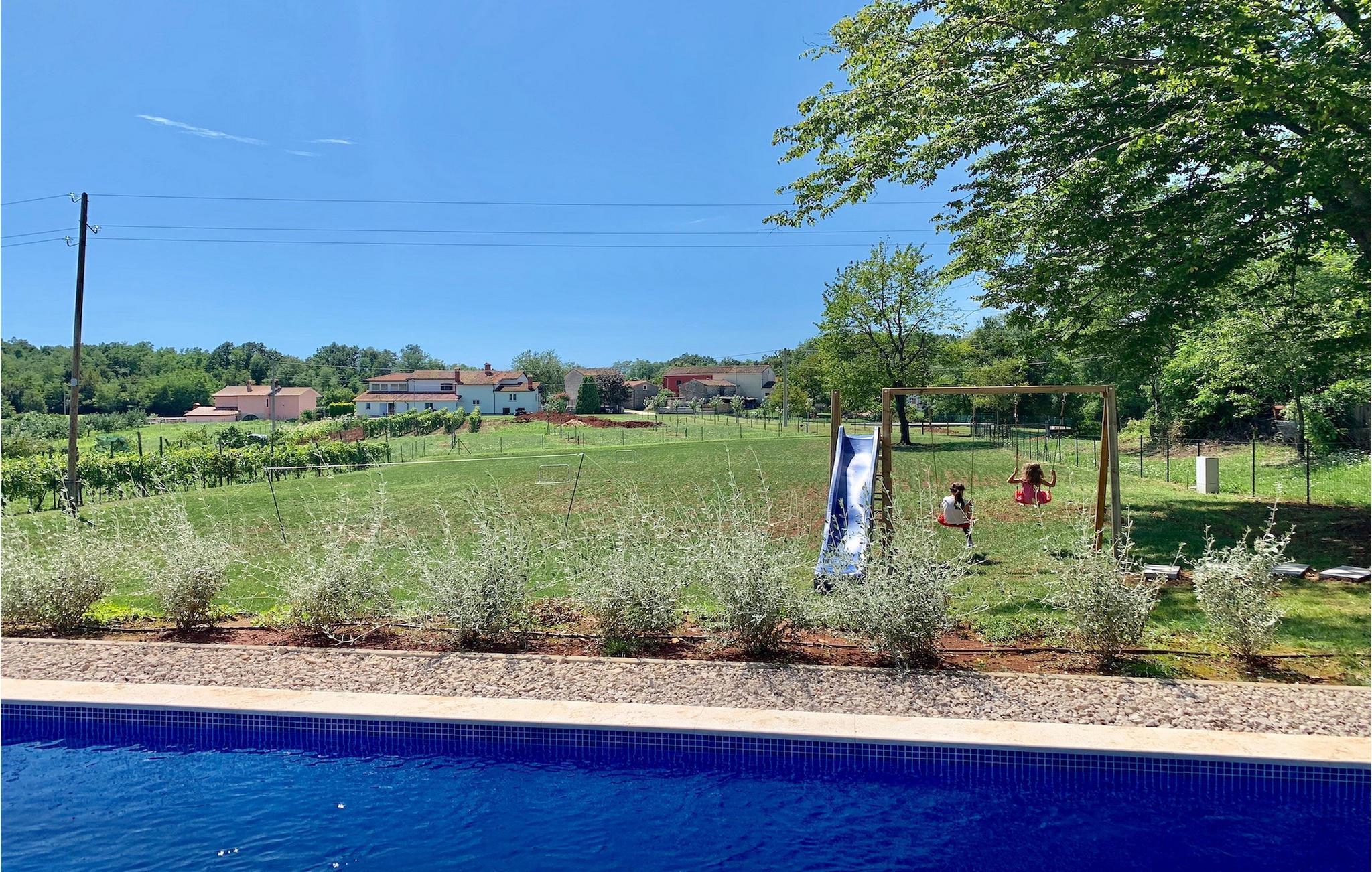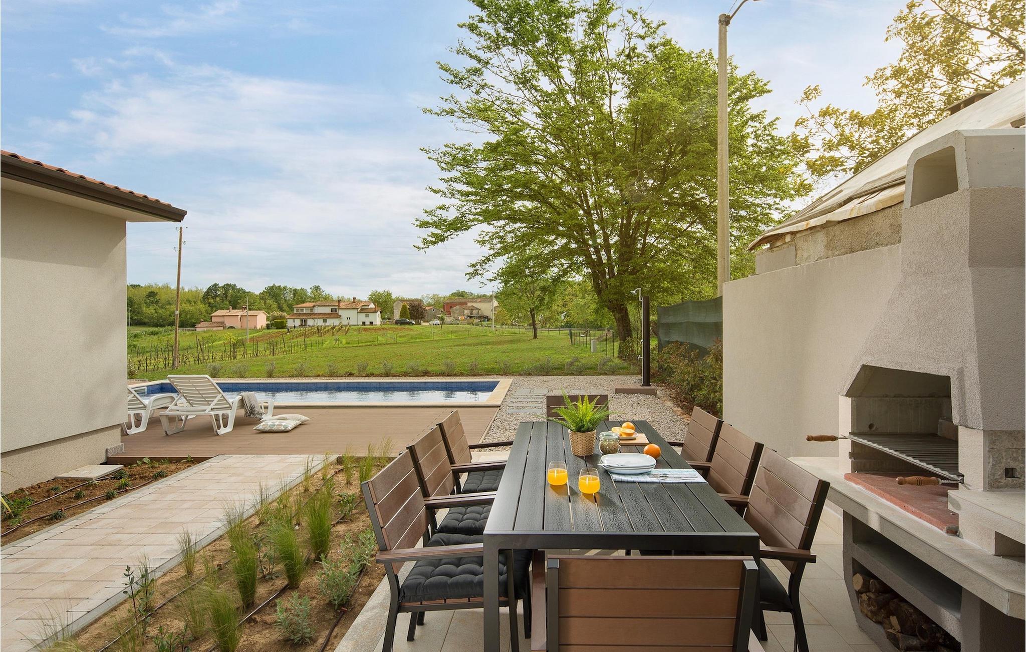 Suchen Sie nach einer modernen Villa mit einem großen, gepflegten Garten und einem einladenden privaten Pool für Ihren perfekten Familienurlaub, ist die Villa Meadow genau das Richtige für Sie! Diese einstöckige Villa erstreckt sich über einem Grundstück auf mehr als 2000 m2 und bietet genügend Platz im Außenbereich, um sich auf den Sonnenliegen zu entspannen, für Kinder, um auf dem Spielplatz zu spielen und für die gesamte Gruppe, um den Essbereich im Freien am Holzkohlegrill zu genießen. Diese wunderschöne Villa bietet Platz für bis zu 8 Personen in 3 sorgfältig eingerichteten Schlafzimmern. Alle Räume befinden sich im Erdgeschoss. Zwei Schlafzimmer verfügen über Doppelbetten, während eines über 2 Einzelbetten verfügt, dazu wird auch das Sofabett für die zusätzlichen Gäste angeboten. Beim Betreten der Villa kommen Sie zum räumlichen Bereich mit der komplett ausgestatteten Küche, Wohnzimmer (mit Kamin) und Essbereich mit Blick auf die schöne Terrasse neben dem Pool. Die Terrasse ist der ideale Ort, um gemeinsam zu frühstücken oder einfach mit einem Buch und Glas istrischen Malvazija zu entspannen. Genießen Sie Zentralistrien und erkunden Sie die wunderschöne, natürliche Umgebung, die Weiler und verbringen Sie einen entspannten Urlaub in der Villa Meadow!Die wunderschöne Villa Meadow befindet sich im kleinen Ort Zupanici in der Nähe von Labin. Hier können Sie die Ruhe in der Natur genießen. Falls Sie gerne aktiv im Urlaub bleiben können Sie hier auch Radfahren und joggen. Die Altstadt Labin befindet sich auf der östlichen Seite der istrischen Halbinsel. Es ist ein Ort, in dem sie zahlreiche Ateliers vorfinden werden und der ideale Ort, um Kunst bei jedem Schritt durch die Stadt zu genießen. Rabac, ein ehemaliges Fischerdorf, bietet gute Strände und Restaurants. In der Umgebung von Labin-Rabac können Sie Tennis, Minigolf, Beach-Volleyball, Tauchen und verschiedene Wassersportarten genießen und der erste Strand ist nur 10 km (in Rabac) von der Villa entfernt.