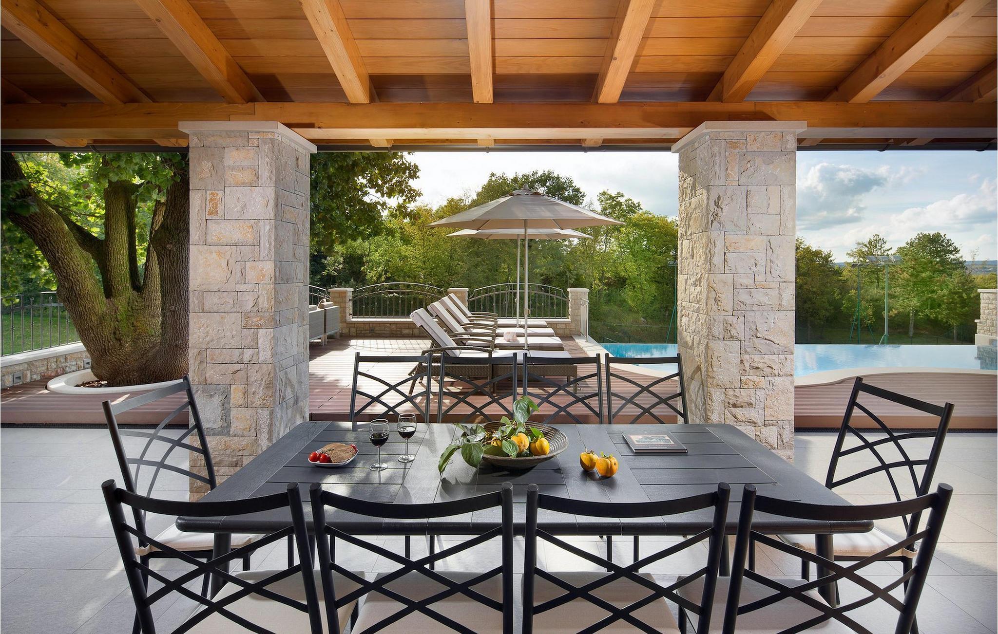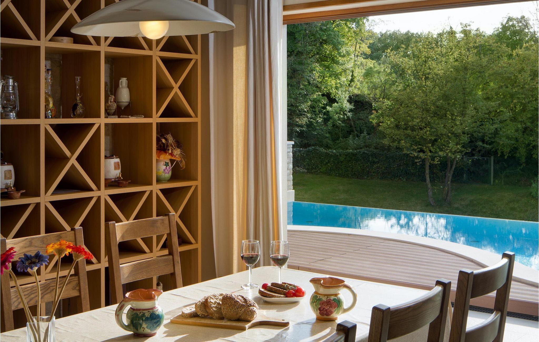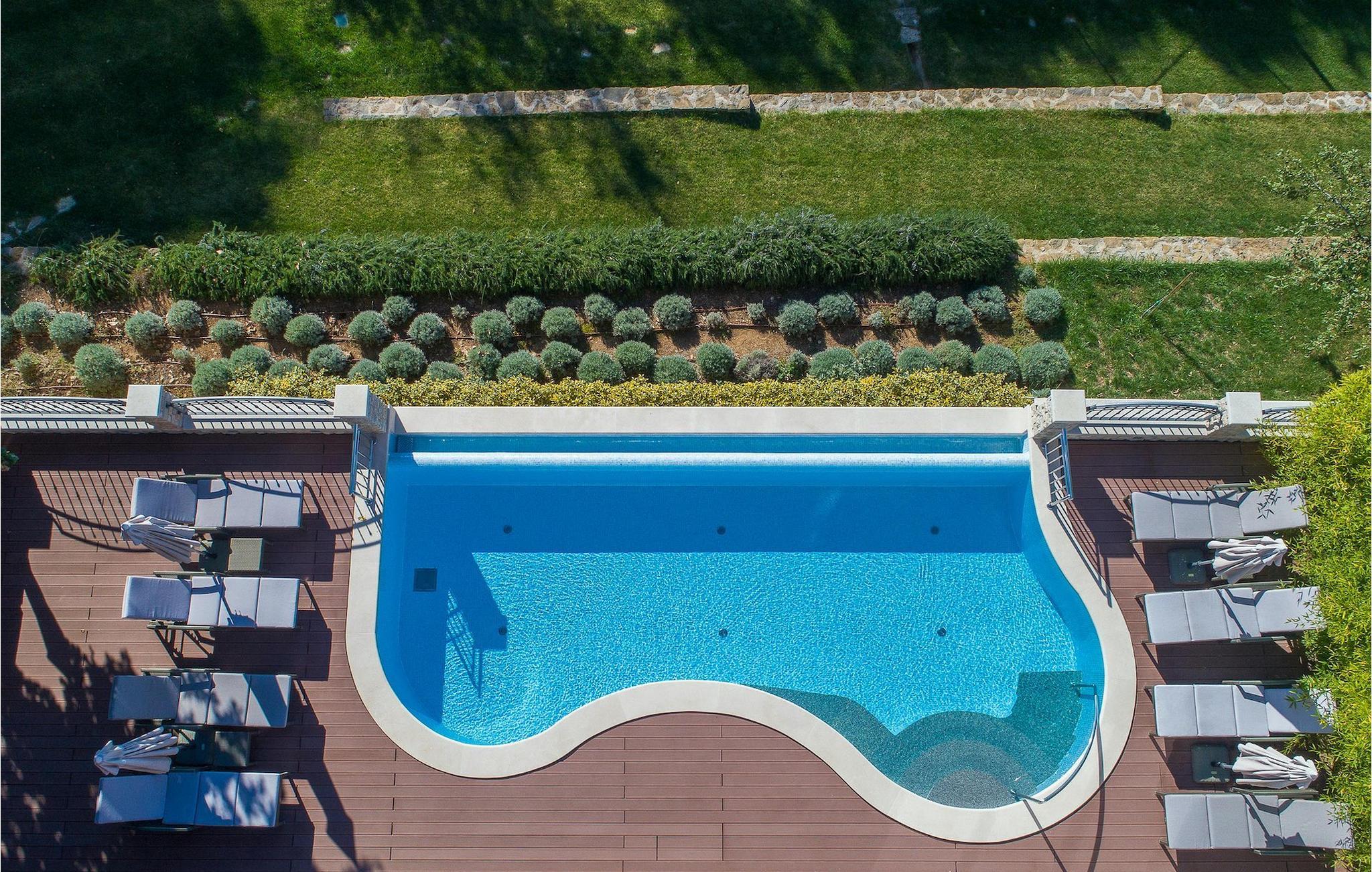 Im Erdgeschoss befindet sich ein umwerfender Wohnbereich mit komplett ausgestatteter Küche im offenen Konzept. Das wundervolles Wohnzimmer bietet eine gemütliche Familienecke mit Kamin für kalte Tage und Klimaanlage für warme aber auch einer Play Station Spielkonsole für Kinder. Im Erdgeschoss befindet sich noch ein Zimmer mit Doppelbett und einem en-suite Badezimmer. Falls Sie gerne kochen und neue Spezialitäten ausprobieren bietet diese Villa eine einmalige geräumige Taverne mit inklusive komplett ausgestatteter Küche. Ideal für lange Abende mit der Familie, Speisen frisch vom Kamin aber auch ruhige Kaffeepausen mit Blick auf den einladenden Pool. Im ersten Stock befinden sich 3 geräumige, stilvoll eingerichtete Schlafzimmer mit Doppelbetten, Klimaanlagen, Zentralheizung, TV und En-Suite Badezimmern mit Fußbodenheizung. 2 Zimmer haben einen Ausgang zur 13 m2 großen Terrassen mit Sitzgarnitur und schönem Blick auf den Garten und die grüne, bergige Umgebung.