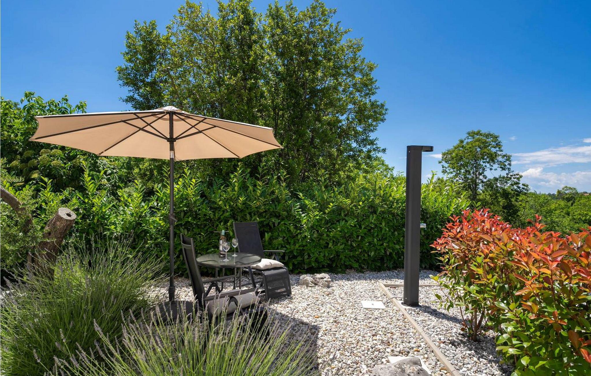 Auf umzäuntem und gepflegten Grundstück stehen den Gästen ein Pool, Sonnenliegen, Außendusche, Sitzgarnitur, Gemüsegarten und mehrere Parkplätze zur Verfügung. Neben dem Pool gibt es eine überdachte und geschlossene Sommerküche mit Kamin, Herd und Kaffeemaschine, mit Blick zum Pool und Wald ist es für den ganztäglichen Aufenthalt geeignet. Das Haus liegt am Rande eines kleinen Ortes, südwestlich gelegen und somit genießt es den ganzen Tag Sonne. Die nächste Stadt ist Labin, ca. 3 km entfernt, Kieselstrände sind in Rabac zu erreichen in ca. 8 km Entfernung.