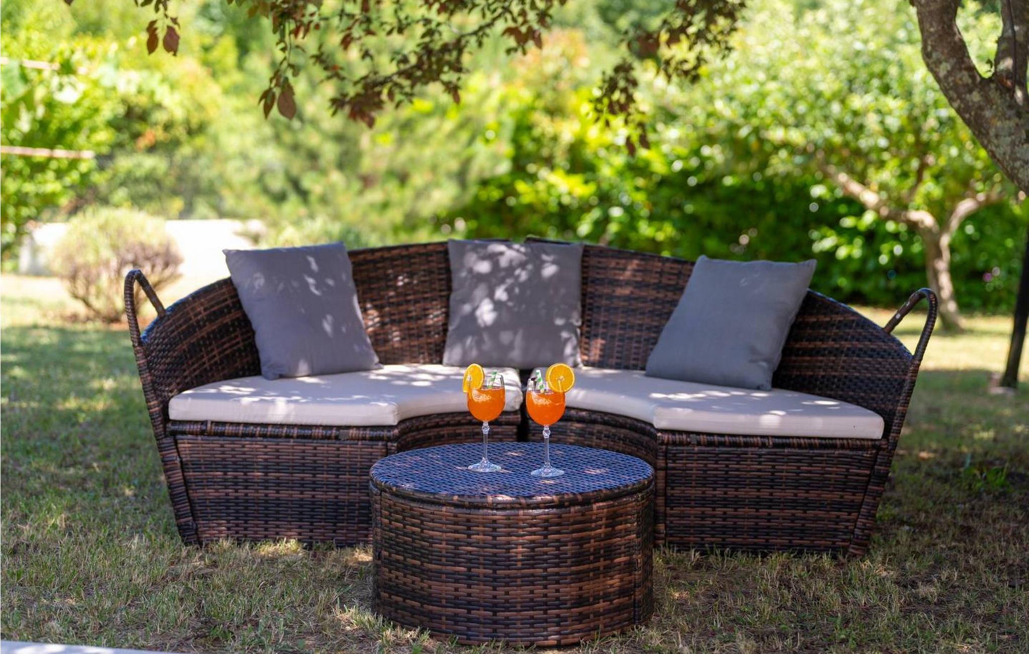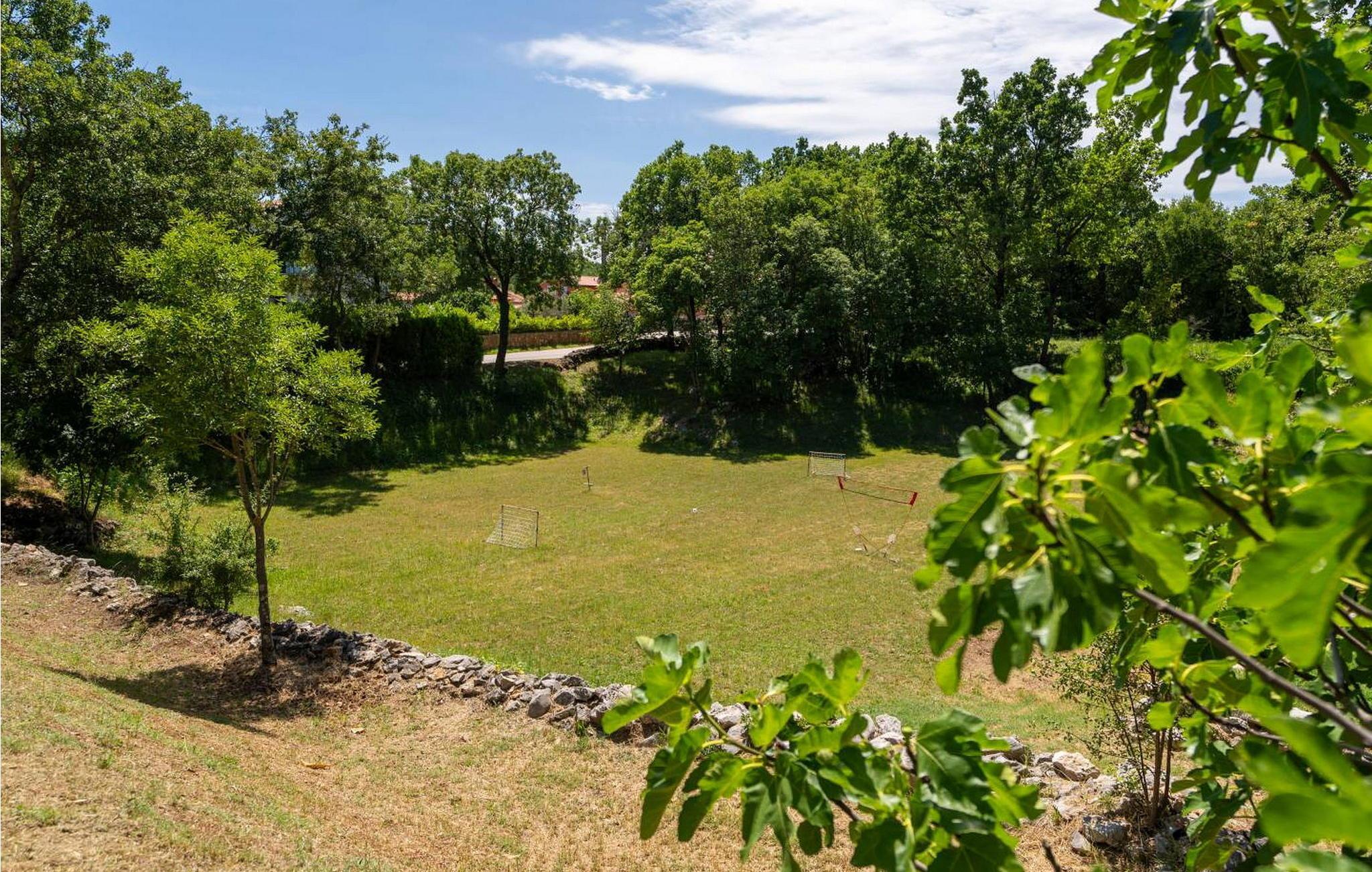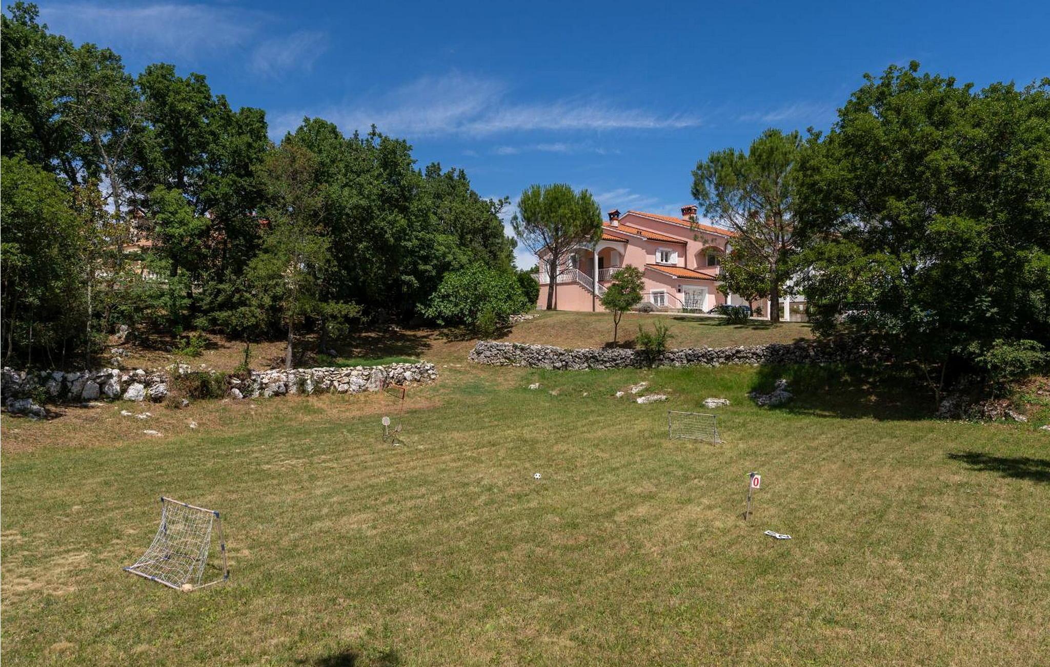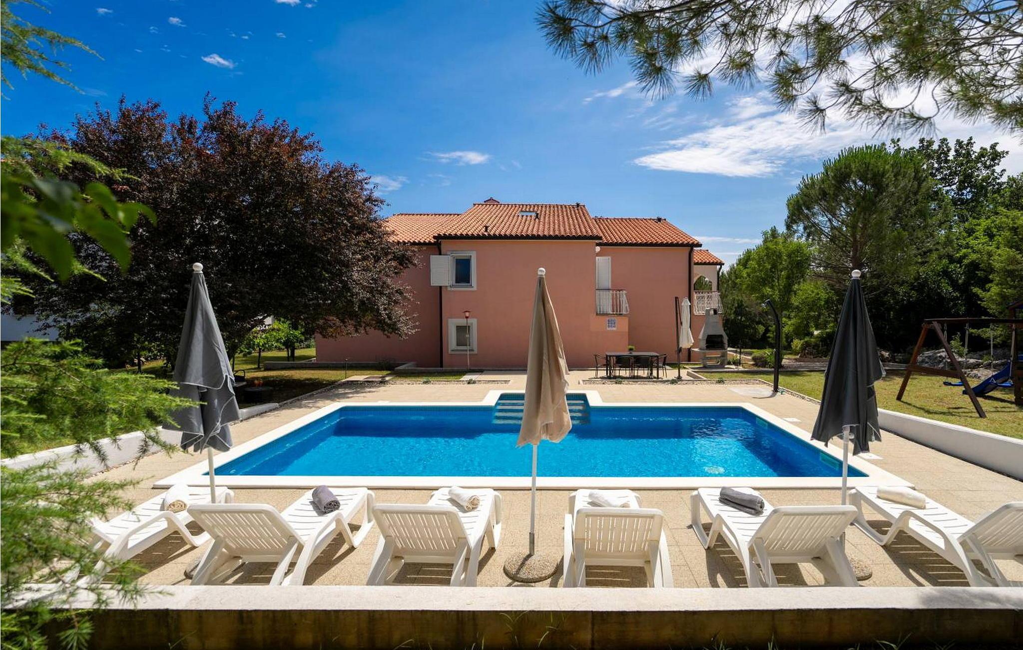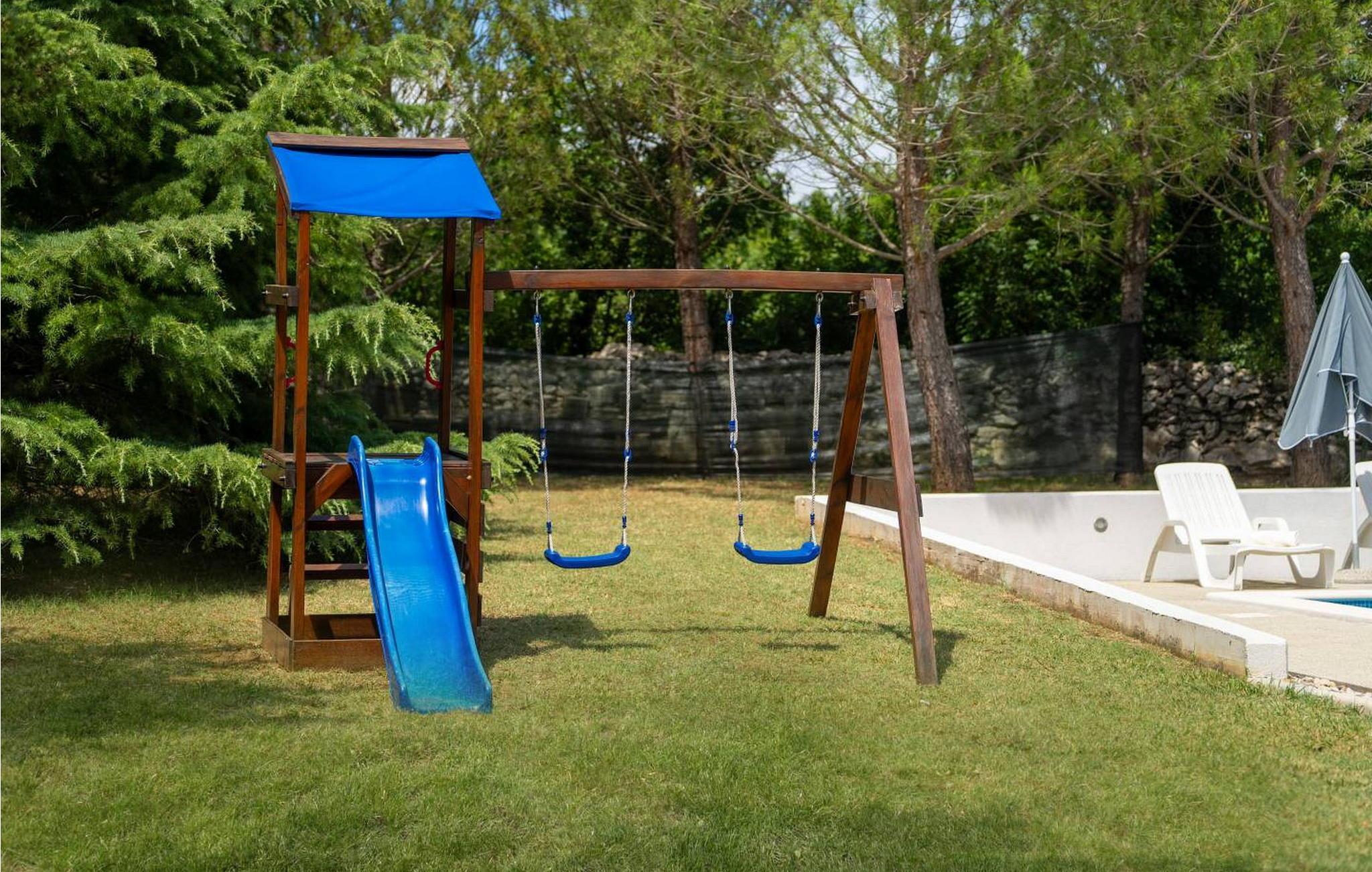 Das Haus liegt in einem großen Grundstück, in dem den Gästen ein Swimmingpool, Liegestühle zum Sonnenbaden, Schaukeln für Kinder, Sitzgelegenheiten, eine Feuerstelle, mehrere Parkplätze und eine Wiese mit einem Badmintonnetz und kleinen Fußballtoren zum Verweilen und Spielen mit Kindern zur Verfügung stehen.