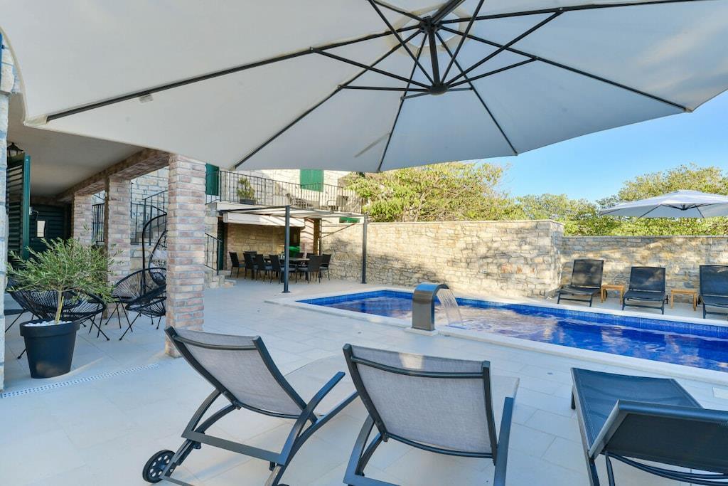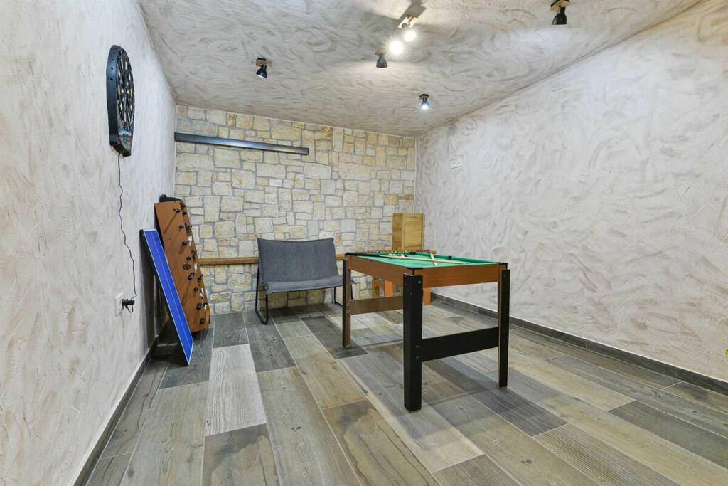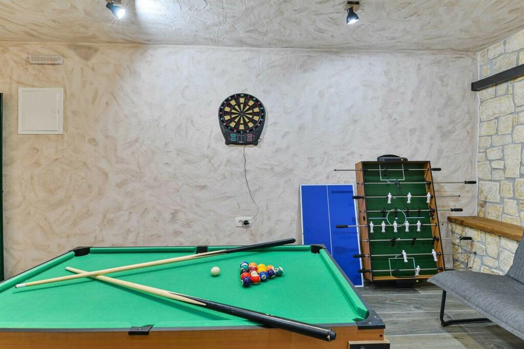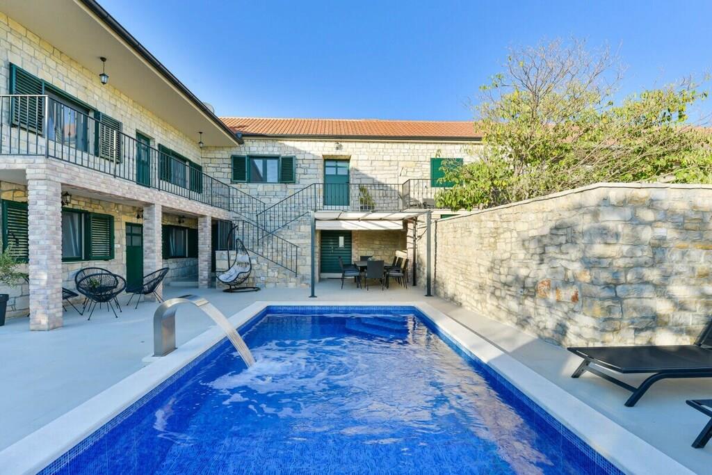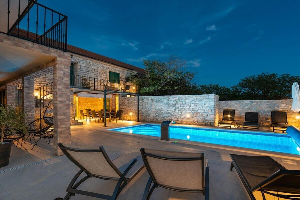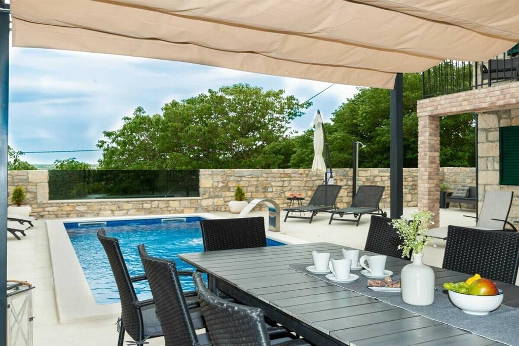 Villa Didovi Snovi – das Ferienhaus mit atemberaubender Innenarchitektur, einem wunderschönen Innenhof und herrlichem Blick auf Wiesen, wo Sie während Ihres Urlaubs in Kroatien wertvolle Erinnerungen schaffen werden. Villa Didovi Snovi liegt im idyllischen Dorf Lišane, nur eine kurze Fahrt von der schönen Stadt Skradin entfernt. Dieses fantastische Anwesen ist der perfekte Ort, um einen schönen, erholsamen Urlaub abseits der überfüllten Touristenziele zu verbringen. Das Innere der Villa erstreckt sich über eine Fläche von 140m2 und bietet Platz für bis zu 10 Gäste in fünf stilvoll eingerichteten Schlafzimmern. Die Villa verfügt über eine Gästetoilette und drei Badezimmer mit Dusche und allen wichtigen Badutensilien wie Waschmaschine, Handtücher, Fön usw. Den Gästen steht auch eine voll ausgestattete Küche mit hochwertigen Geräten zur Verfügung, die mit einen kleineren Essbereich für einen schnellen Snack. Das geräumige und gemütliche Wohnzimmer ist der ideale Ort in der Villa für Entspannung und Unterhaltung für die ganze Familie, da es mit einer bequemen Couch, Sat-TV und Klimaanlage ausgestattet ist. Hervorzuheben ist die hervorragende dalmatinische Taverne mit großer Grillstation und zweiter voll ausgestatteter Küche, die den perfekten Ort bietet, um ein schönes hausgemachtes Essen für Ihre Familie und Freunde zu genießen. Die Villa bietet auch zahlreiche Unterhaltungsaktivitäten, von Tischfußball, Billard bis hin zu Darts. Umgeben von viel Grün bietet der Außenbereich einen schönen Swimmingpool mit Liegestühlen, ideal zum Entspannen und Sonnenbaden. Es gibt auch eine kleine Kinderecke für Trampolin und private Parkplätze für die Gäste der Villa. Das gesamte Grundstück der Villa Didovi Snovi ist komplett eingezäunt, so dass die Gäste ihre absolute Privatsphäre genießen können.