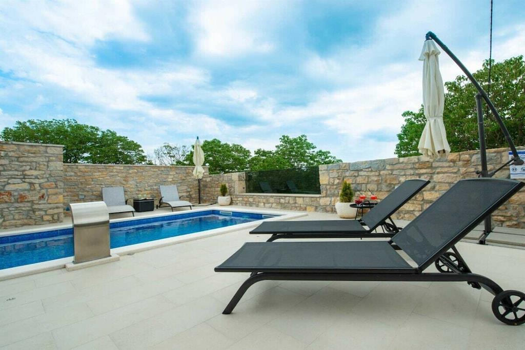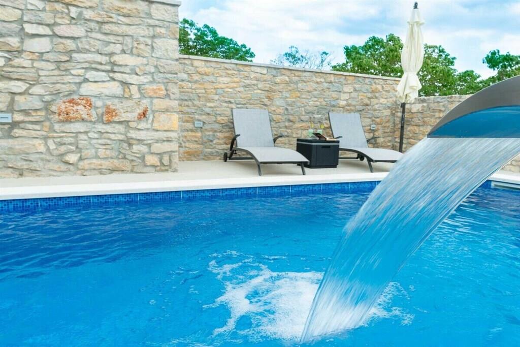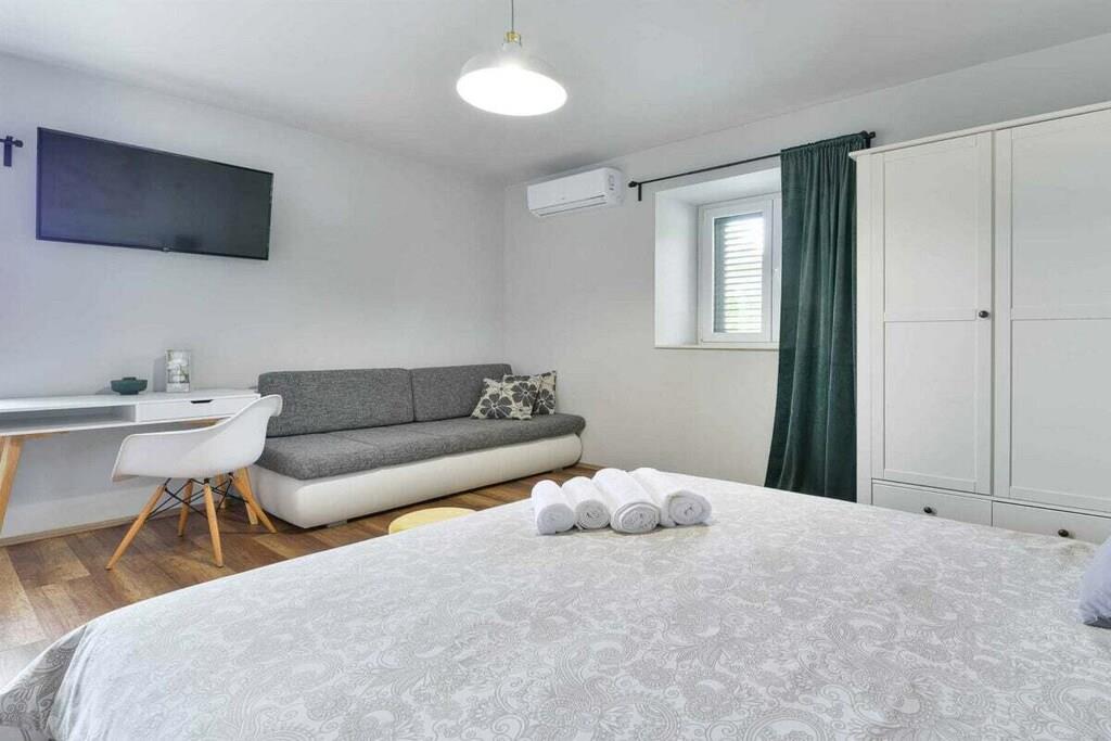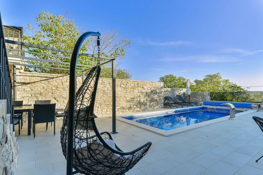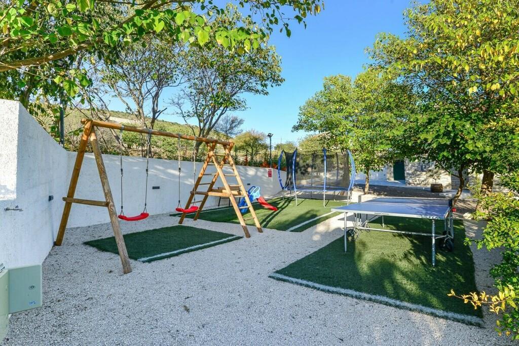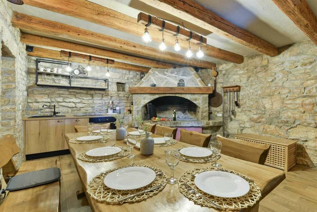 Villa Didovi Snovi – das Ferienhaus mit atemberaubender Innenarchitektur, einem wunderschönen Innenhof und herrlichem Blick auf Wiesen, wo Sie während Ihres Urlaubs in Kroatien wertvolle Erinnerungen schaffen werden. Villa Didovi Snovi liegt im idyllischen Dorf Lišane, nur eine kurze Fahrt von der schönen Stadt Skradin entfernt. Dieses fantastische Anwesen ist der perfekte Ort, um einen schönen, erholsamen Urlaub abseits der überfüllten Touristenziele zu verbringen. Das Innere der Villa erstreckt sich über eine Fläche von 140m2 und bietet Platz für bis zu 10 Gäste in fünf stilvoll eingerichteten Schlafzimmern. Die Villa verfügt über eine Gästetoilette und drei Badezimmer mit Dusche und allen wichtigen Badutensilien wie Waschmaschine, Handtücher, Fön usw. Den Gästen steht auch eine voll ausgestattete Küche mit hochwertigen Geräten zur Verfügung, die mit einen kleineren Essbereich für einen schnellen Snack. Das geräumige und gemütliche Wohnzimmer ist der ideale Ort in der Villa für Entspannung und Unterhaltung für die ganze Familie, da es mit einer bequemen Couch, Sat-TV und Klimaanlage ausgestattet ist. Hervorzuheben ist die hervorragende dalmatinische Taverne mit großer Grillstation und zweiter voll ausgestatteter Küche, die den perfekten Ort bietet, um ein schönes hausgemachtes Essen für Ihre Familie und Freunde zu genießen. Die Villa bietet auch zahlreiche Unterhaltungsaktivitäten, von Tischfußball, Billard bis hin zu Darts. Umgeben von viel Grün bietet der Außenbereich einen schönen Swimmingpool mit Liegestühlen, ideal zum Entspannen und Sonnenbaden. Es gibt auch eine kleine Kinderecke für Trampolin und private Parkplätze für die Gäste der Villa. Das gesamte Grundstück der Villa Didovi Snovi ist komplett eingezäunt, so dass die Gäste ihre absolute Privatsphäre genießen können.