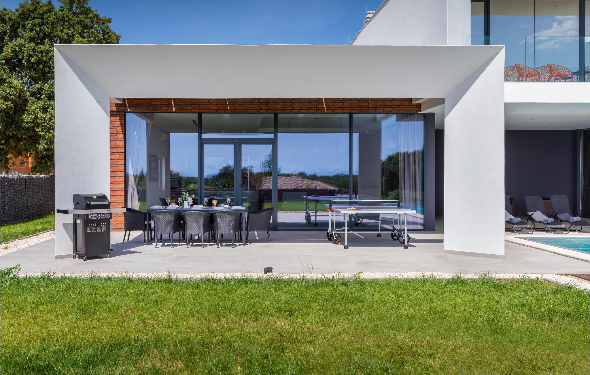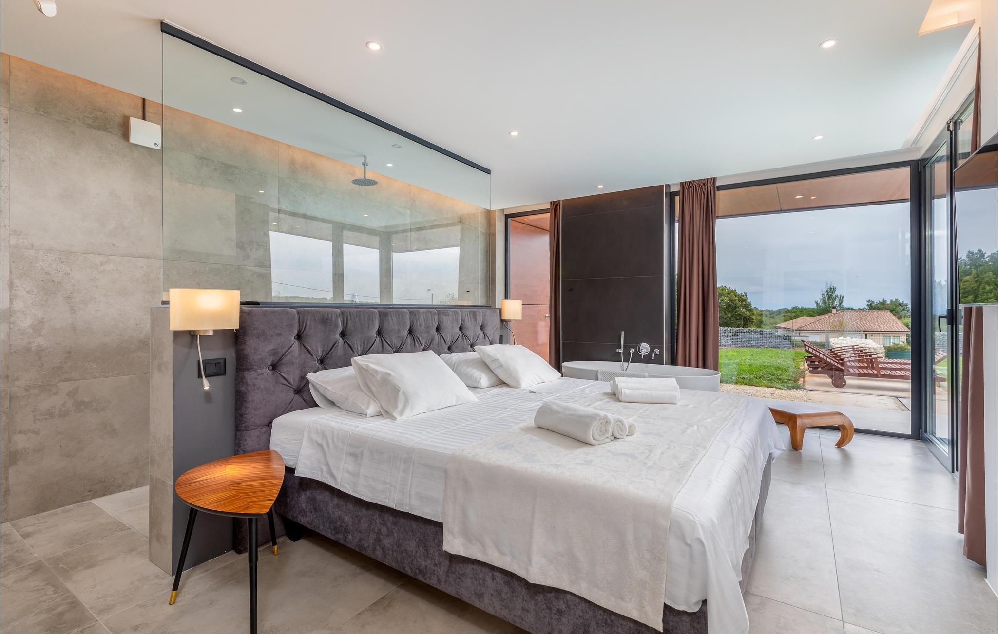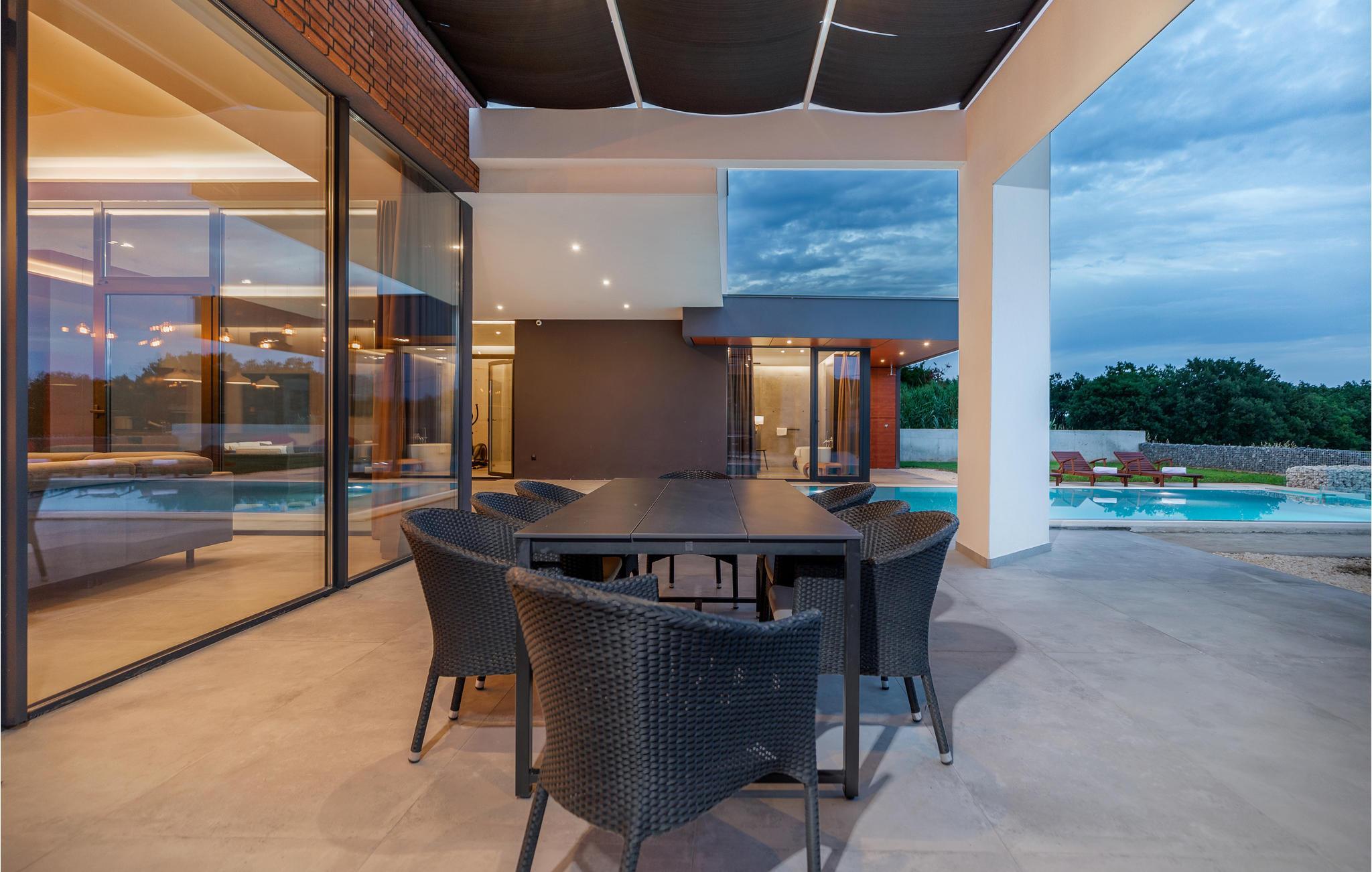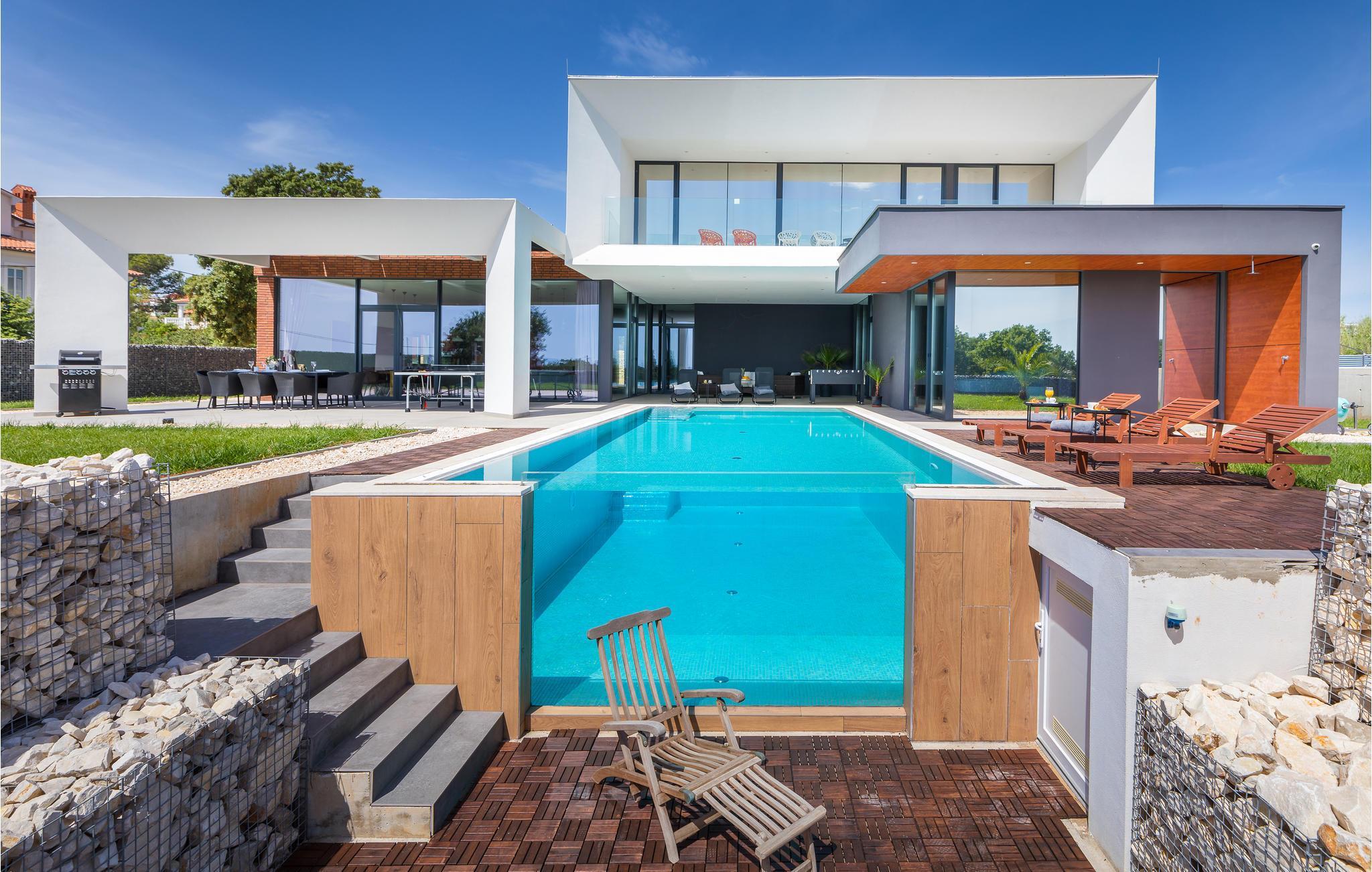 Dieses architektonisch beeindruckende Ferienhaus liegt in der Nähe des Meeres und befindet sich an der südlichsten Spitze Istriens im kleinen Fischerdorf Ližnjan. Das 2021 fertig gestellte Haus bietet einen schönen Blick auf das Meer und die Inseln Cres und Lošinj. Die Architektur dieser Villa wurde von den renommiertesten kroatischen Zeitschriften für Design und Architektur veröffentlicht. Die Zimmer sind modern eingerichtet mit viel Licht und Glasflächen. Das Haus ist für Menschen mit Behinderung geeignet, da das gesamte Erdgeschoss keine Treppen hat. Der Pool ist nur 2 m vom Bett des unteren Zimmers entfernt.