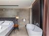 Der beheizte Pool ist eine besondere Attraktion mit Überlauf auf drei Seiten, während sich auf einer Seite ein massiver Glasfelsen befindet, durch den Sie Wasser und Schwimmer wie im Aquarium sehen können. Er verfügt über die neueste Wasserqualitätsbehandlungstechnik und eine verbesserte therapeutische Wirkung, da Chlor durch Elektrolyse auf natürliche Weise aus Salz gewonnen wird.