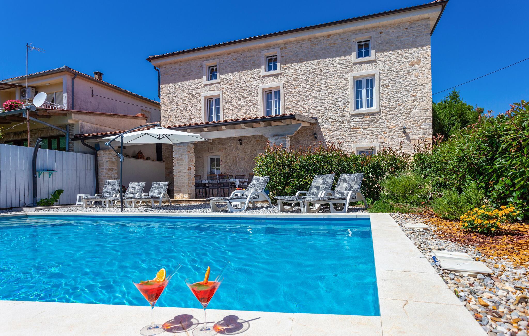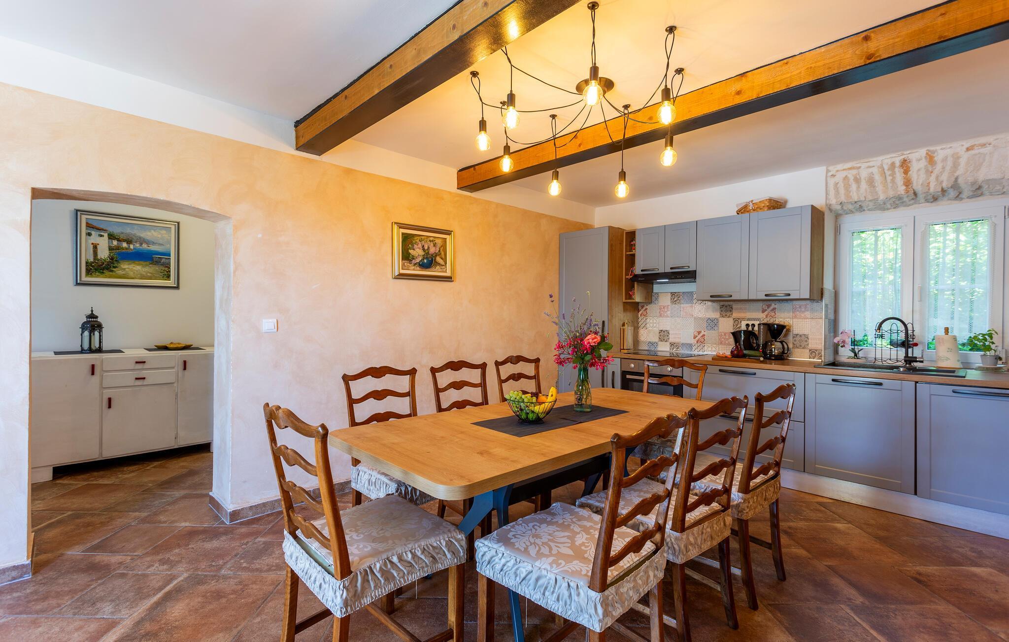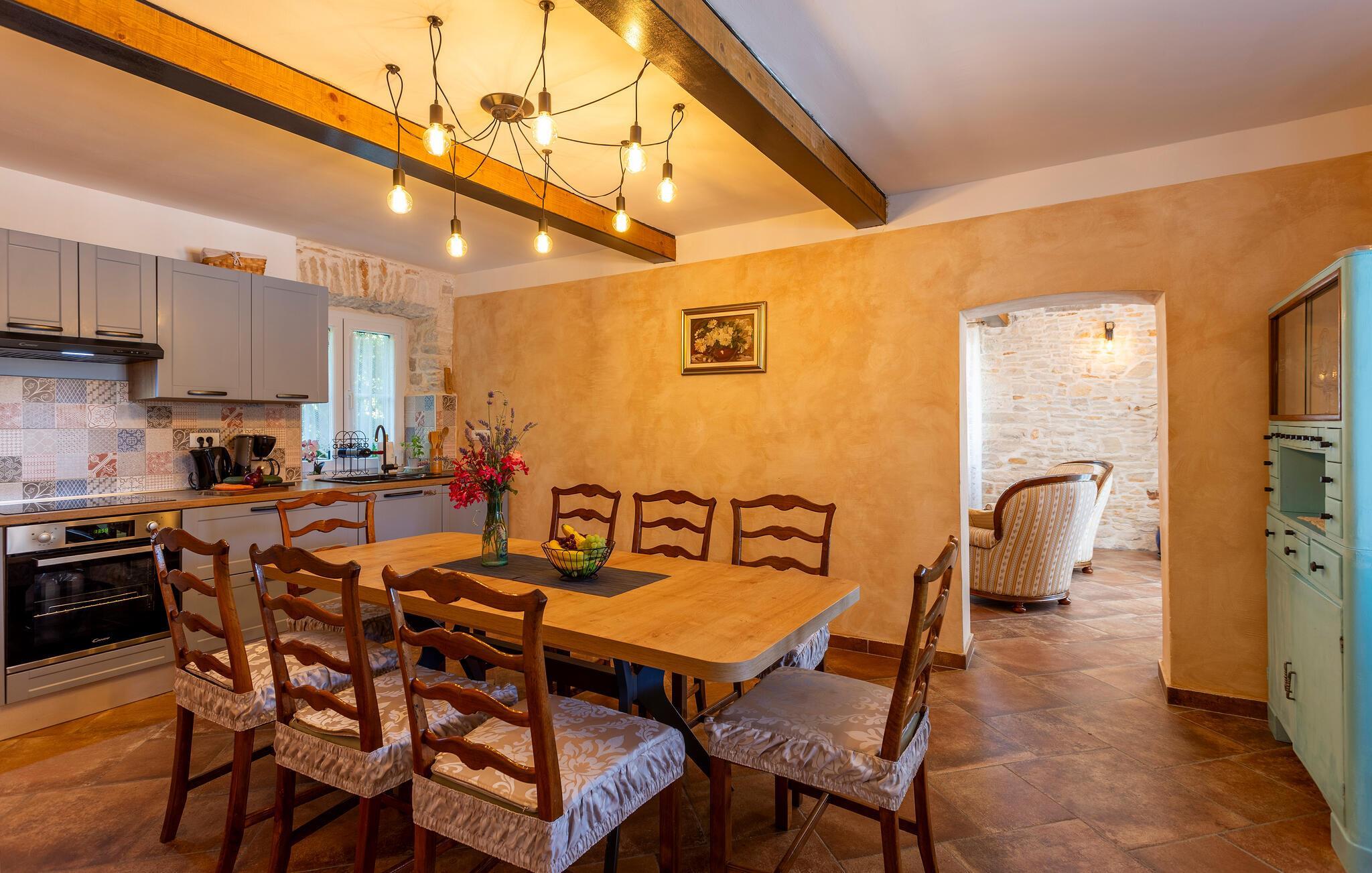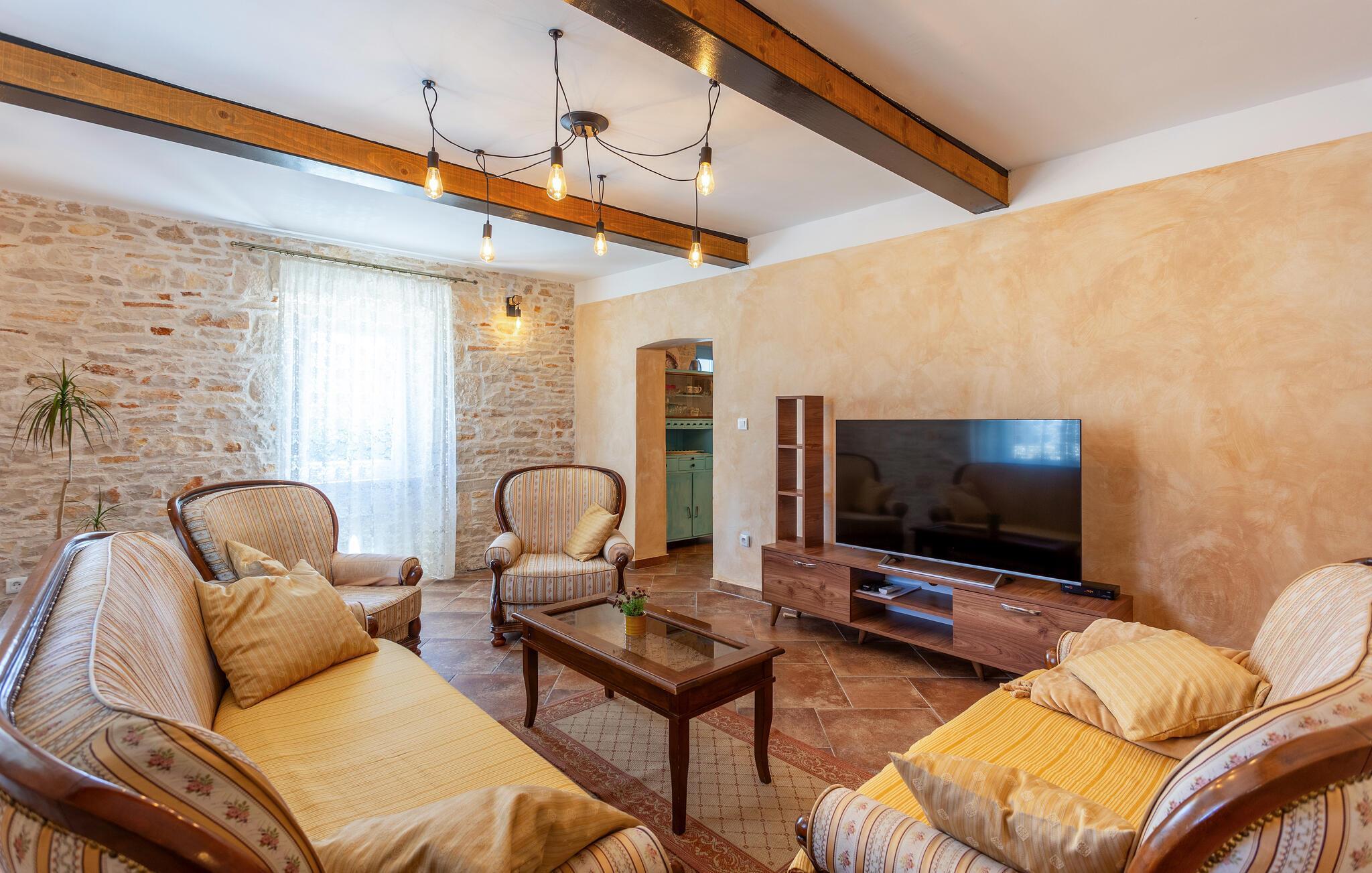 Dieses wunderschöne istrische Steinhaus vereint rustikalen Charme mit modernem Komfort. Die geschmackvoll eingerichteten Innenräume strahlen eine warme und einladende Atmosphäre aus. Im großzügigen Wohnbereich finden Sie alles, was Sie für einen erholsamen Urlaub brauchen. Veranstalten Sie einen Filmabend oder kommen in der großen Essküche zum gemeinsamen Kochen zusammen.