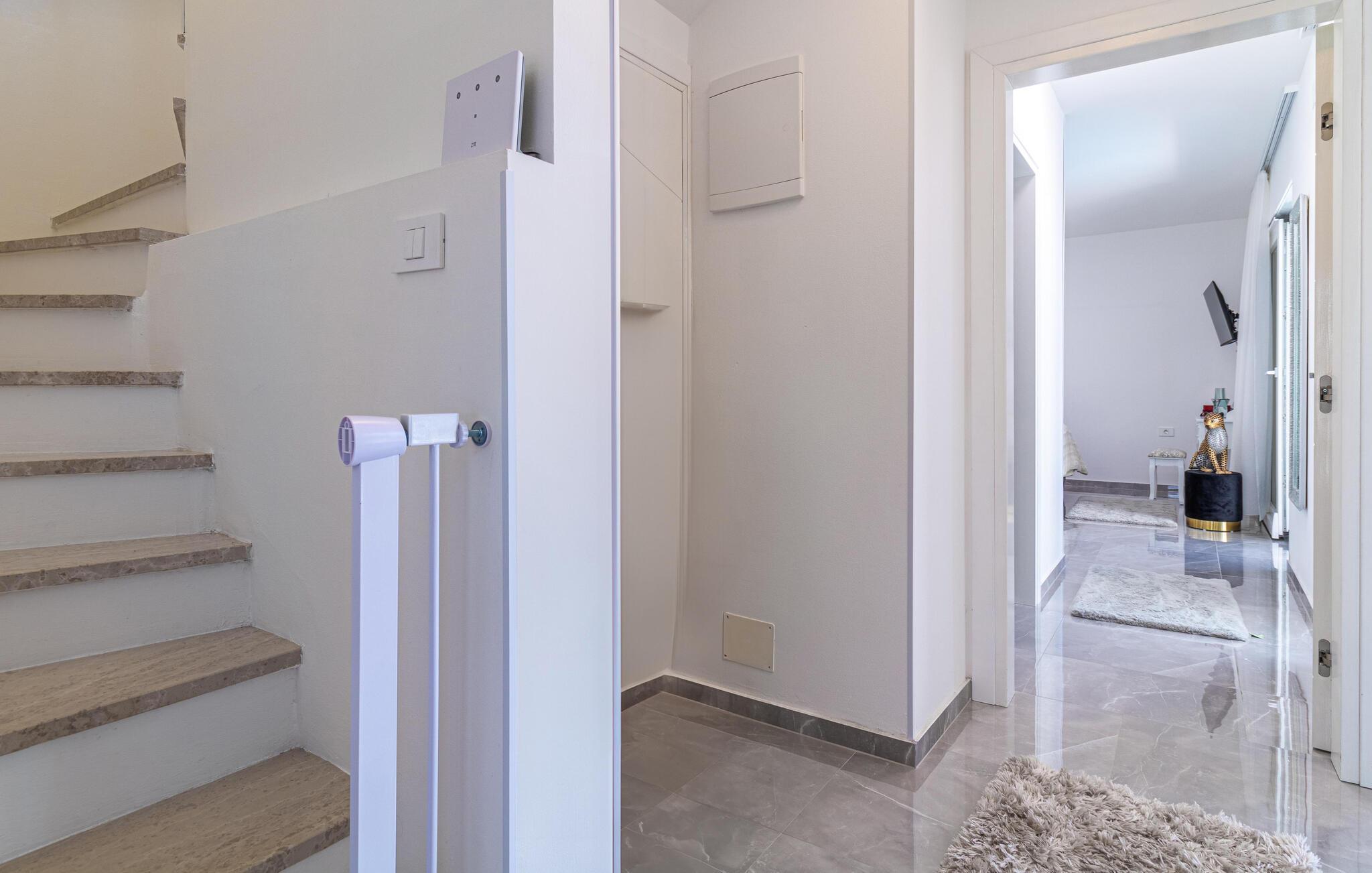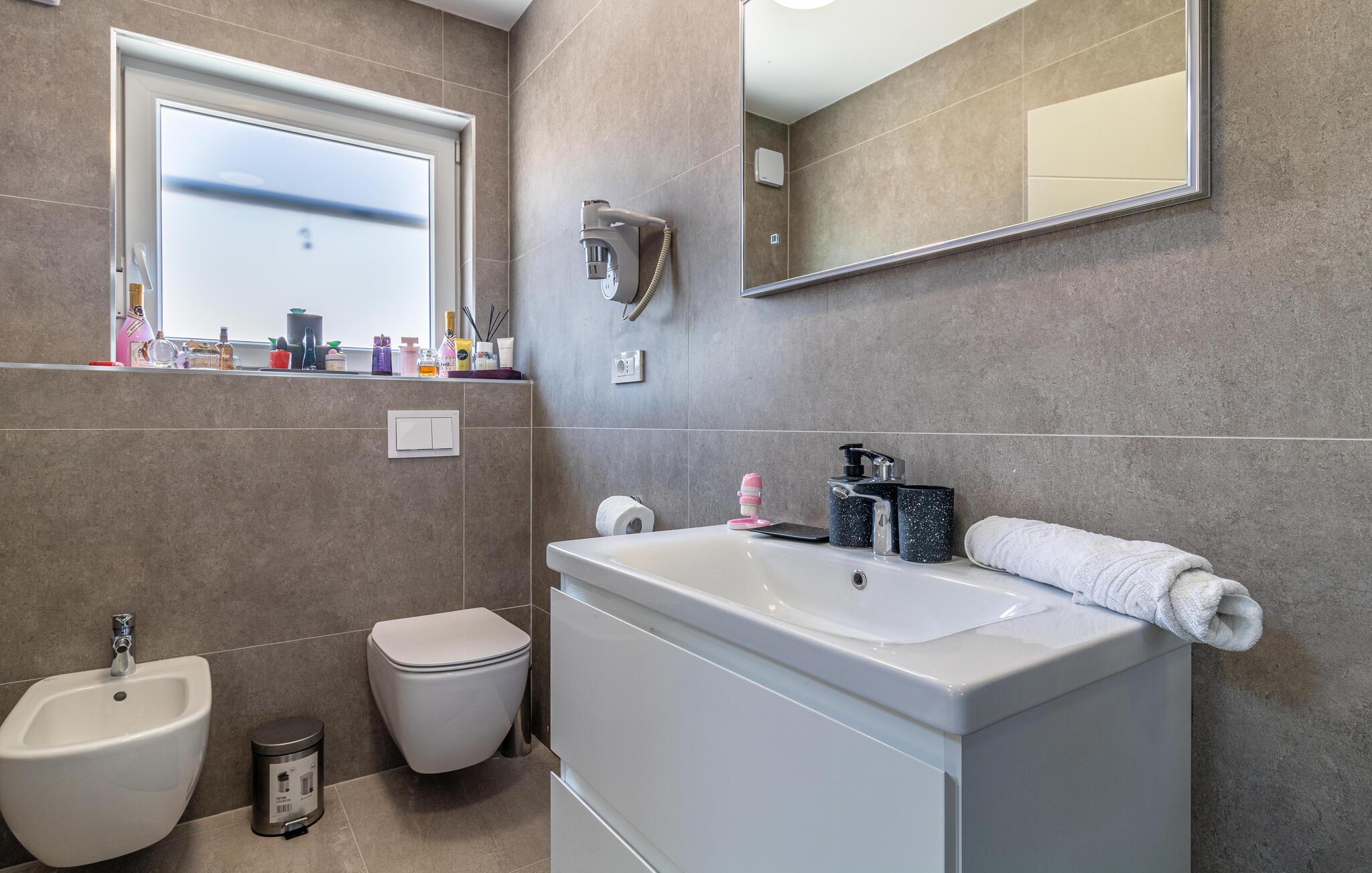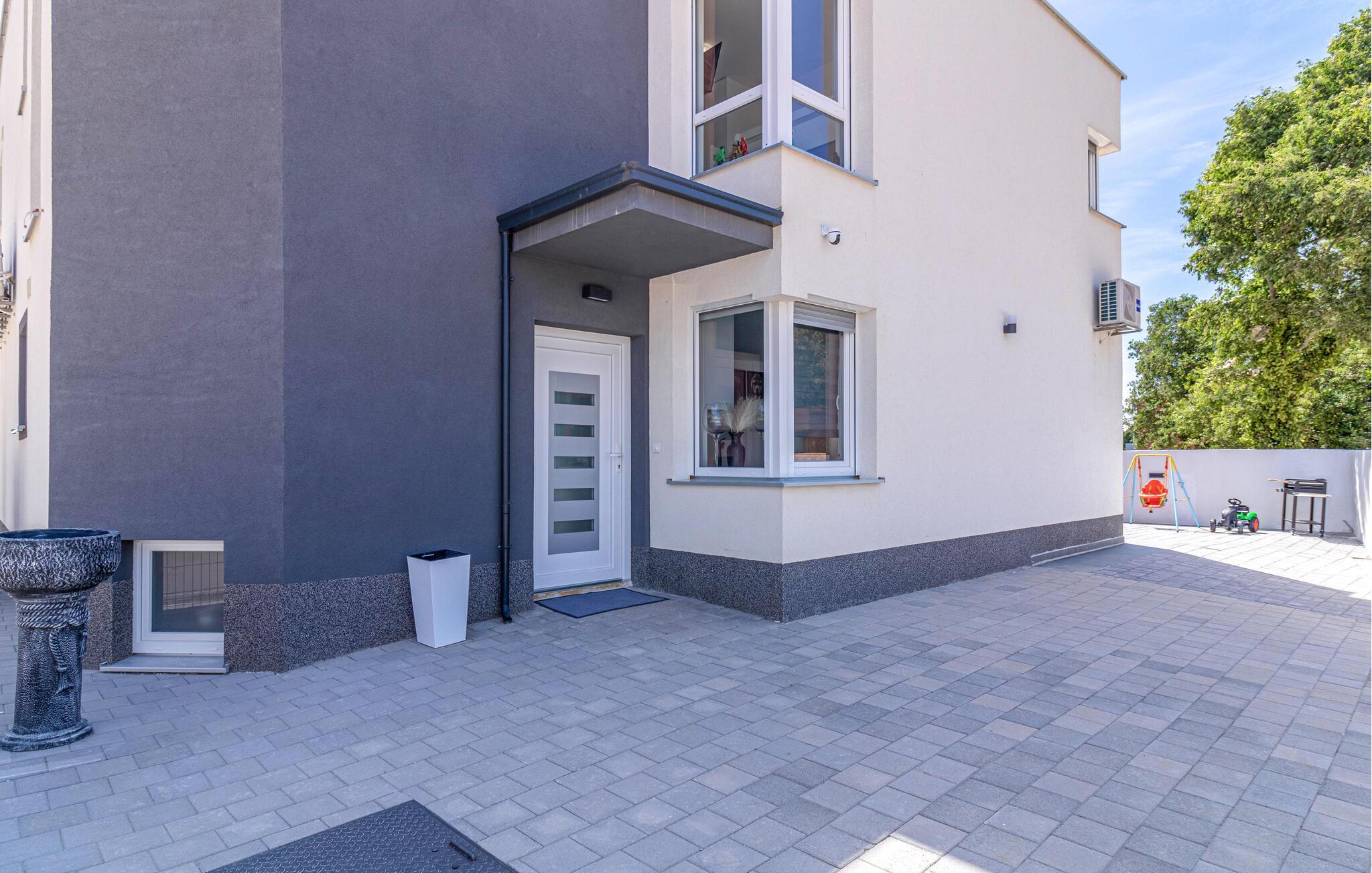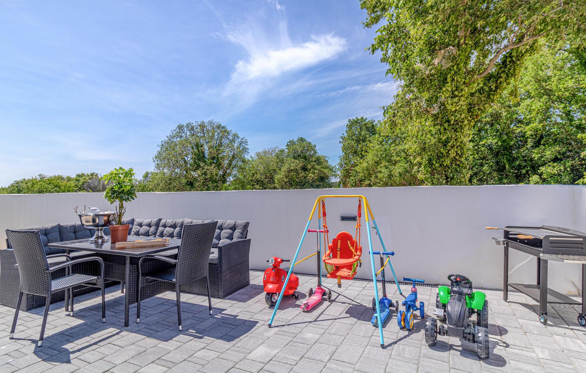 Willkommen in diesem schönen und einladenden Ferienhaus, das für eine Großfamilie mit Kindern alles bereithält. Nicht nur die komfortablen Räume, die sich durch Helligkeit und modernes Design auszeichnen, sondern auch dank der Ausstattung, Erholung versprechen. Genießen Sie die Räume, die sich über zwei Etagen verteilen und trinken Ihren Morgenkaffee auf dem Balkon, mit Blick ins Grüne. Verweilen Sie auch viele Stunden im und am Pool und nutzen die Gartenmöbel für gemeinsam Mahlzeiten und blauen Himmel. Ihre Kinder werden die Gartenumgebung mit Lachen erfüllen, denn zahlreiche Spielgeräte warten nur darauf von ihnen entdeckt zu werden.