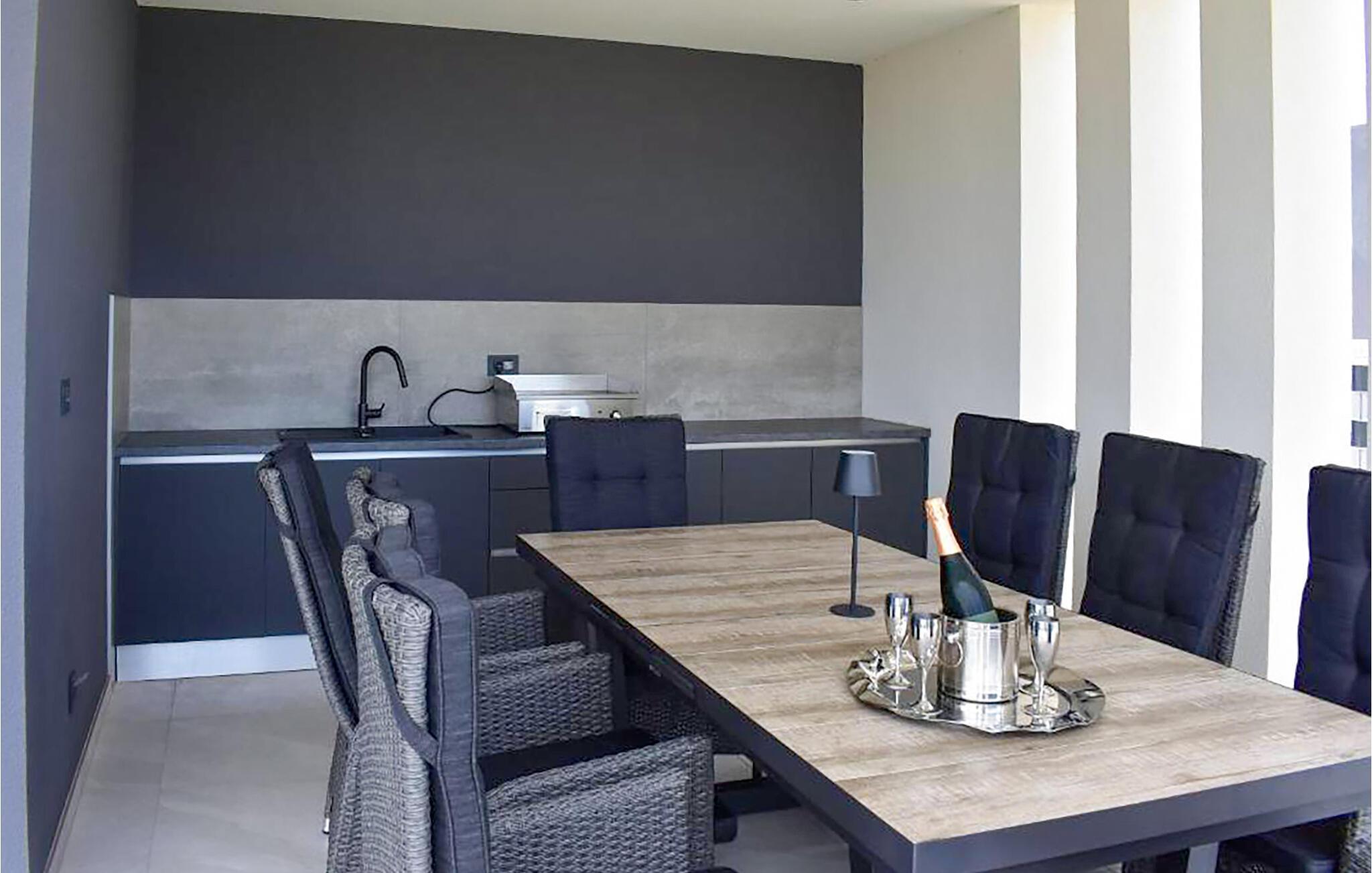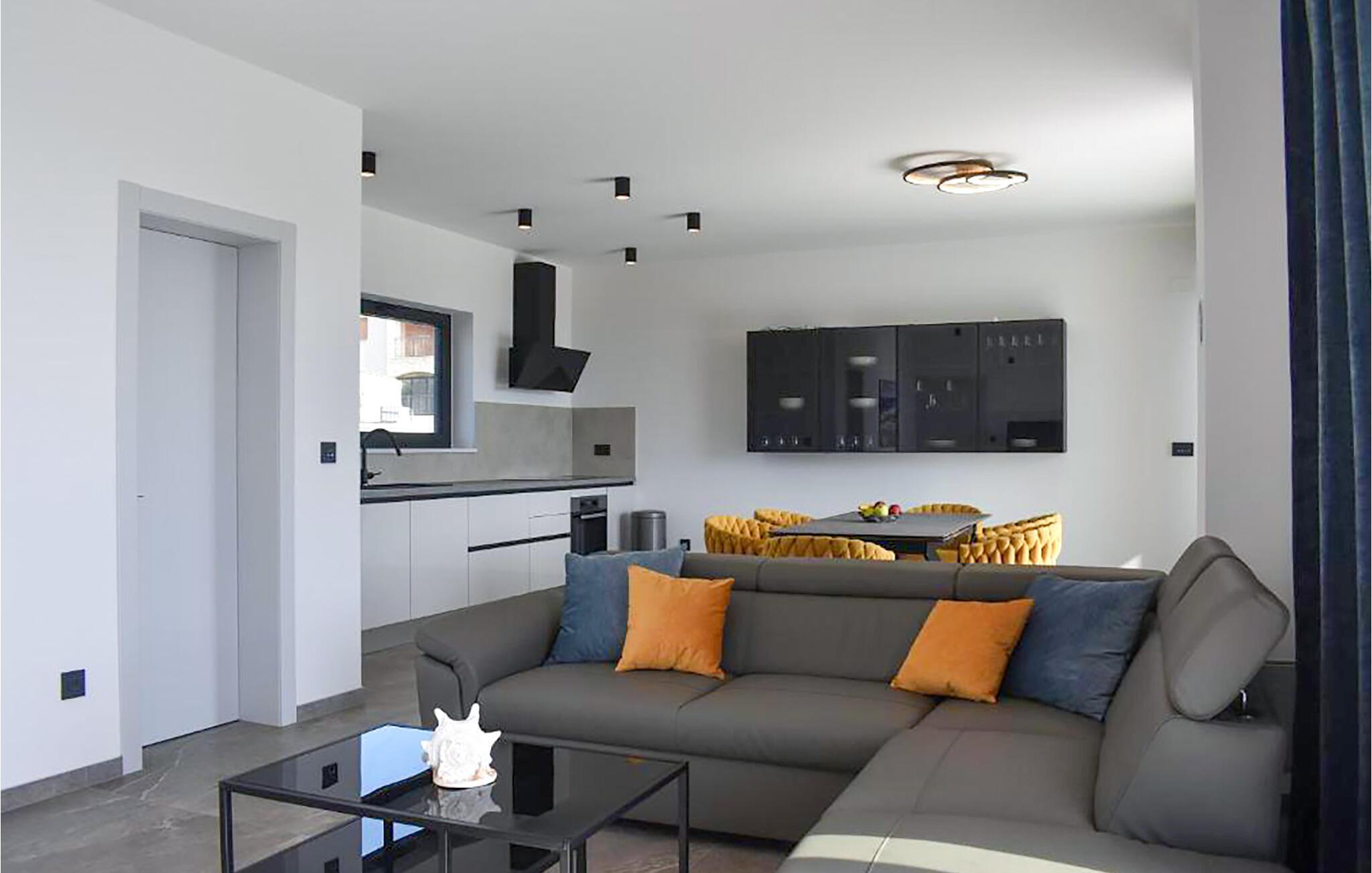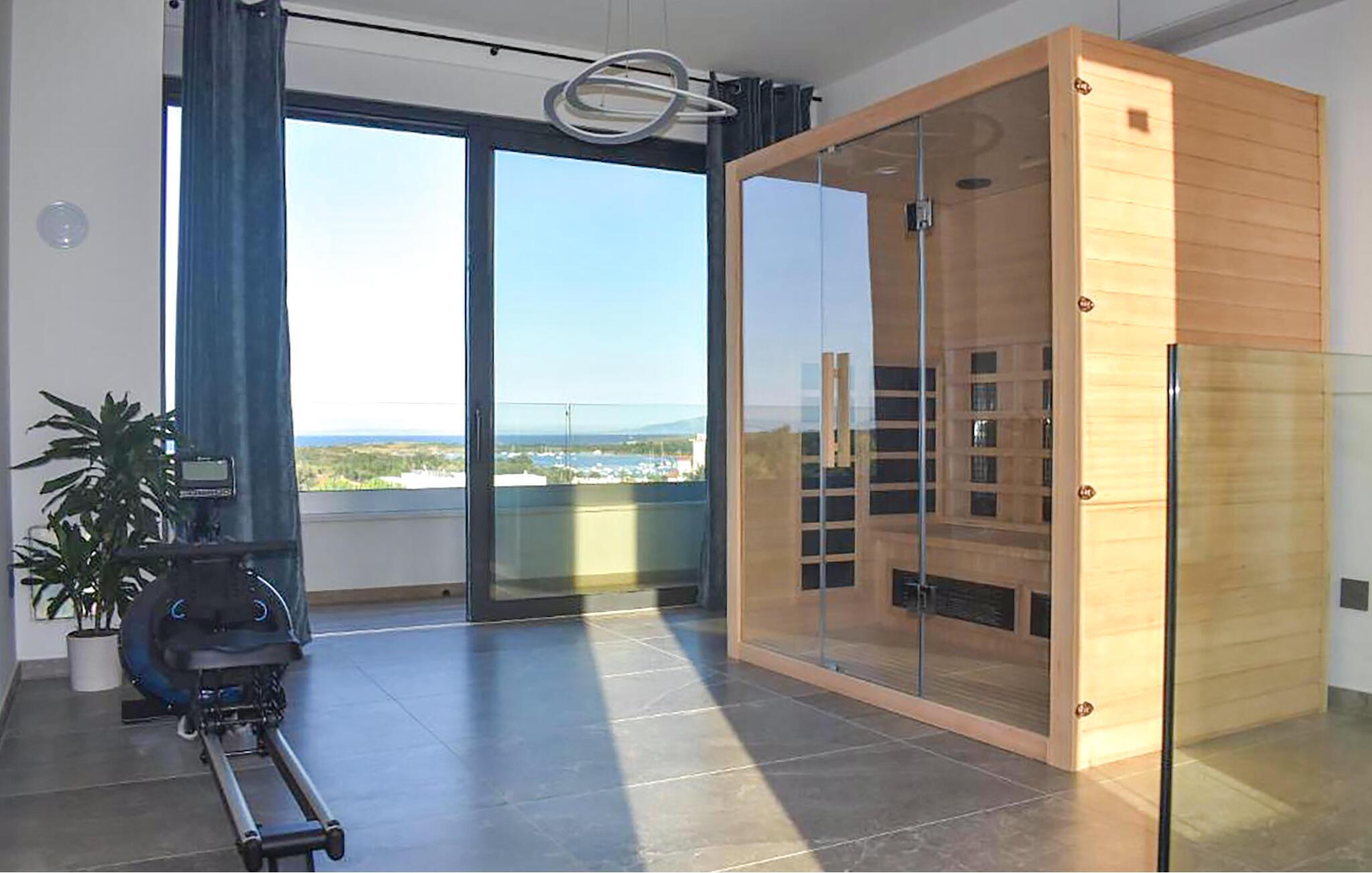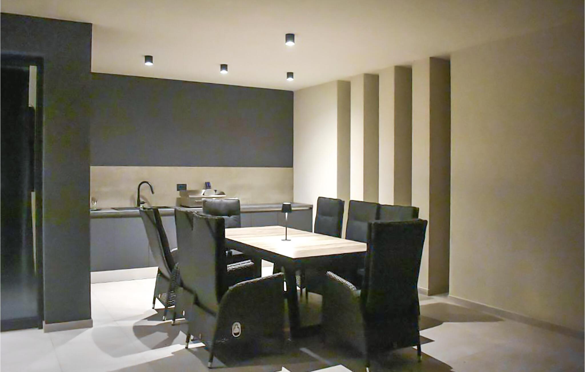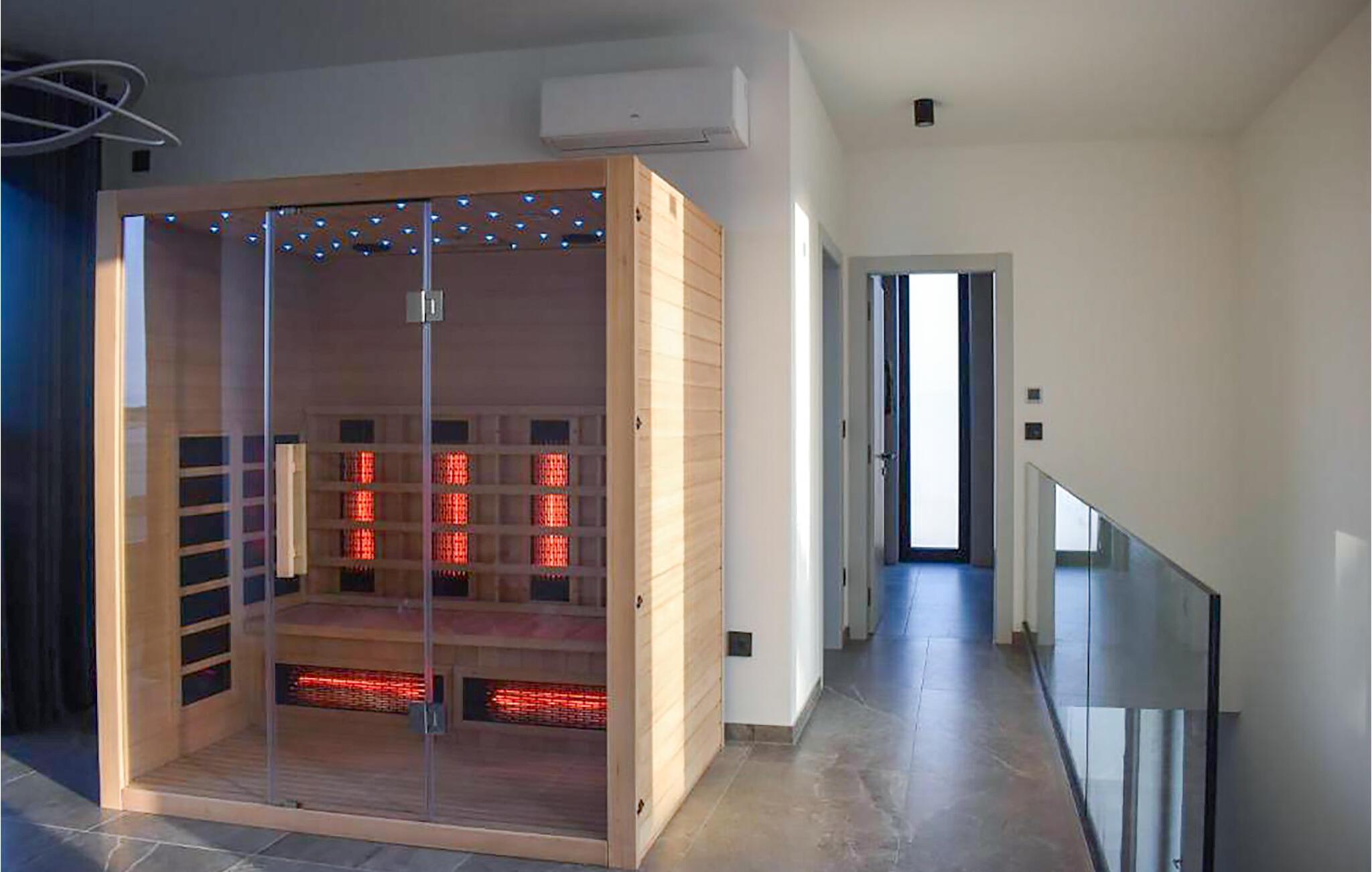 Dieses moderne Haus verbindet Komfort und Eleganz auf harmonische Weise. Große Fensterfronten lassen viel warmes Tageslicht ins Innere, während eine bequeme Sofalandschaft zu einem gemütlichen Filmabend einlädt. Bereiten Sie für sich und Ihre Lieben leckere Mahlzeiten zu oder entspannen Sie sich bei wohliger Wärme in der Infrarotkabine.