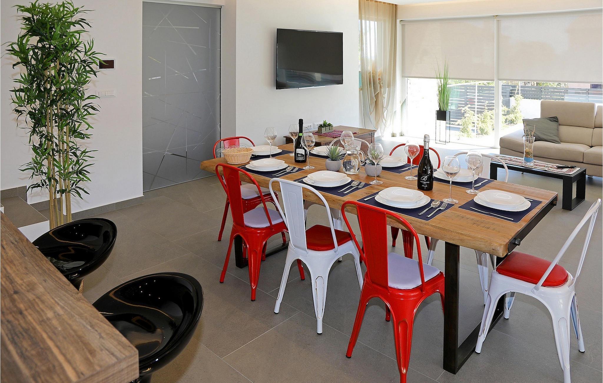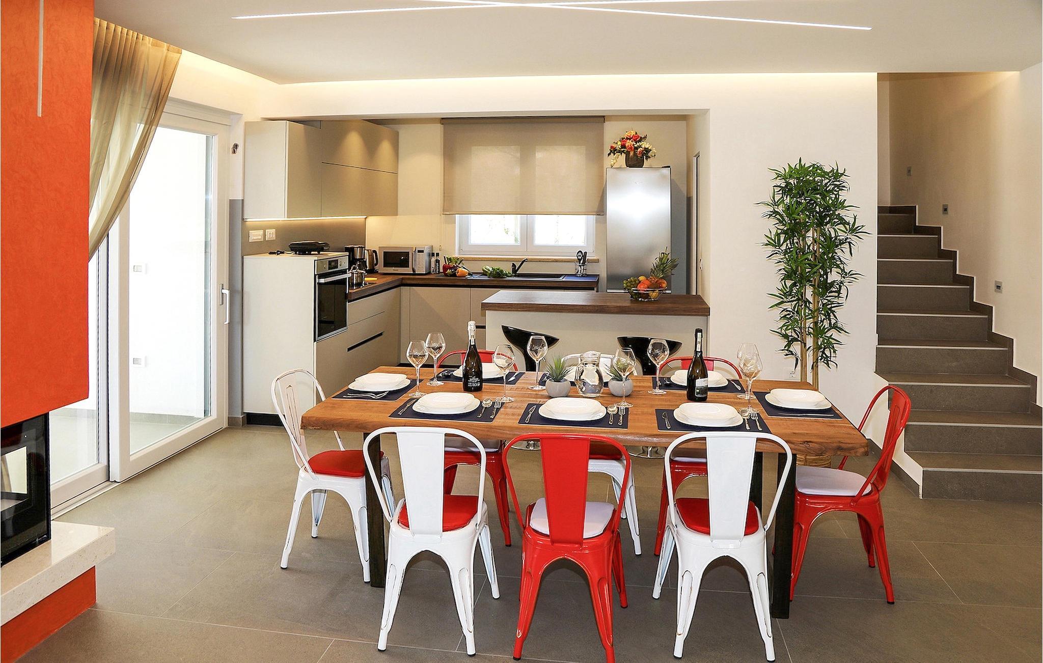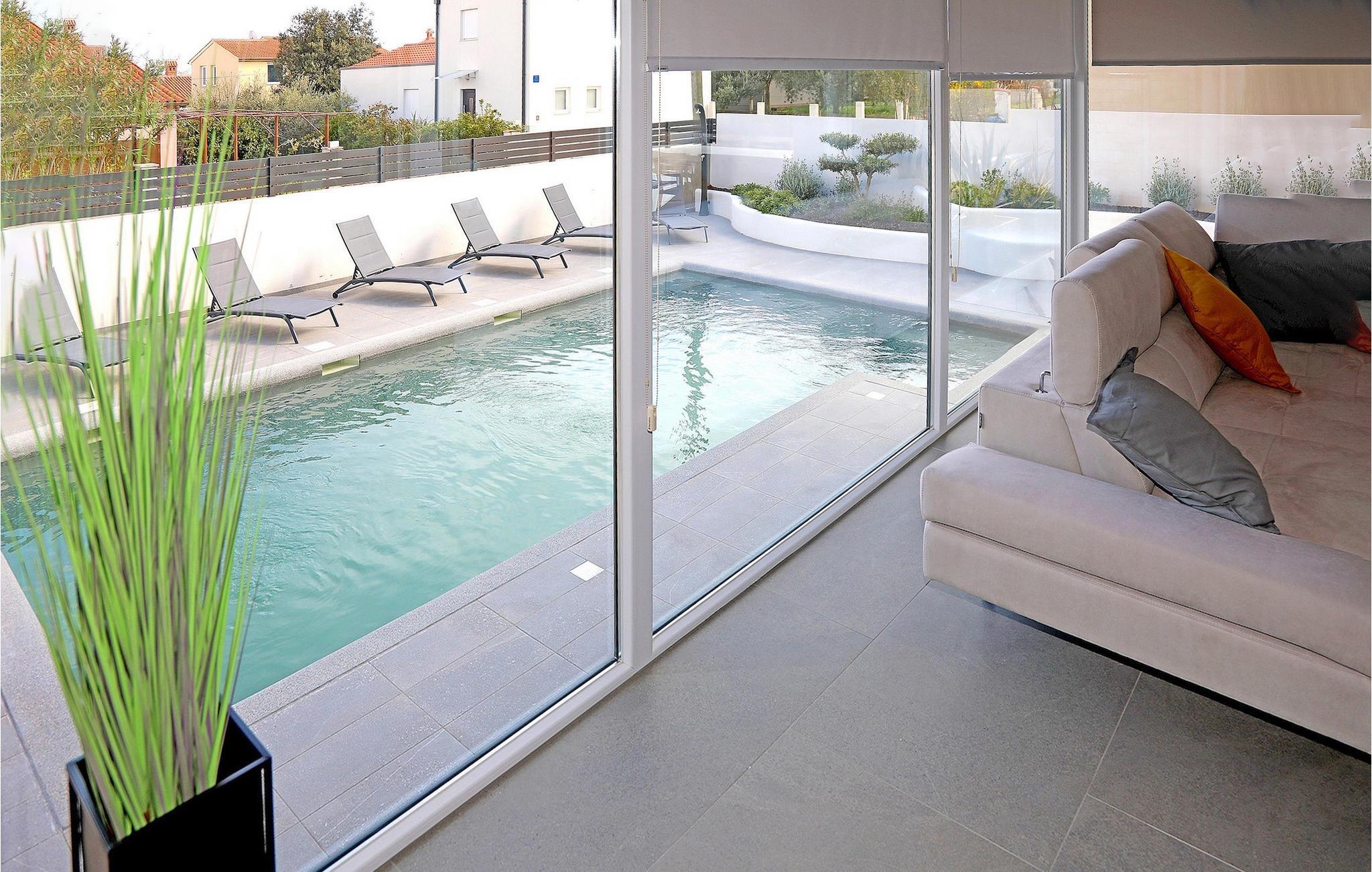 Das Innere der Villa ist modern eingerichtet und bietet Ihnen alles, was Sie für einen angenehmen Urlaub benötigen. Im Erdgeschoss der Villa befindet sich ein geräumiges Wohnzimmer mit Zugang zur Terrasse mit Pool und eine voll ausgestattete Küche mit Essbereich, sowie ein Schlafzimmer mit eigenem Bad.