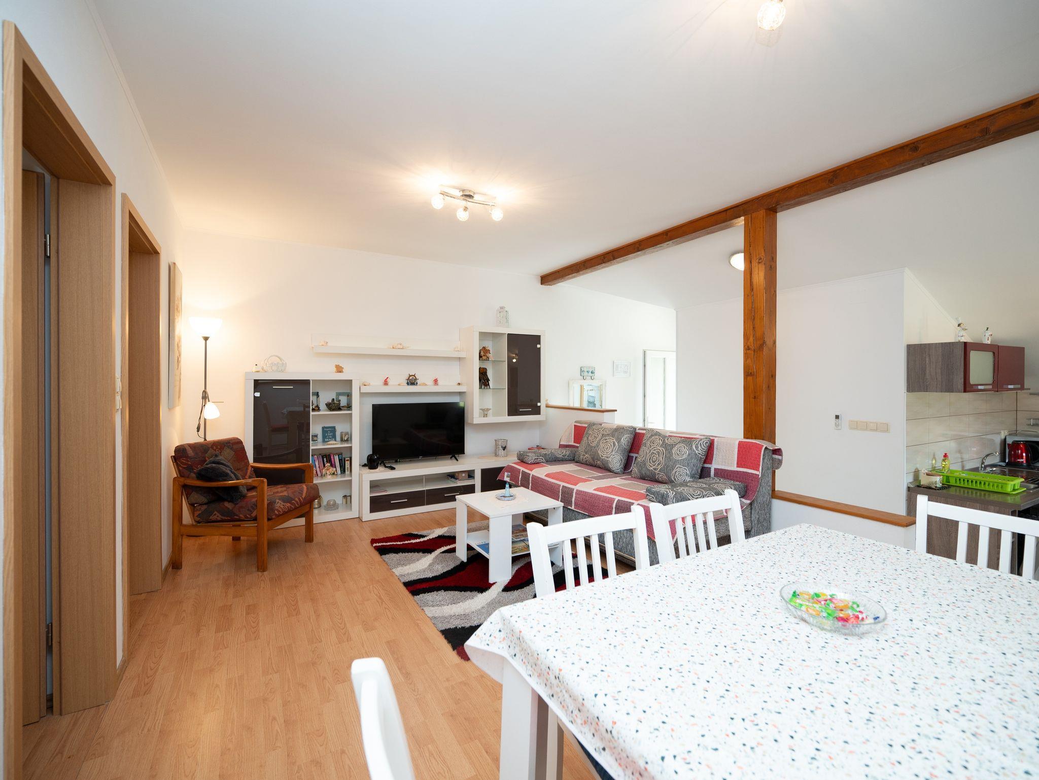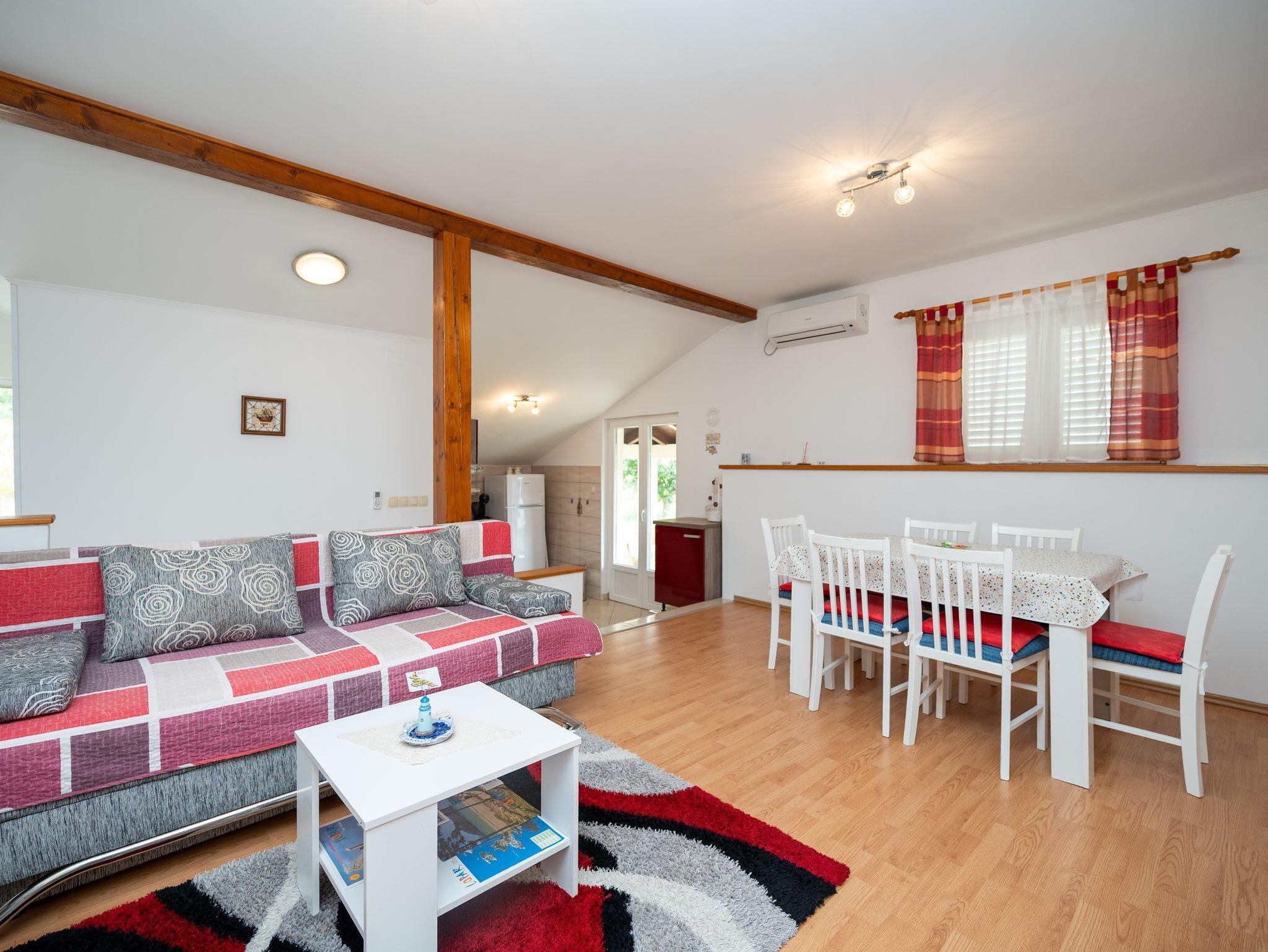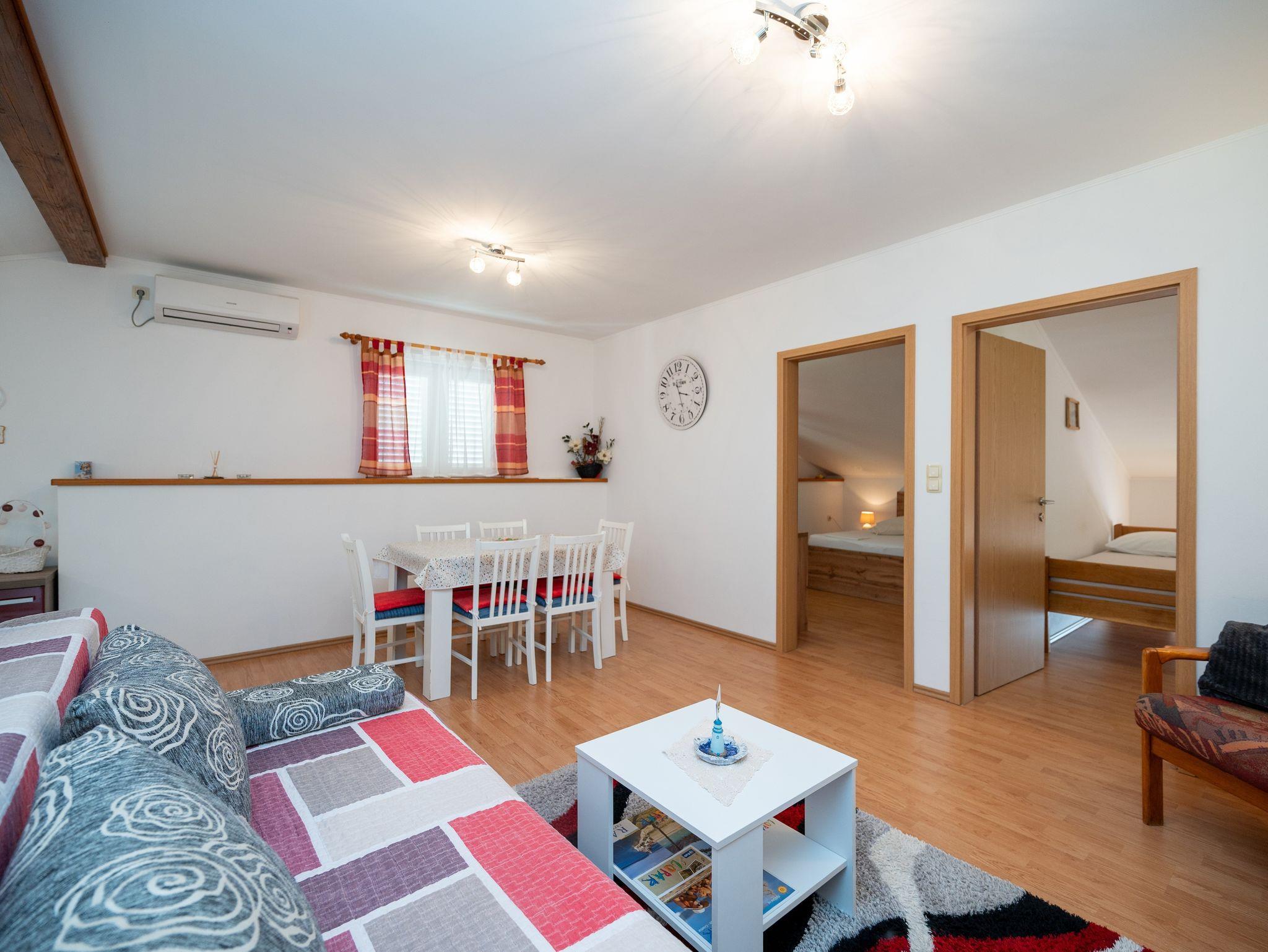 Ferienwohnung bietet Platz für 4 Gäste. Die Betten sind in Schlafzimmern, die es 2 gibt, innerhalb einer Gesamtfläche von 48m2, angeordnet. Die Gäste haben eine eigene Terrasse zur Verfügung, auf der sie in warmen Sommernächten genießen können. Das Apartment bietet Meerblick. Es ist erlaubt, Speisen auf dem Gemeinschafts-Grill vorzubereiten. In der Unterkunftseinheit besteht die Möglichkeit des Mitbringens von Haustieren gegen Aufpreis. IM PREIS INBEGRIFFEN: Kurtaxe, Endreinigung, Klimatisierung, Parkplatz, Internet, Kinderbett, Bügeleisen, Bügelbrett, Föhn. VERBINDLICHE ZUSÄTZLICHE KOSTEN: Aufzahlung für Kurzaufenthalte (prozentualer Zuschlag pro Nächtigungsanzahl: 30% - 1, 20% - 2, 10% - 3). UNVERBINDLICHE ZUSÄTZLICHE KOSTEN: Haustiere (10,00 € pro Nacht). Die Verfügbarkeit zusätzlicher Dienstleistungen in Ihrem reservierten Termin und die Preise derselben (falls nicht aufgeführt) müssen im Voraus überprüft werden. Zusätzliche Dienstleistungen die in der Zahlungsaufforderung nicht aufgeführt sind werden direkt beim Vermieter bezahlt, angenommen der Gast nutzt auch diese.