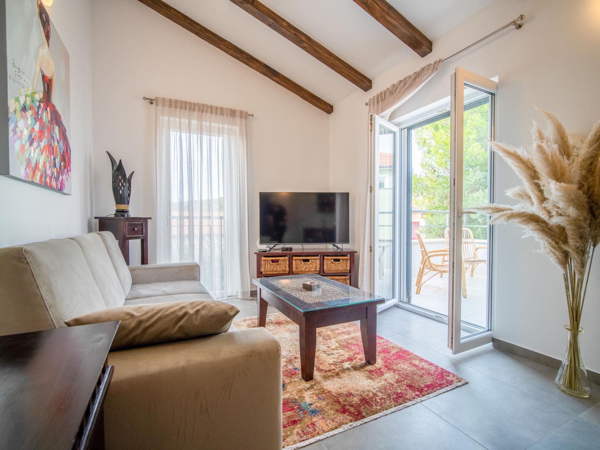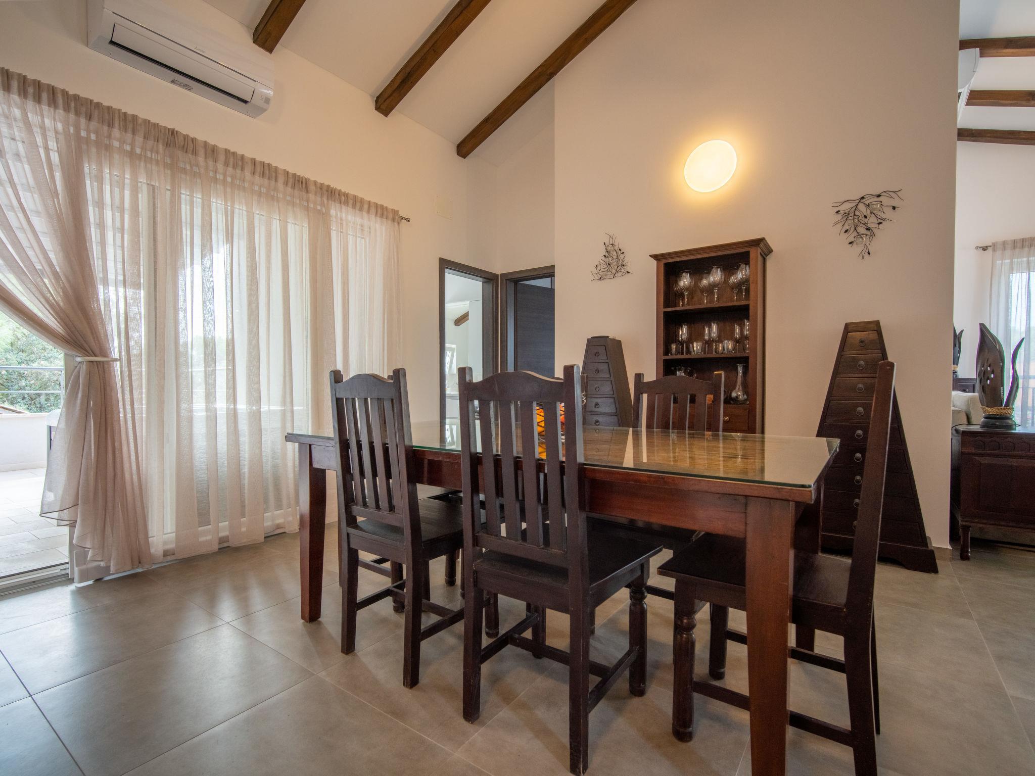 4-Zimmer-Wohnung 100 m2 im 1. Stock. Wohn-/Esszimmer mit Kabel-TV, Klimaanlage und Ventilator. Ausgang zur Terrasse. 2 Zimmer, jedes Zimmer mit 1 franz. Bett (160 cm, Länge 200 cm), Ventilator. 1 Zimmer mit 2 Betten (90 cm, Länge 200 cm), Ventilator. Offene Küche (Backofen, Geschirrspüler, 4 Glaskeramikplatten, Wasserkocher, Mikrowelle, Tiefkühler, elektrische Kaffeemaschine) mit Klimaanlage. Ausgang zum Balkon. Dusche/Bidet/WC, sep. WC. Heizung. Heizung nur verfügbar von 01.10. bis 01.05. Balkon 6 m2, Terrasse 12 m2, überdacht. Terrassenmöbel. Zur Verfügung: Waschmaschine, Wäschetrockner, Safe, Fliegengitter, Kinderhochstuhl, Babybett, Haartrockner. Internet (Wireless LAN, gratis).
