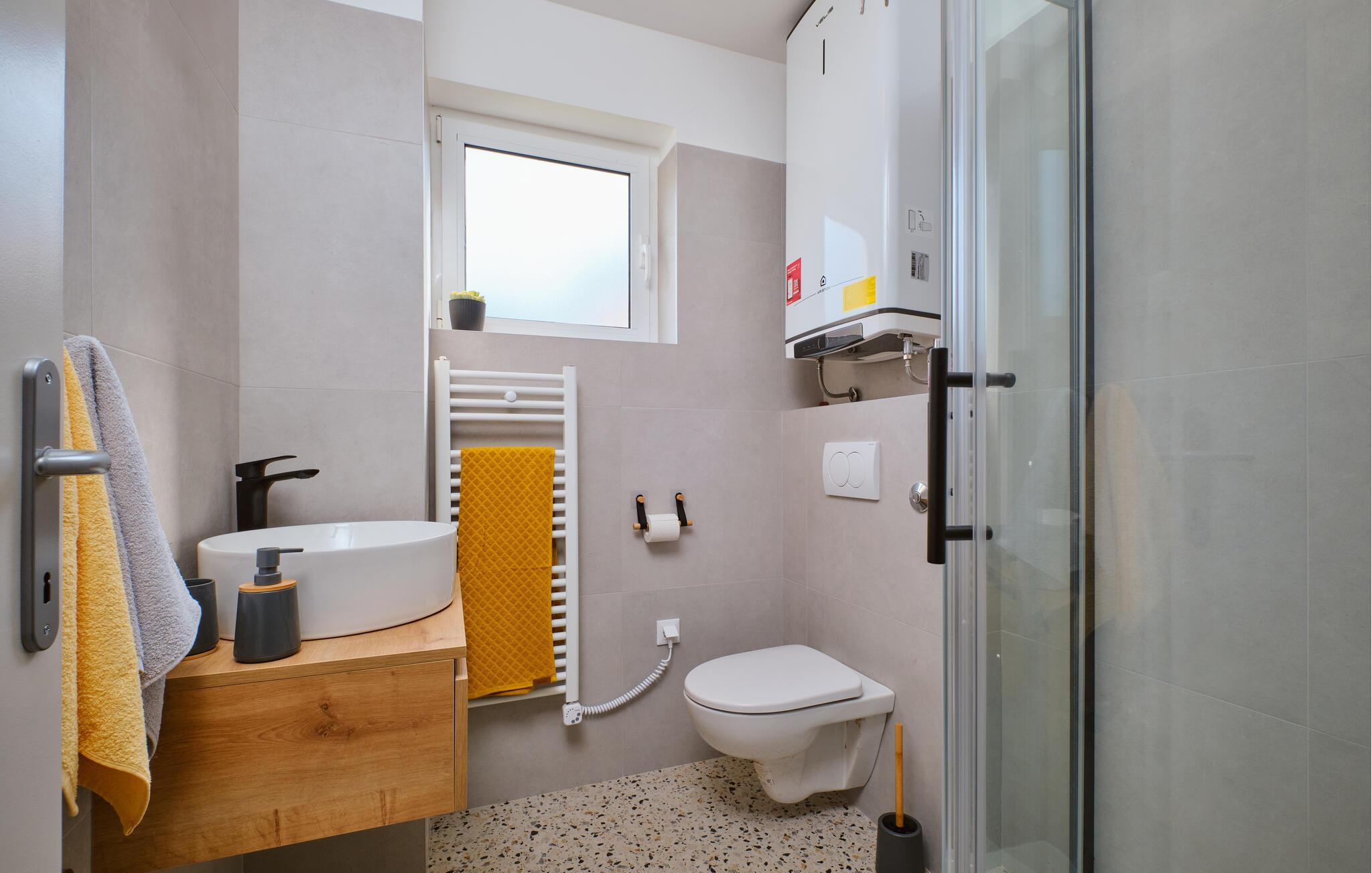 Badezimmer 4m2 (nr. 1) - WC. Warmes und kaltes Wasser. Dusche