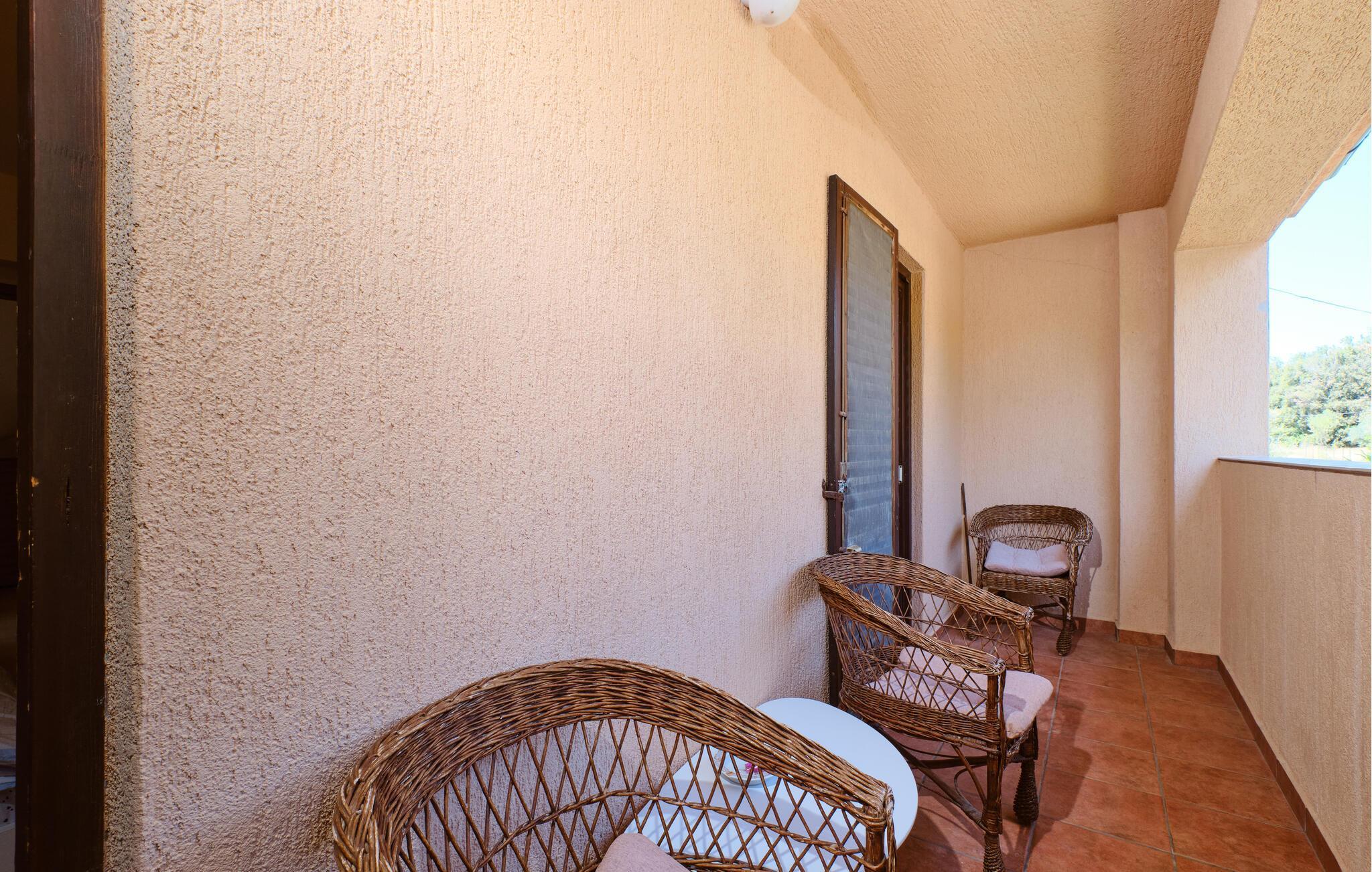 Gleich mehrere Terrassen laden Sie zu einem Frühstück oder einem Glas Wein nach draußen ein. Lauschen Sie dem Zirpen der Grillen und spazieren Sie zum nahegelegenen Kiesstrand, wann immer Ihnen nach einer Erfrischung im Meer ist.