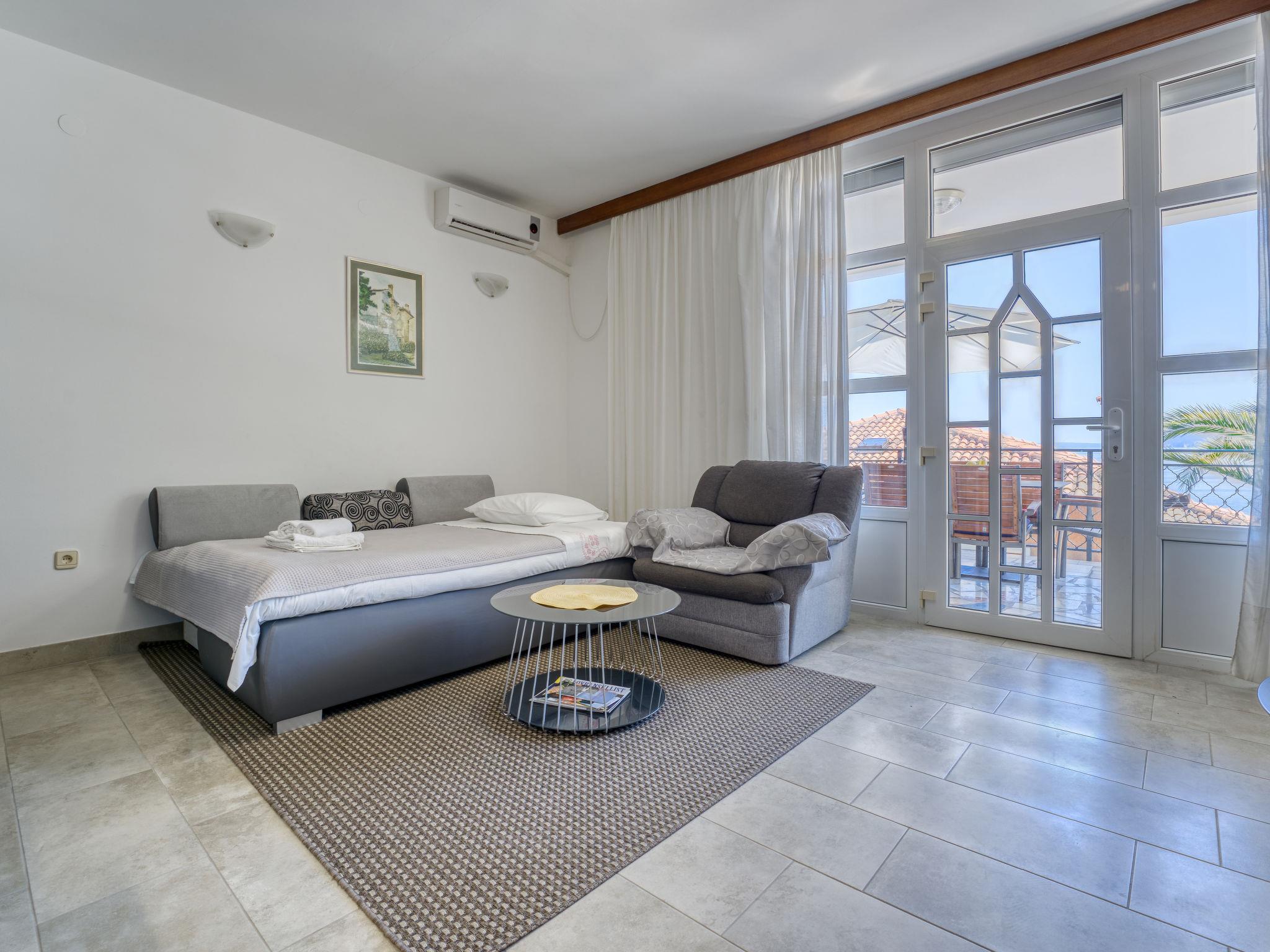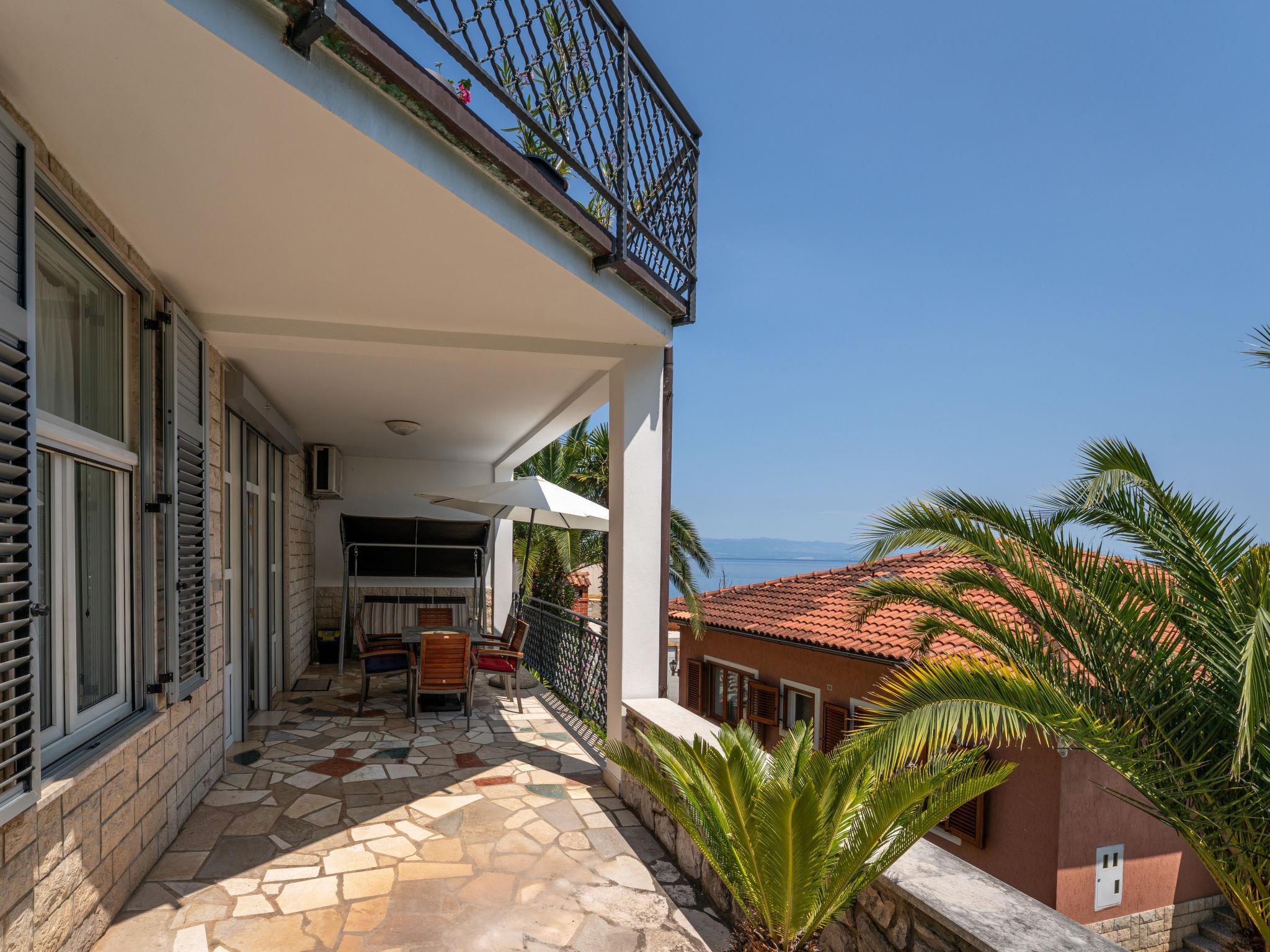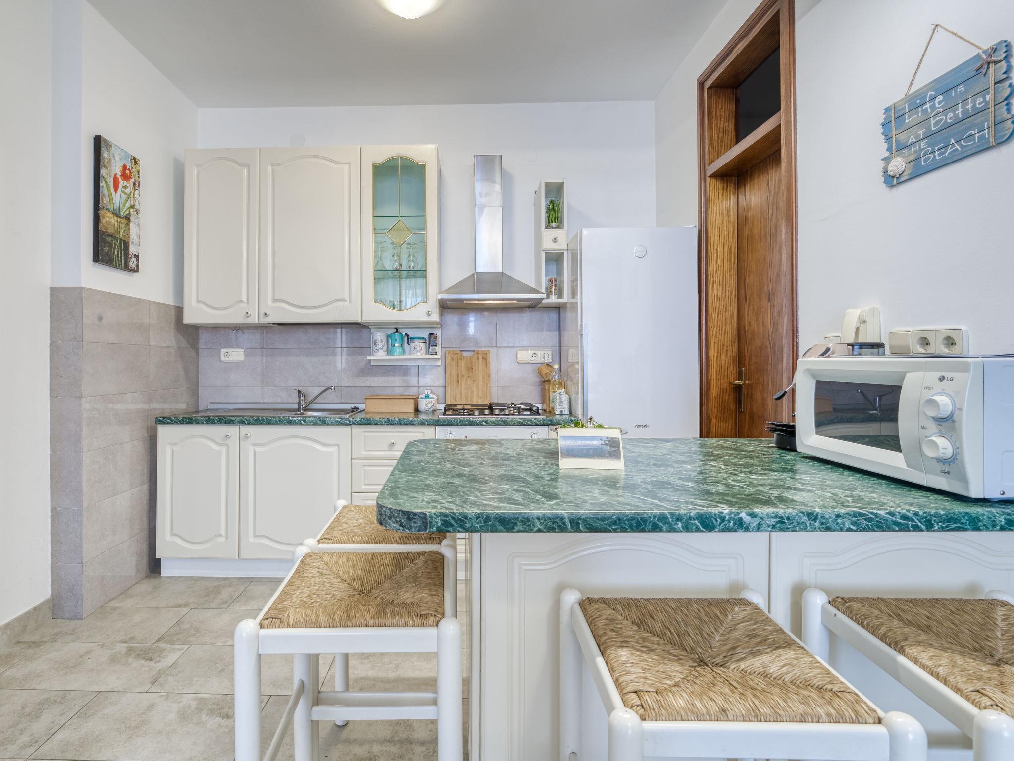 2-Zimmer-Wohnung 60 m2, im Erdgeschoss. Wohn-/Esszimmer mit 1 Doppeldiwanbett (155 cm, Länge 200 cm), Kabel-TV (Flachbildschirm), Klimaanlage. Ausgang zur Terrasse. 1 Zimmer mit 1 franz. Bett (160 cm, Länge 200 cm). Offene Küche (1 Kochplatte, Backofen, 3 Flammen, Toaster, Wasserkocher, Mikrowelle, Tiefkühler, elektrische Kaffeemaschine). Dusche/WC. Keine Heizmöglichkeit. Terrasse 15 m2. Terrassenmöbel. Schöne Panoramasicht auf das Meer. Zur Verfügung: Waschmaschine. Internet (WLAN, gratis). Garage (1 Auto). Bitte beachten: Nichtraucher-Haus. Eigener Eingang.