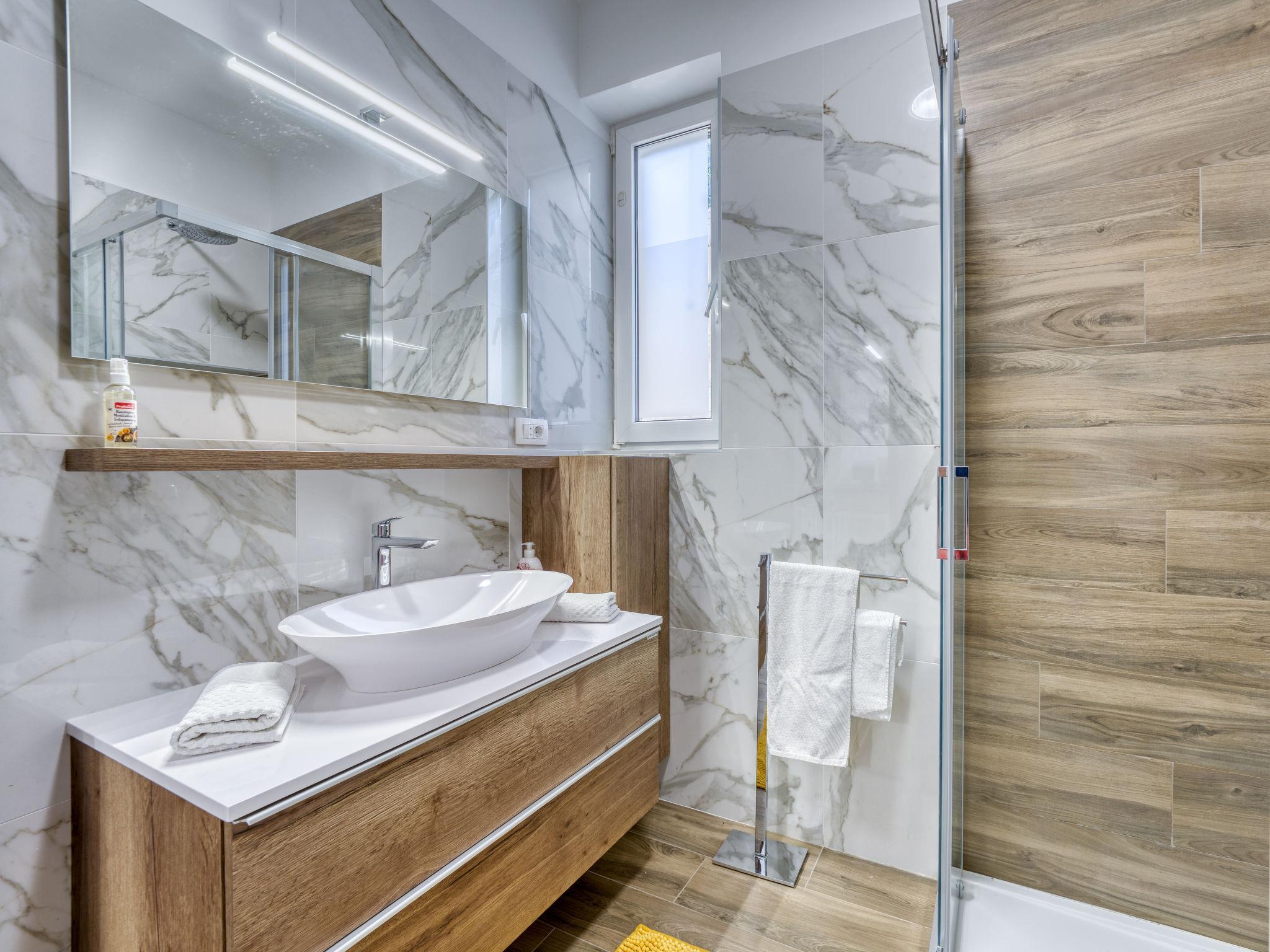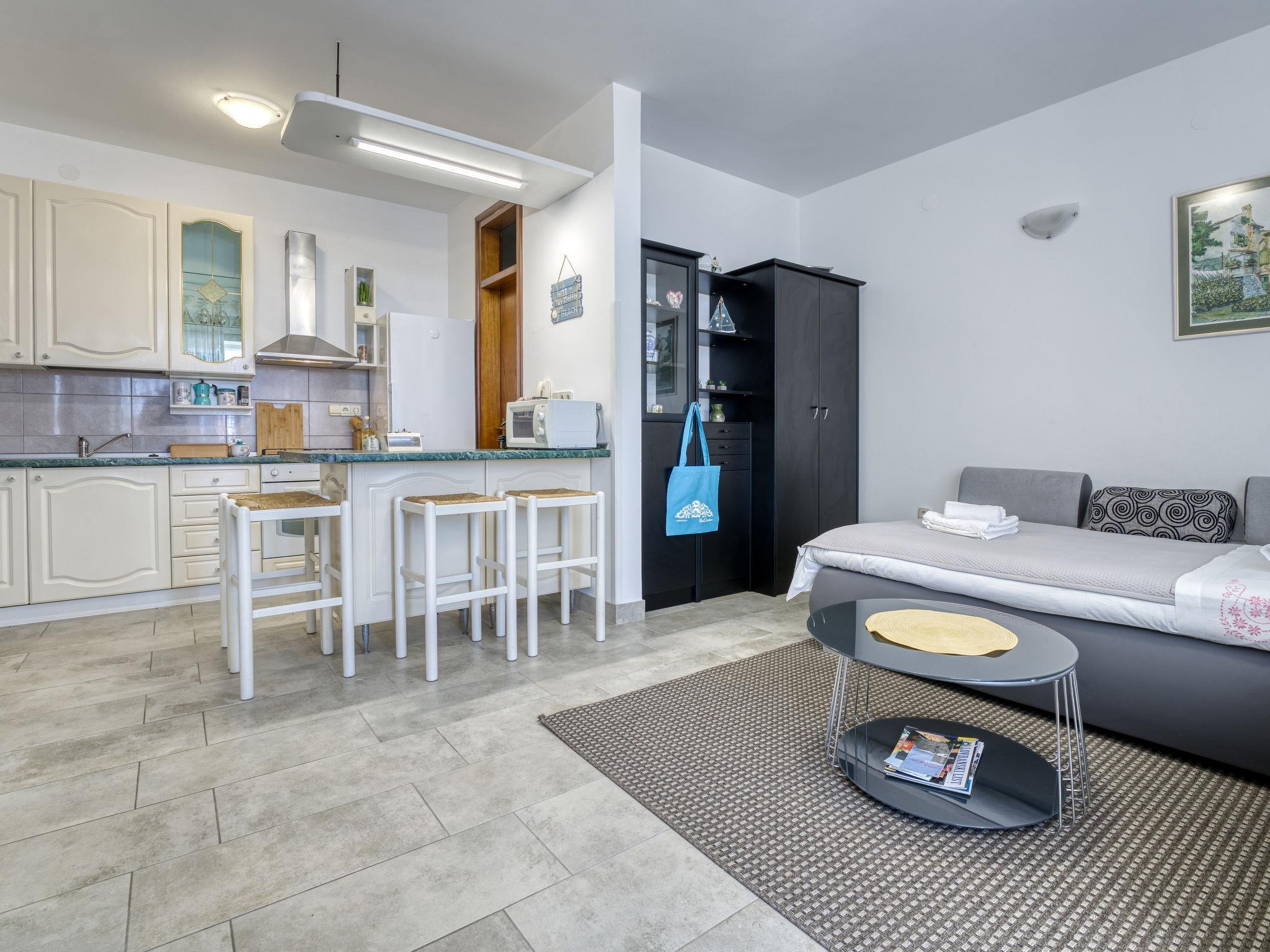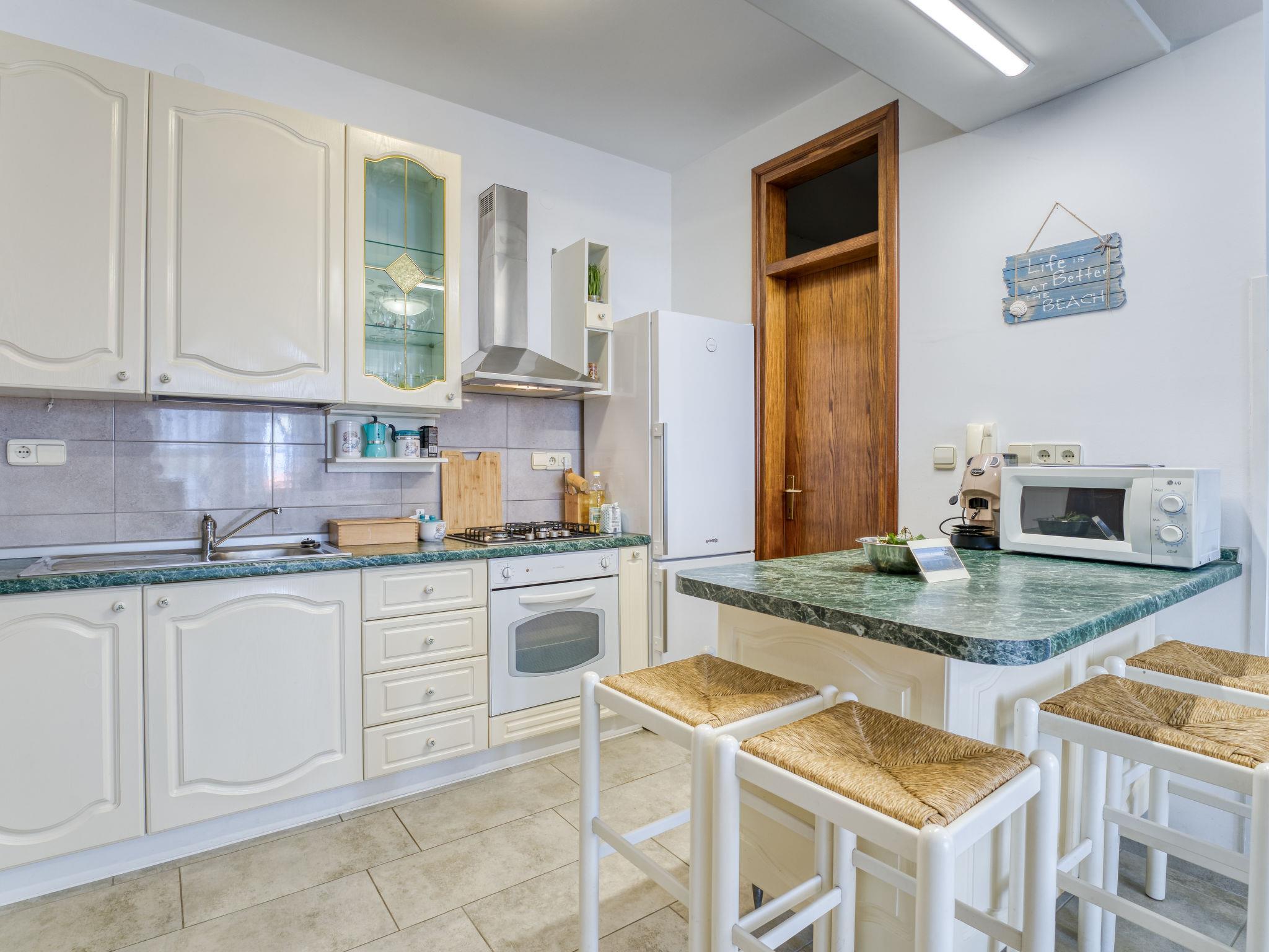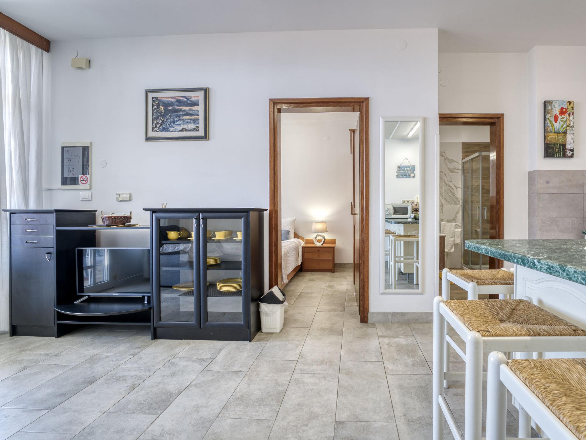 2-Zimmer-Wohnung 60 m2, im Erdgeschoss. Wohn-/Esszimmer mit 1 Doppeldiwanbett (155 cm, Länge 200 cm), Kabel-TV (Flachbildschirm), Klimaanlage. Ausgang zur Terrasse. 1 Zimmer mit 1 franz. Bett (160 cm, Länge 200 cm). Offene Küche (1 Kochplatte, Backofen, 3 Flammen, Toaster, Wasserkocher, Mikrowelle, Tiefkühler, elektrische Kaffeemaschine). Dusche/WC. Keine Heizmöglichkeit. Terrasse 15 m2. Terrassenmöbel. Schöne Panoramasicht auf das Meer. Zur Verfügung: Waschmaschine. Internet (WLAN, gratis). Garage (1 Auto). Bitte beachten: Nichtraucher-Haus. Eigener Eingang.