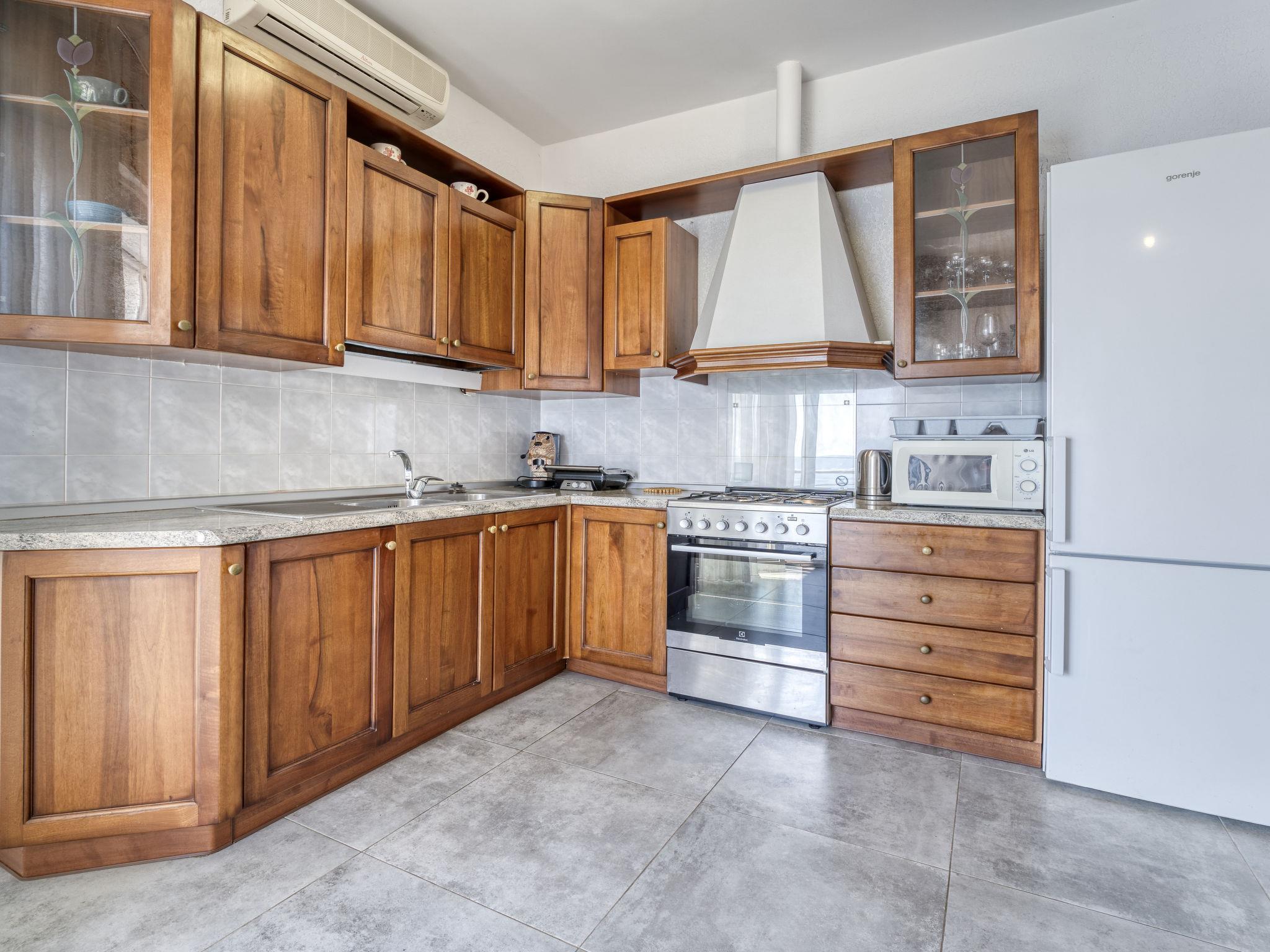 4-Zimmer-Wohnung 90 m2 im 1. Stock. Wohn-/Esszimmer mit Kabel-TV (Flachbildschirm), Klimaanlage. Ausgang zum Balkon. 2 Zimmer, jedes Zimmer mit 1 franz. Bett (160 cm, Länge 200 cm). 1 Zimmer mit 2 Betten (90 cm, Länge 200 cm). Offene Küche (1 Kochplatte, Backofen, 3 Flammen, Toaster, Wasserkocher, Mikrowelle, Tiefkühler, elektrische Kaffeemaschine). Dusche/WC. Keine Heizmöglichkeit. Balkon 25 m2. Balkonmöbel. Herrliche Panoramasicht auf das Meer. Zur Verfügung: Waschmaschine. Internet (WLAN, gratis). Garage (1 Auto). Bitte beachten: Nichtraucher-Haus.