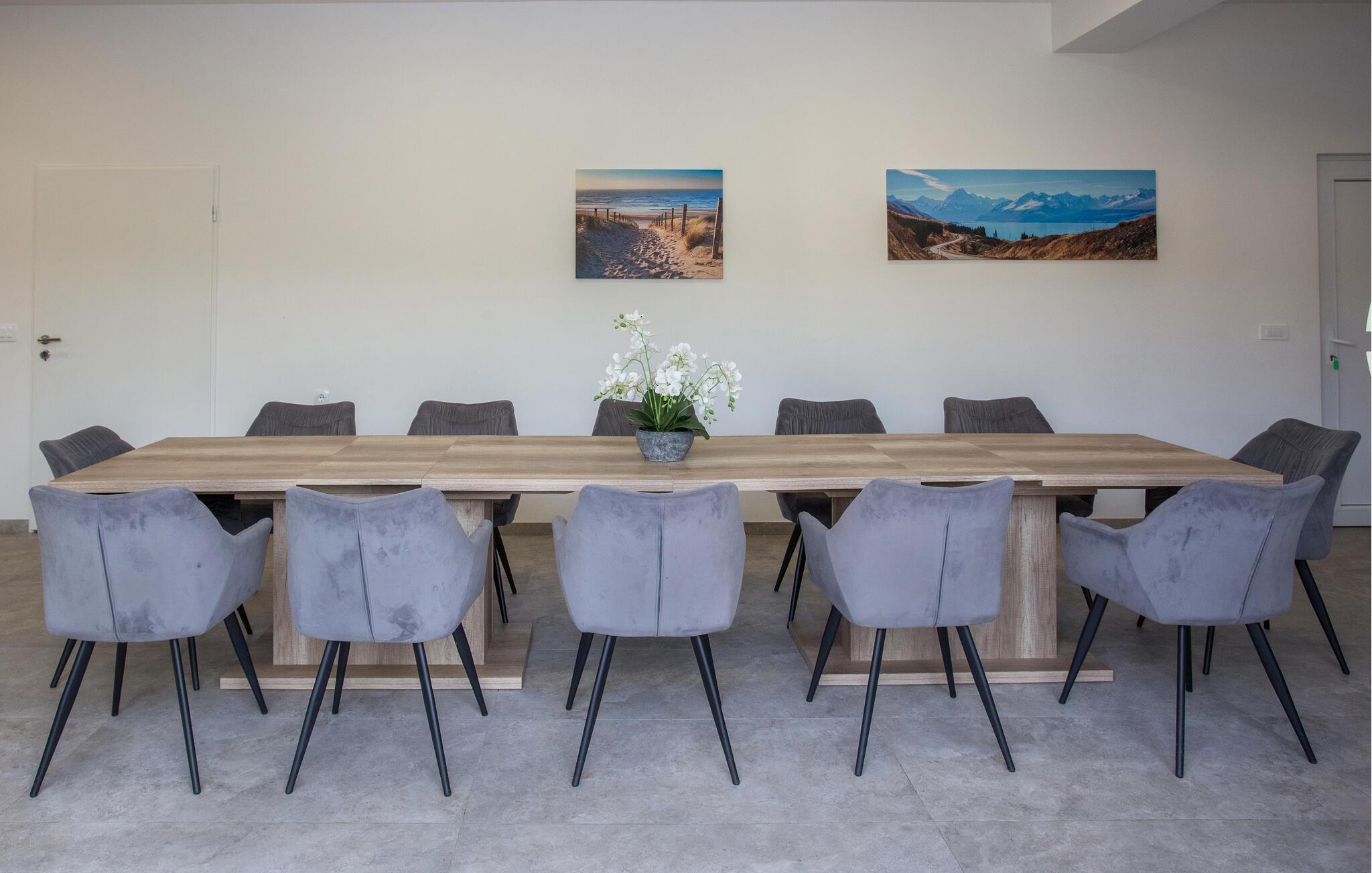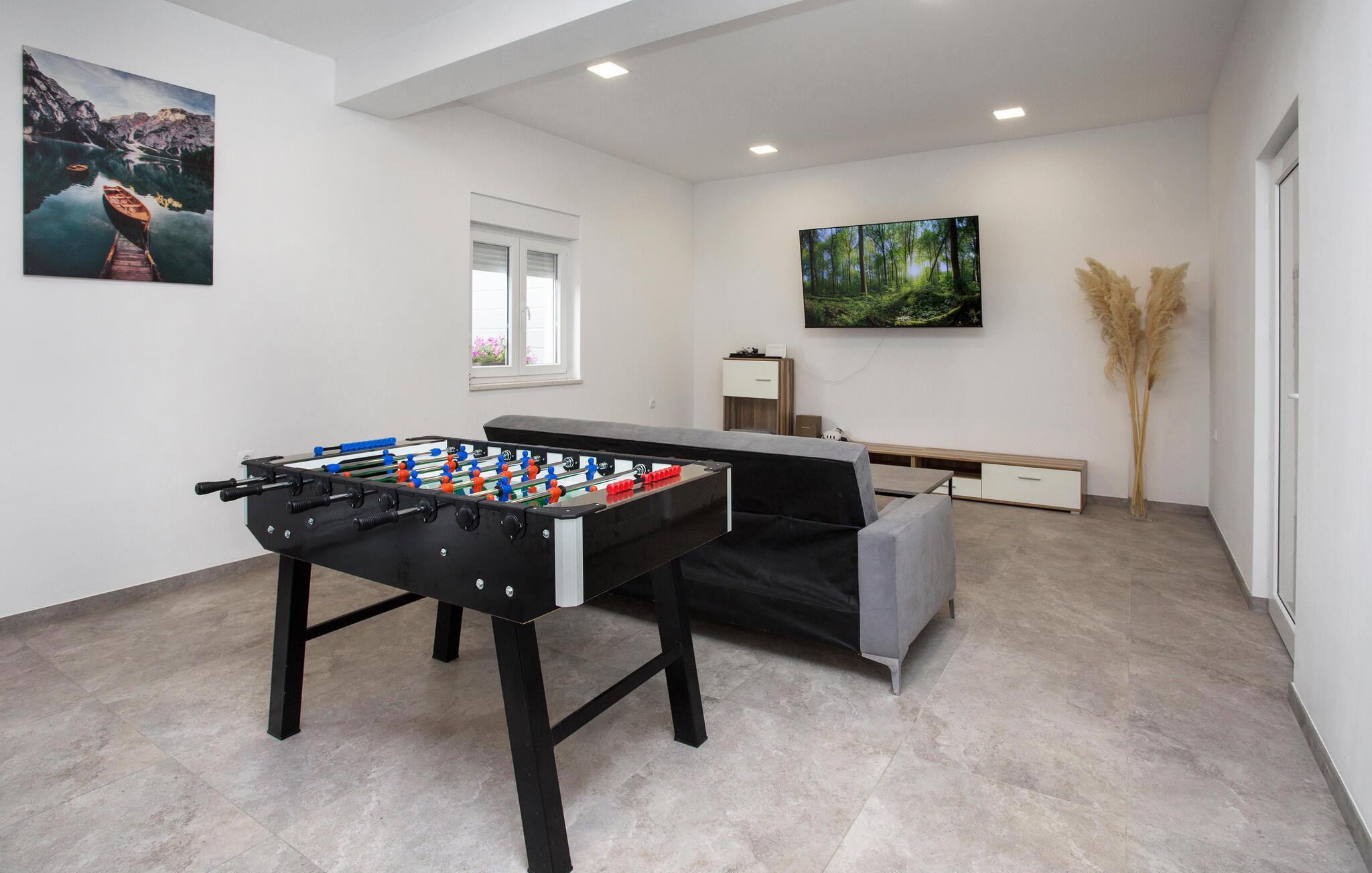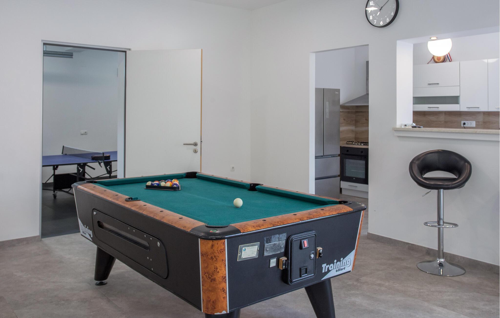 Dieses schöne, dreistöckige Ferienhaus befindet sich in Glavni Donja, nicht weit von Imotski entfernt. Es ist geräumig und geschmackvoll eingerichtet und eignet sich ideal für einen Urlaub mit mehreren Familien oder Gruppen von Freunden. Unterhalten Sie sich im Aktivitätsraum beim Dart oder Tischtennis oder spielen Sie eine Runde Billard - hier wird Ihnen nicht langweilig.