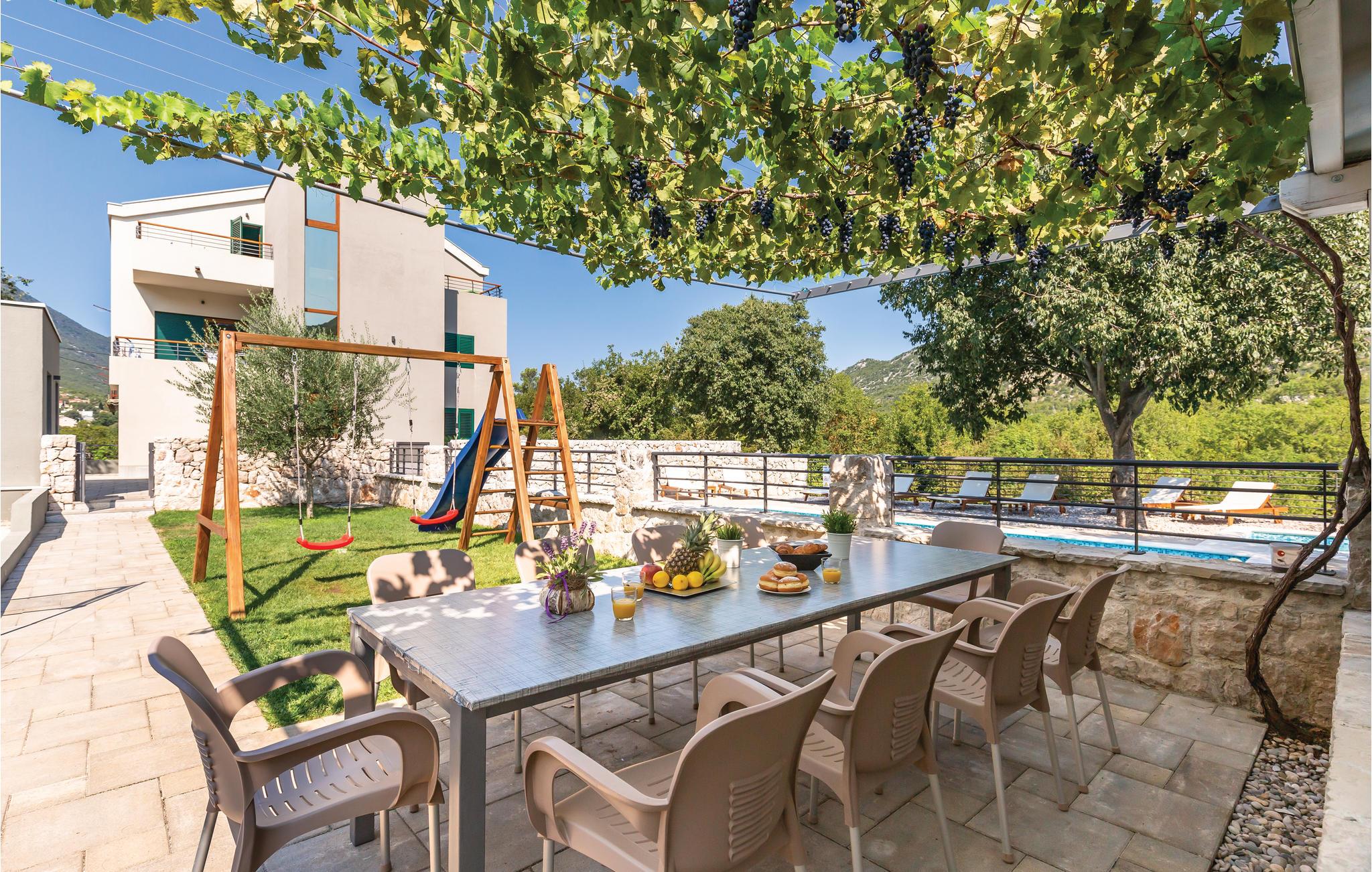 Im Inneren von Dalmatien, im nördlichen Teil des Naturparks Biokovo, befindet sich dieses schön eingerichtete und gut ausgestattete Ferienhaus. Es besteht aus vier separaten Wohneinheiten. Die Wohneinheiten im Erdgeschoss verfügt über einen separaten Eingang, während die Wohneinheiten auf der ersten und zweiten Etage über eine Innentreppen miteinander verbunden sind. Auf dem gepflegten Grundstück befindet sich ein großer Pool, wo Sie sich erfrischen können, während Sie auf dem Grill in der Außenküche verschieden leckere Gerichte zubereiten können. Der Aktivitätsraum, Kinderspielplatz und Inhalte im Außenbereich sorgen für schöne Unterhaltung. Die schönen Strände der Makarska Riviera sind etwa 10 Fahrminuten entfernt.
