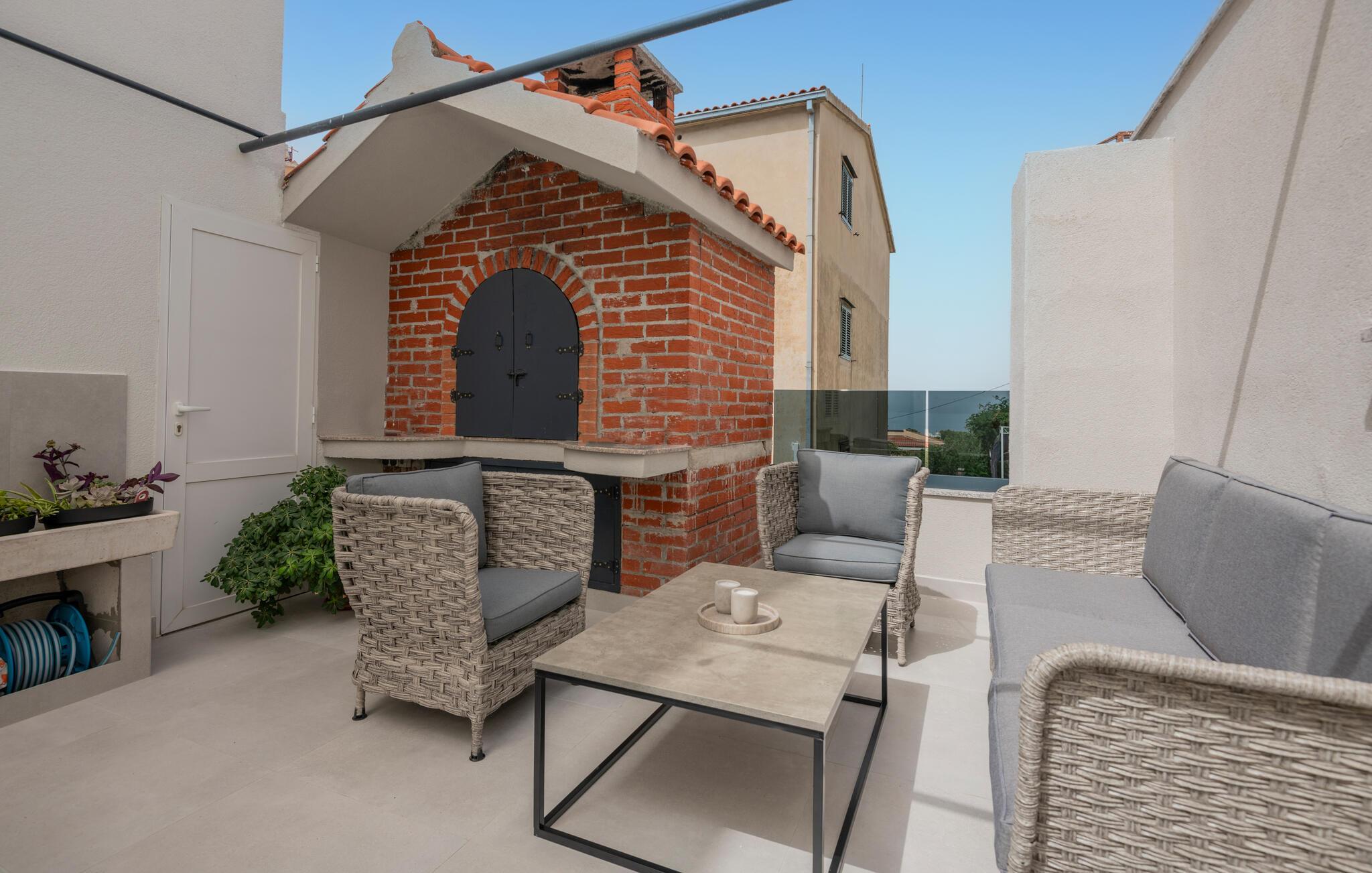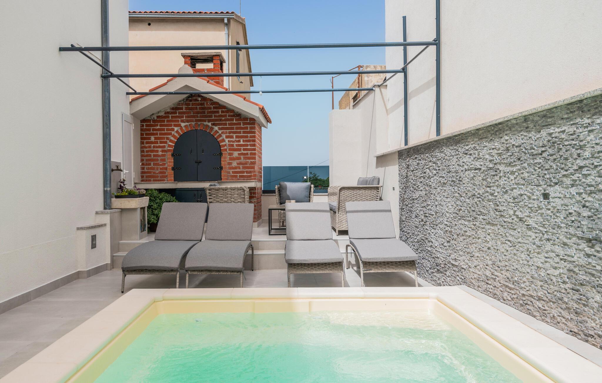 Mehrere Terrassen bieten den idealen Rahmen für schöne Stunden im Freien, am Haus lädt der gemeinsame Pool zu einem Sprung ins Wasser ein, natürlich können Sie hier auch im eigenen Bereich grillen.