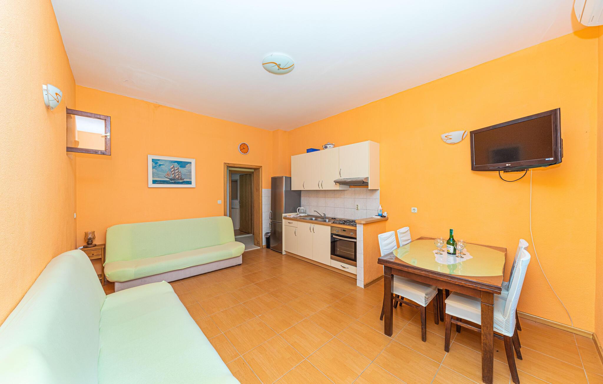 Diese farbenfrohe Erdgeschosswohnung bietet Ihnen als Paar oder kleine Familie ein gepflegtes Zuhause, während Sie im Küstenort Makarska fußläufig den Strand, Restaurants und gute Einkaufsmöglichkeiten erreichen. Servieren Sie sich am einladenden Esstisch kroatische Spezialitäten vom Markt, planen Sie hier Ihre Unternehmungen und streamen Sie nach einem langen Tag unter der mediterranen Sonne Ihre Lieblingsserie auf dem Sofa.