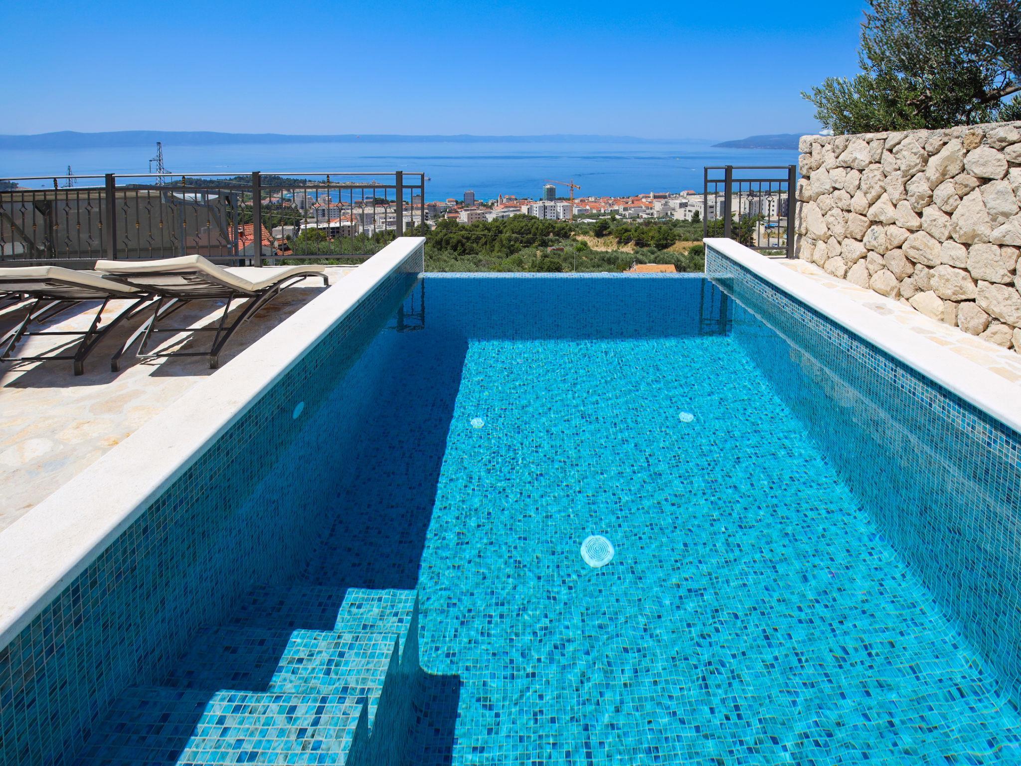 Einfamilienhaus "Bellevue", auf 2 Stockwerken. Oberhalb von Makarska, im Weiler Puharici, 1.5 km vom Zentrum von Makarska, ruhige, sonnige Lage am Hang, 1.5 km vom Meer, 1.5 km vom Strand. Zur Alleinbenutzung: Grundstück 400 m2, Schwimmbad eckig, beheizt (4 x 3 m, 150 cm tief, saisonale Verfügbarkeit: 01.Apr. - 31.Okt.) mit Innentreppe. Aussendusche, Sprudelbad, Terrasse (50 m2), Gartenmöbel, Grill, Poolpflege durch den Besitzer/Gärtner. Im Hause: Internetzugang, Waschmaschine. Parkplatz (für 2 Autos) beim Haus auf dem Grundstück. Einkaufsgeschäft, Restaurant 800 m, Bushaltestelle 3.6 km, Kieselstrand 1.5 km. Die Nachbarschaft ist sehr lärmempfindlich. Ruhe und gutes Benehmen wird erwartet. Erwärmung des Wassers im Schwimmbad (extra). Es ist notwendig, 7 Tage im Voraus anzukündigen, wenn die Poolheizung benötigt wird.