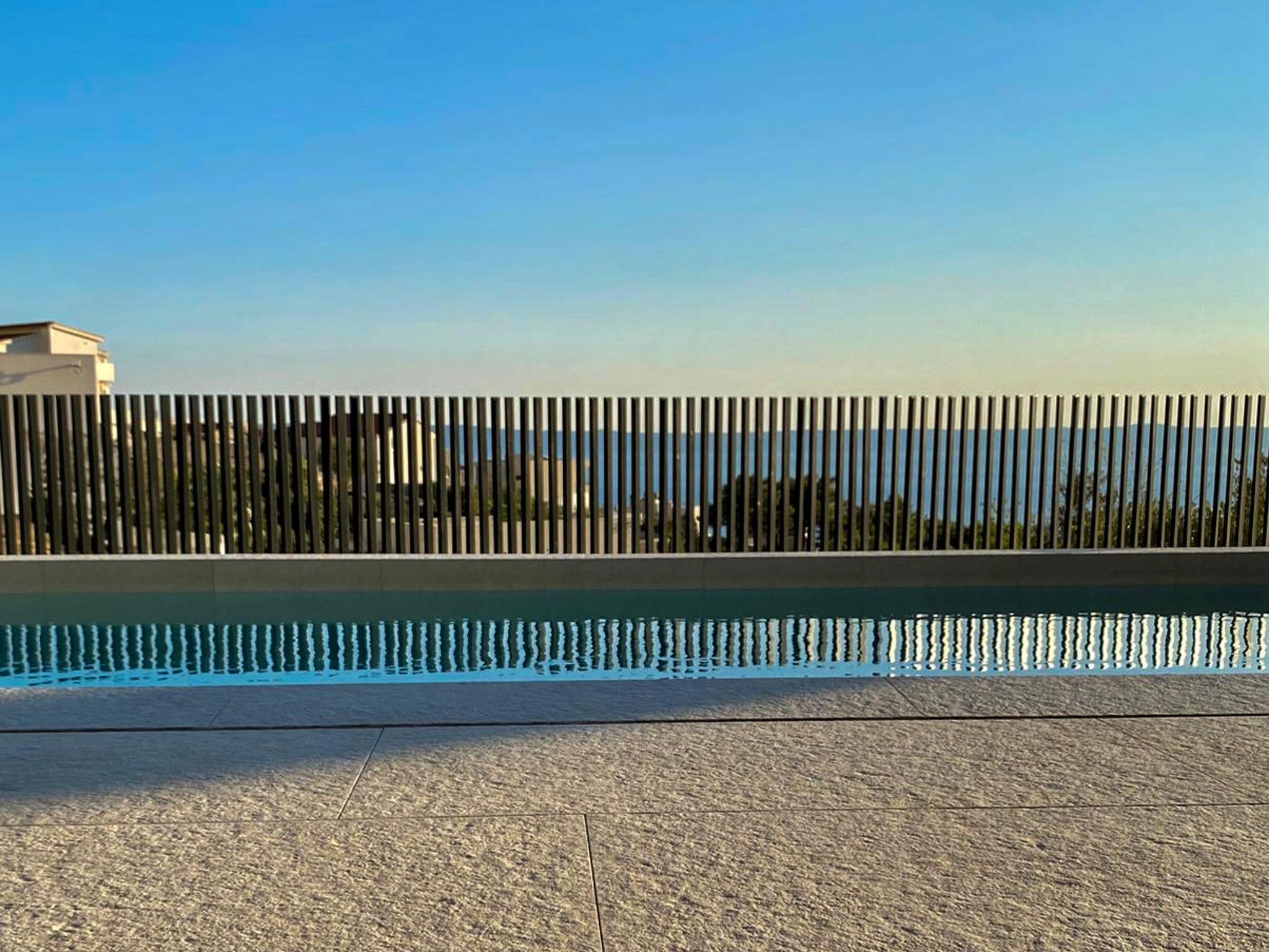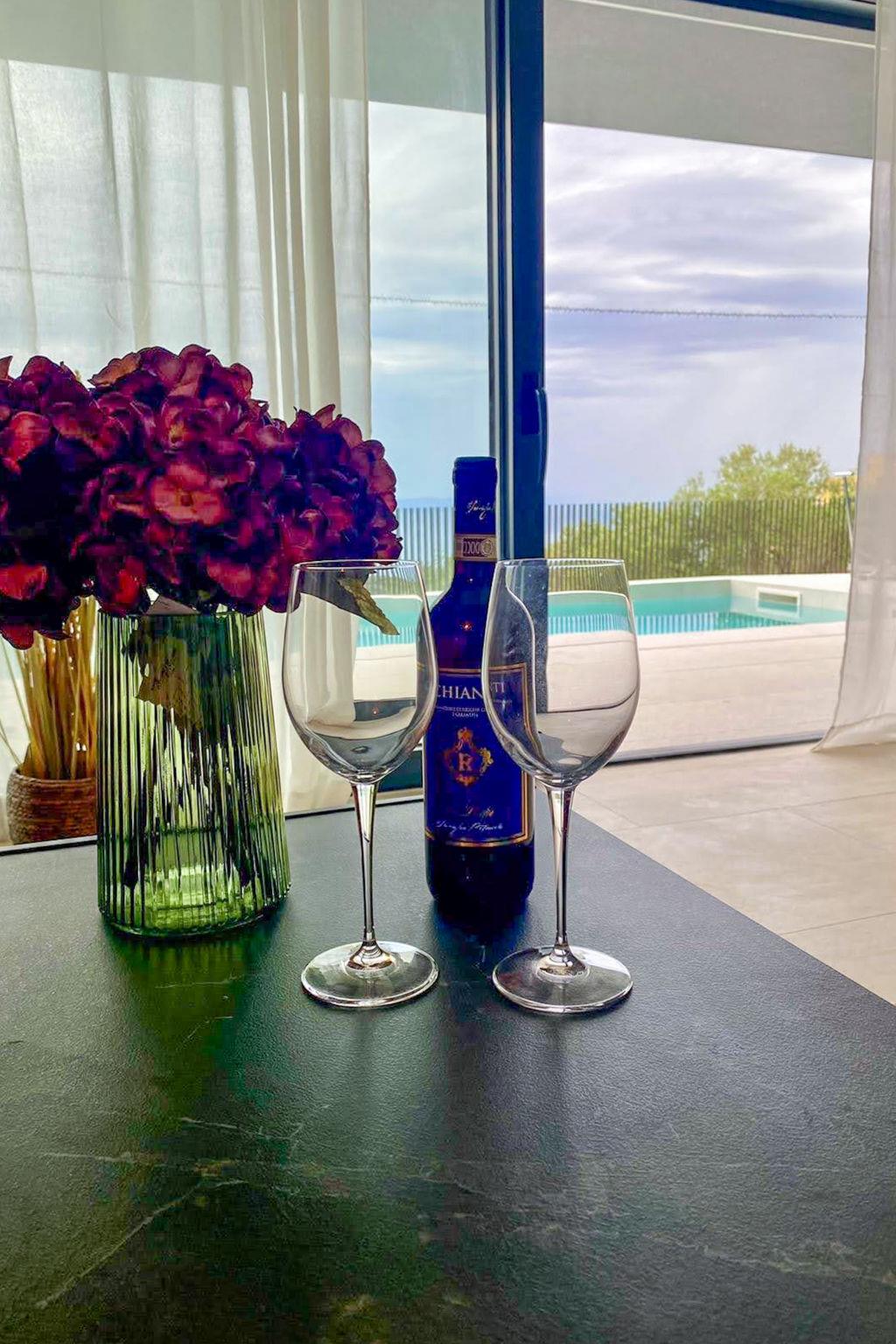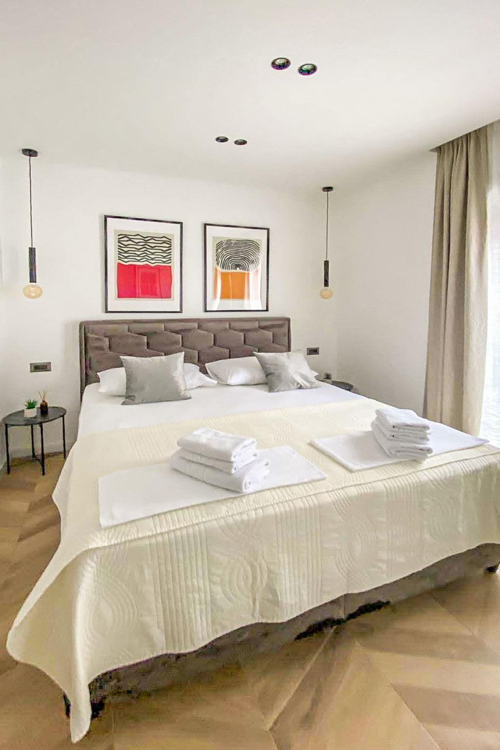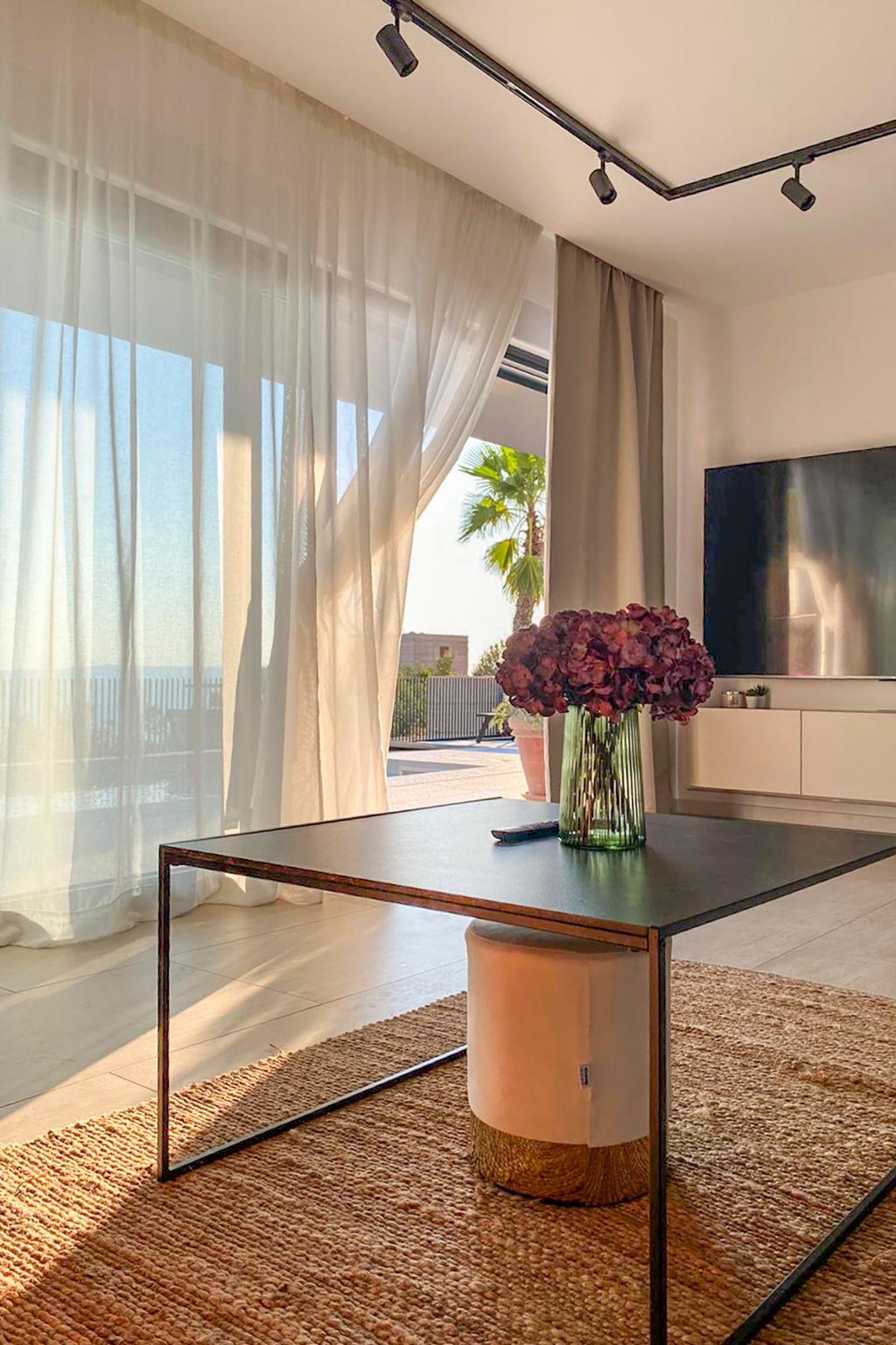 5-Zimmer-Wohnung 120 m2. Wohn-/Esszimmer mit Sat-TV und Klimaanlage. Ausgang zur Terrasse. 1 Zimmer mit 1 franz. Bett (180 cm, Länge 200 cm), Klimaanlage. Offene Küche (Backofen, Geschirrspüler, 4 Induktionskochplatten, Toaster, Wasserkocher, Mikrowelle, Tiefkühler, elektrische Kaffeemaschine). Ausgang zur Terrasse. Dusche/WC. Obergeschoss: 3 Zimmer, jedes Zimmer mit 1 franz. Bett (180 cm, Länge 200 cm), Klimaanlage. Ausgang zum Balkon. 2 Duschen/WC. Bodenheizung. Balkon 18 m2, grosse Terrasse 120 m2 teilweise überdacht. Liegestühle (4). Sehr schöne Panoramasicht auf das Meer. Zur Verfügung: Waschmaschine, Safe, Bügeleisen, Kinderhochstuhl, Babybett, Haartrockner. Internet (WLAN, gratis). Bitte beachten: Nichtraucher-Unterkunft.
