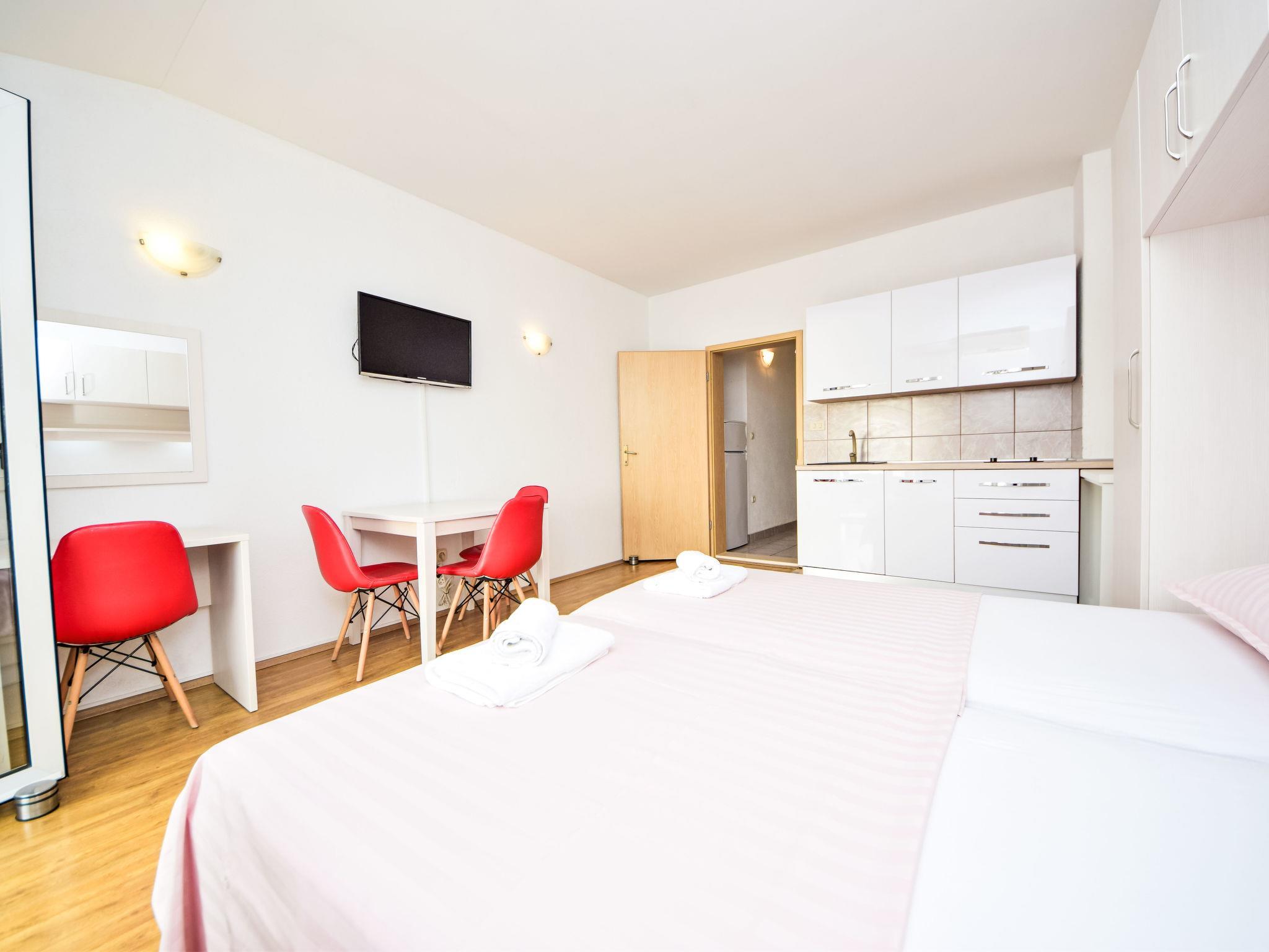 2-Zimmer-Wohnung 40 m2 im 2. Stock, Südlage. 1 Zimmer mit 1 Doppelbett (2 x 90 cm, Länge 200 cm), Esstisch, Küchenblock und Sat-TV (Flachbildschirm), Klimaanlage. Ausgang zum Balkon. 1 Zimmer mit 2 Betten (90 cm, Länge 200 cm). Dusche/WC. Balkon. Balkonmöbel. Sicht auf das Meer. Bitte beachten: eigener Eingang. 5792